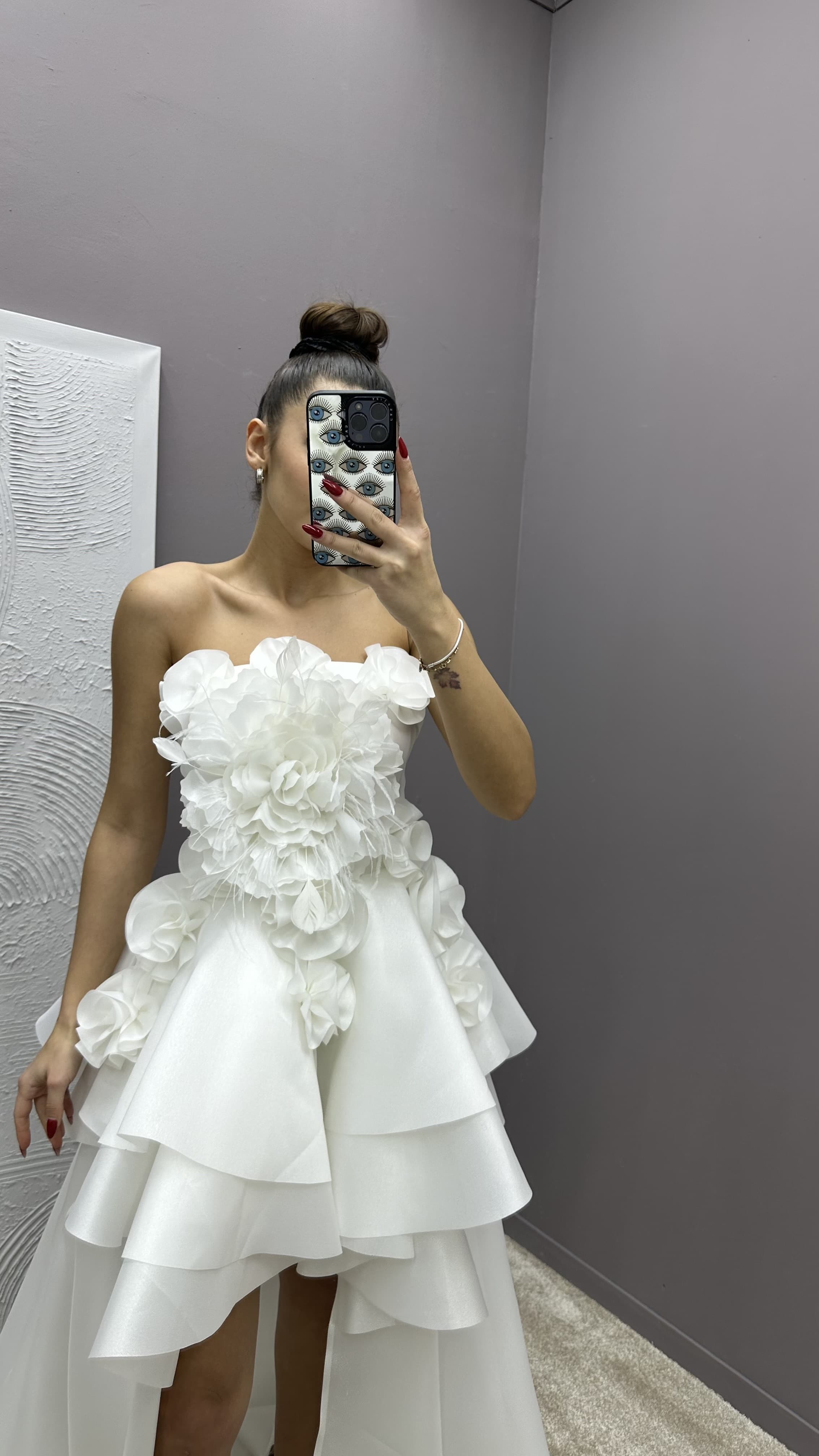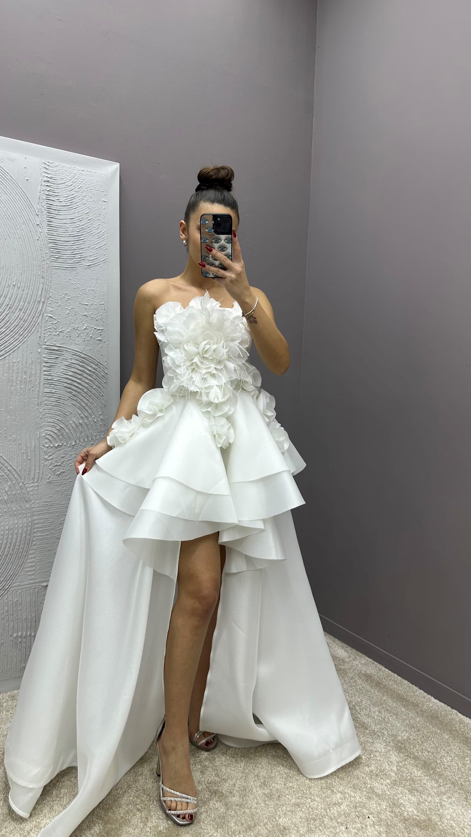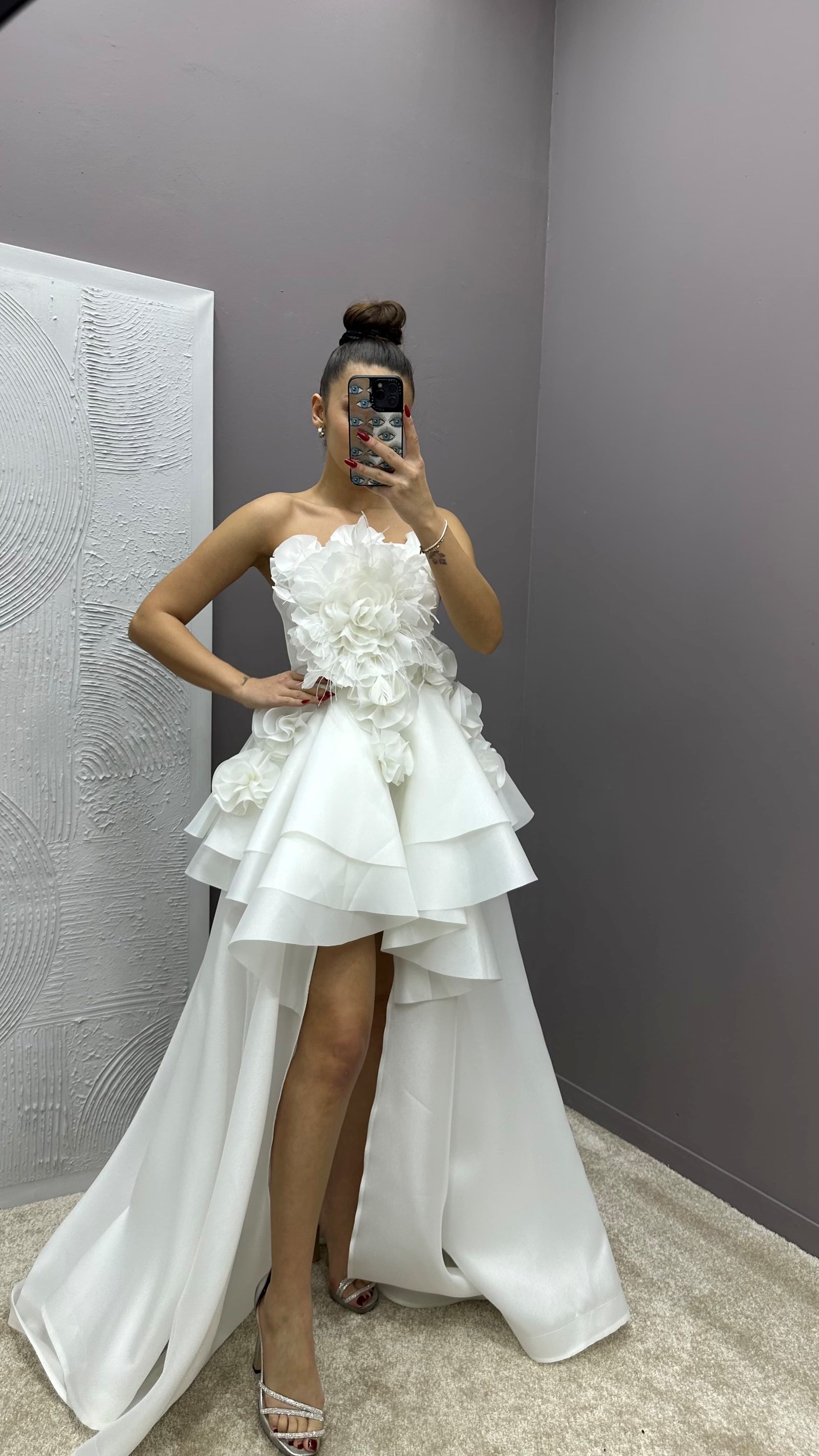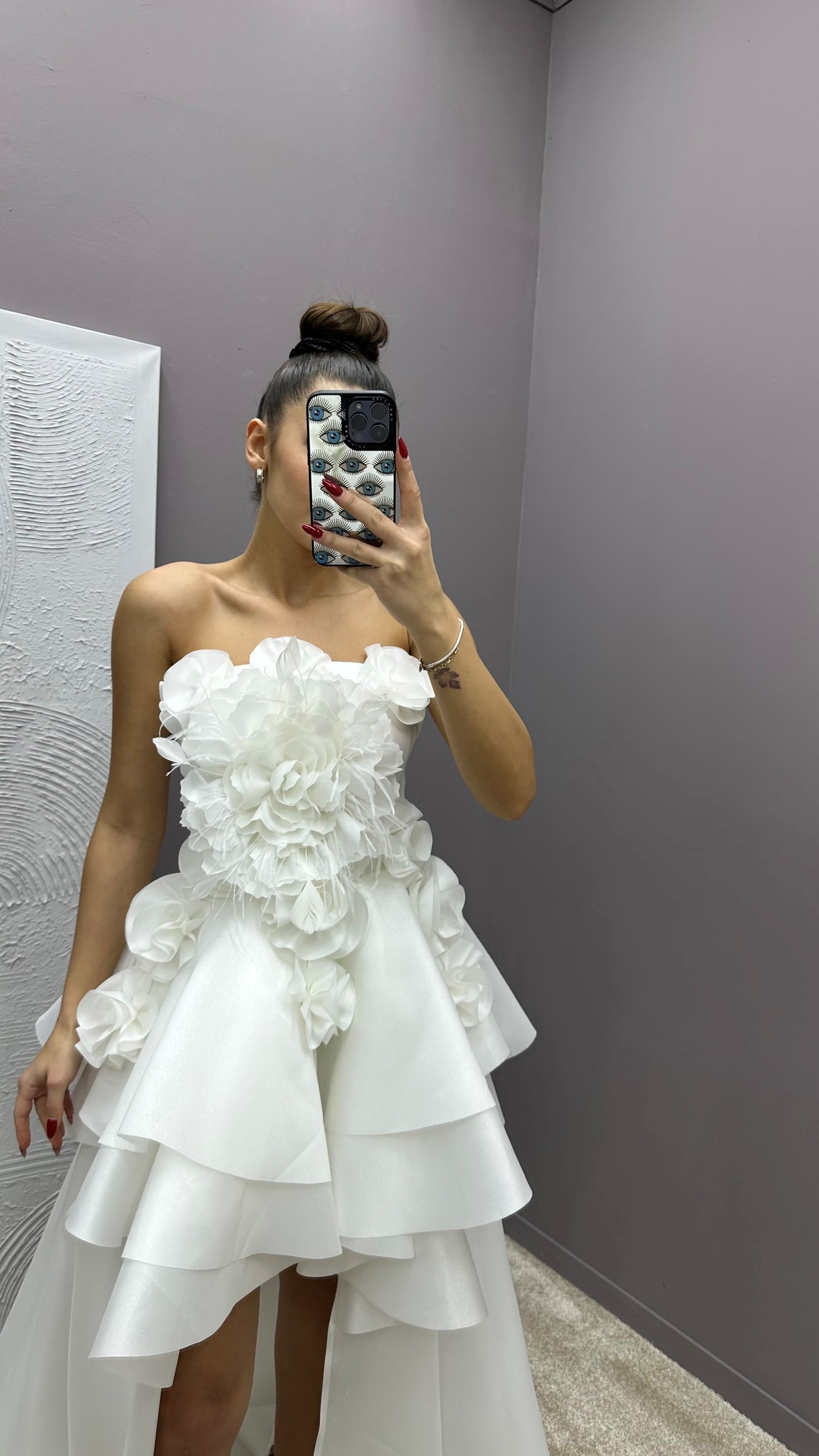 • Beyaz Straplez Tüy Detay Güllü Tasarım Abiye Elbise