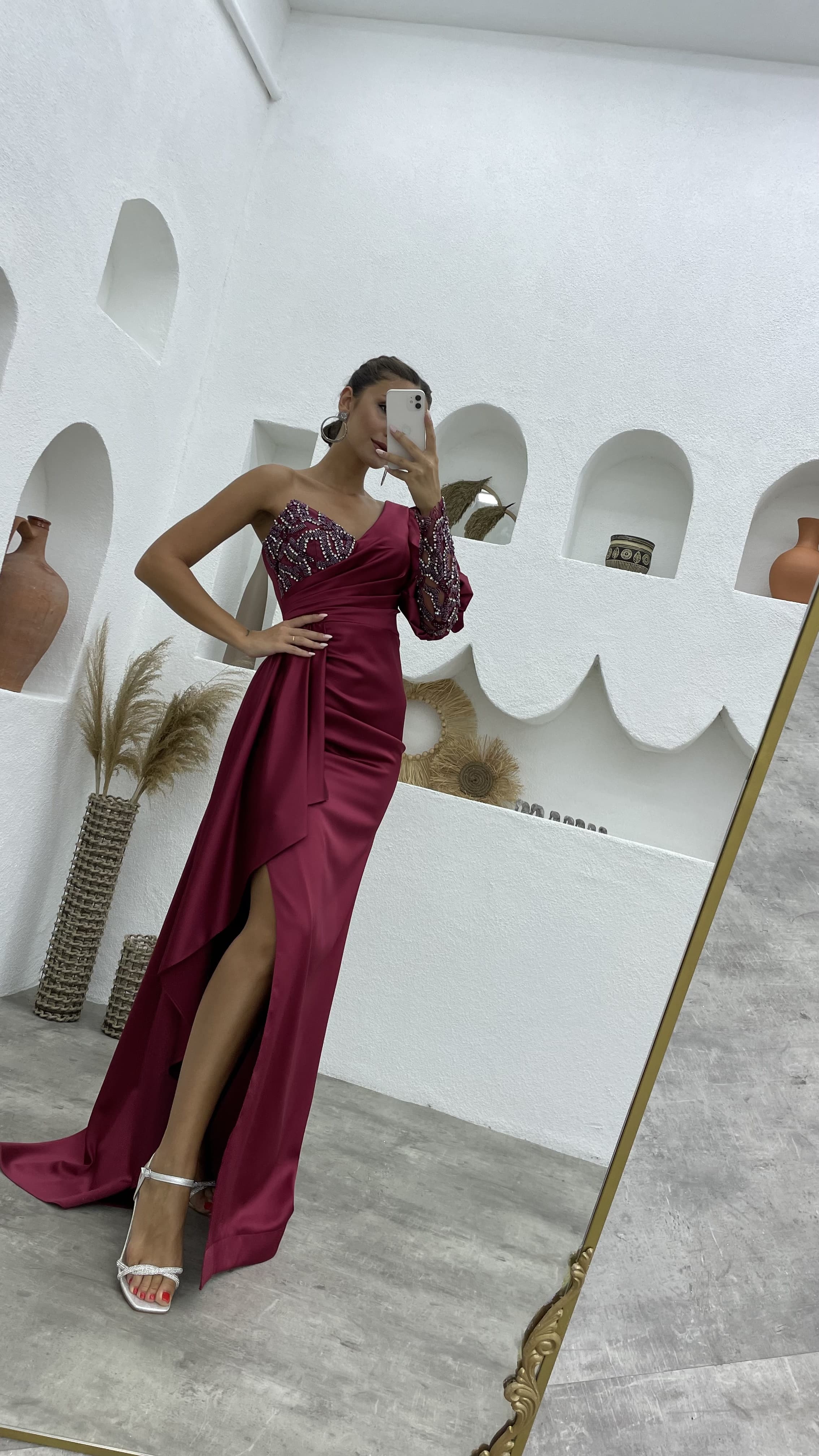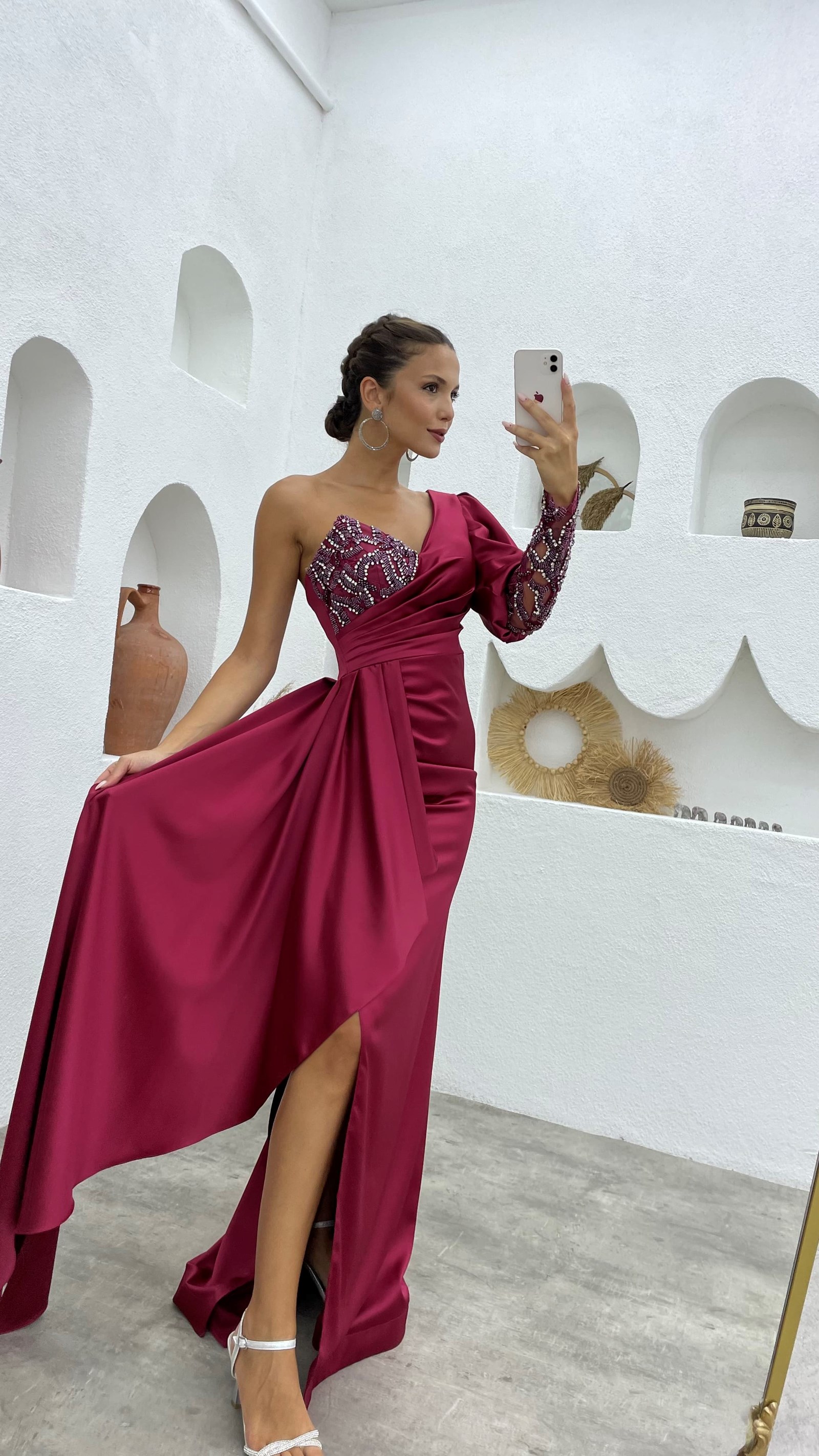 • Bordo Tek Kol Fırfırlı Saten Abiye Elbise