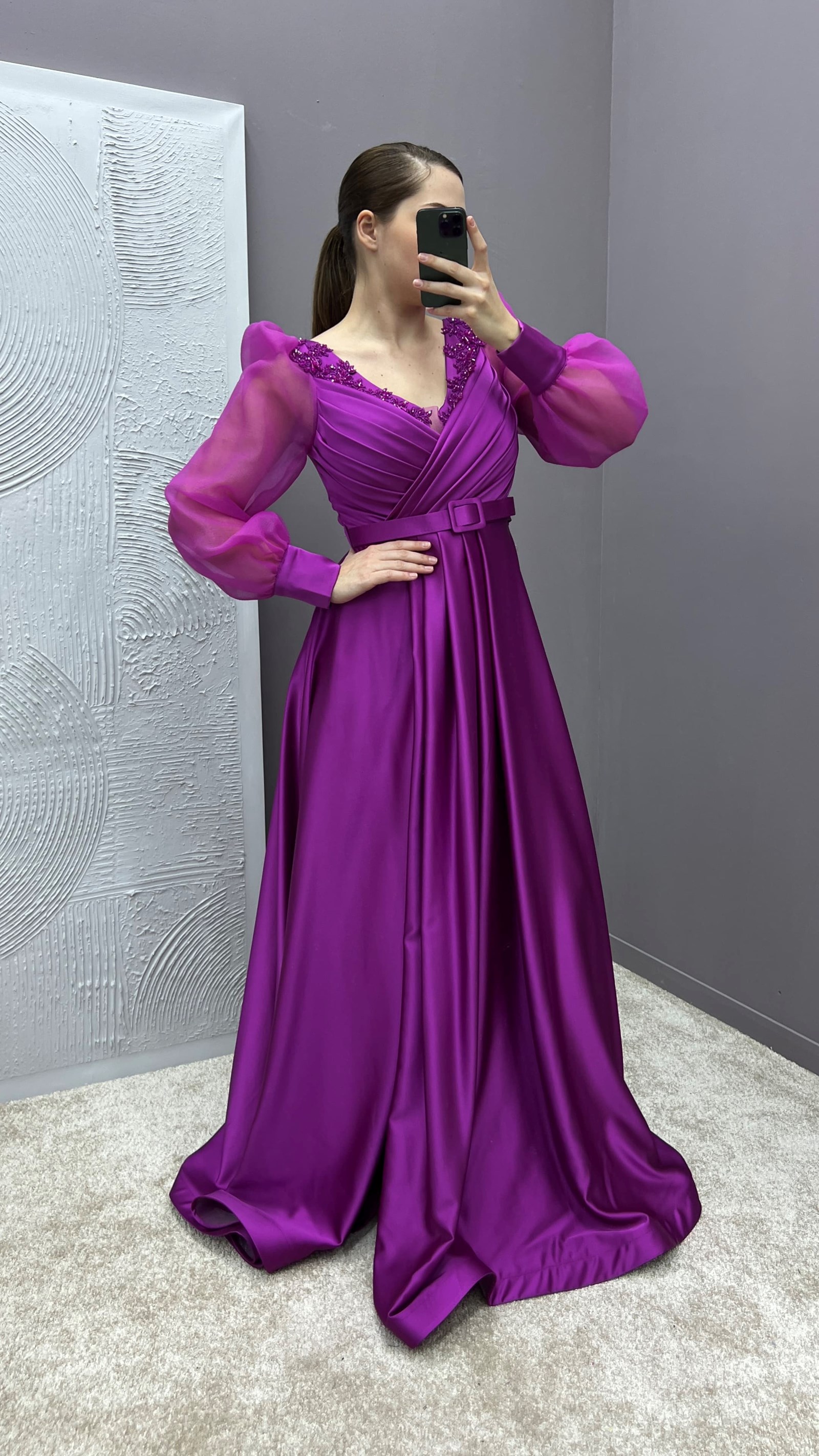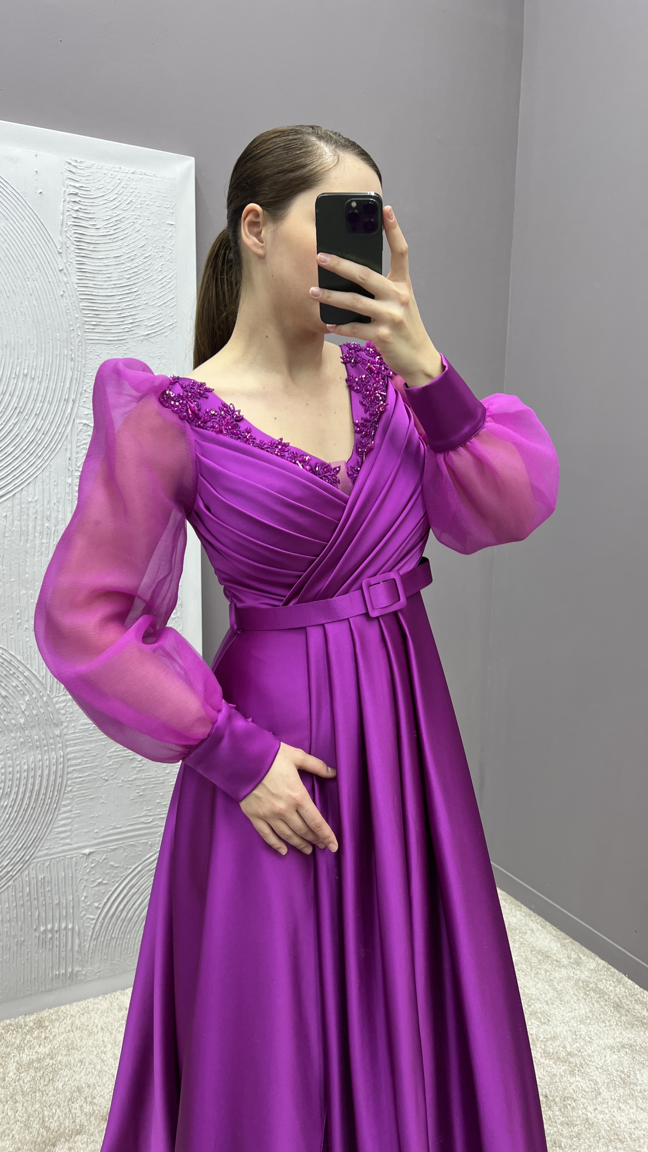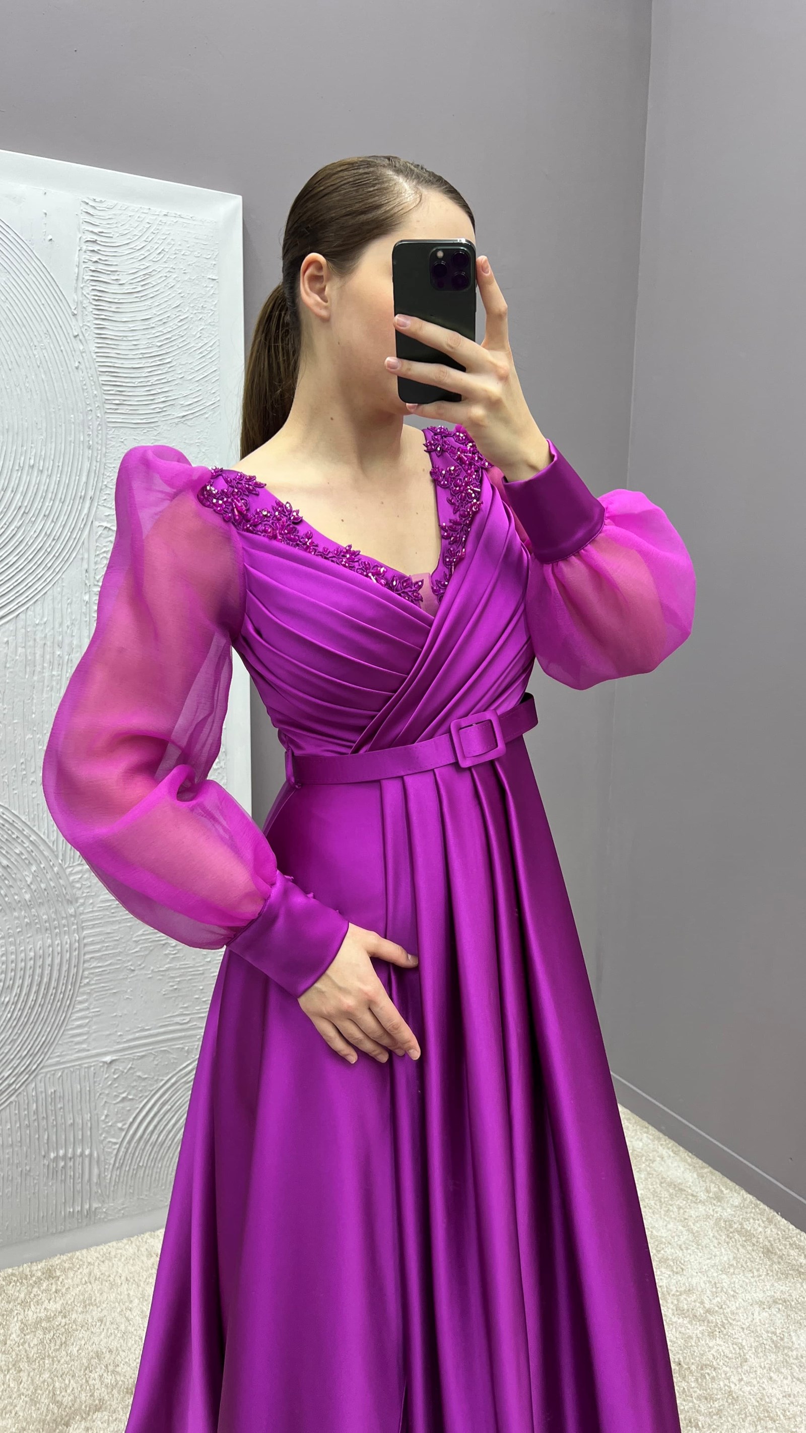 • Fuşya Drapeli Kolları Tül Tasarım Saten Büyük Beden Abiye Elbise