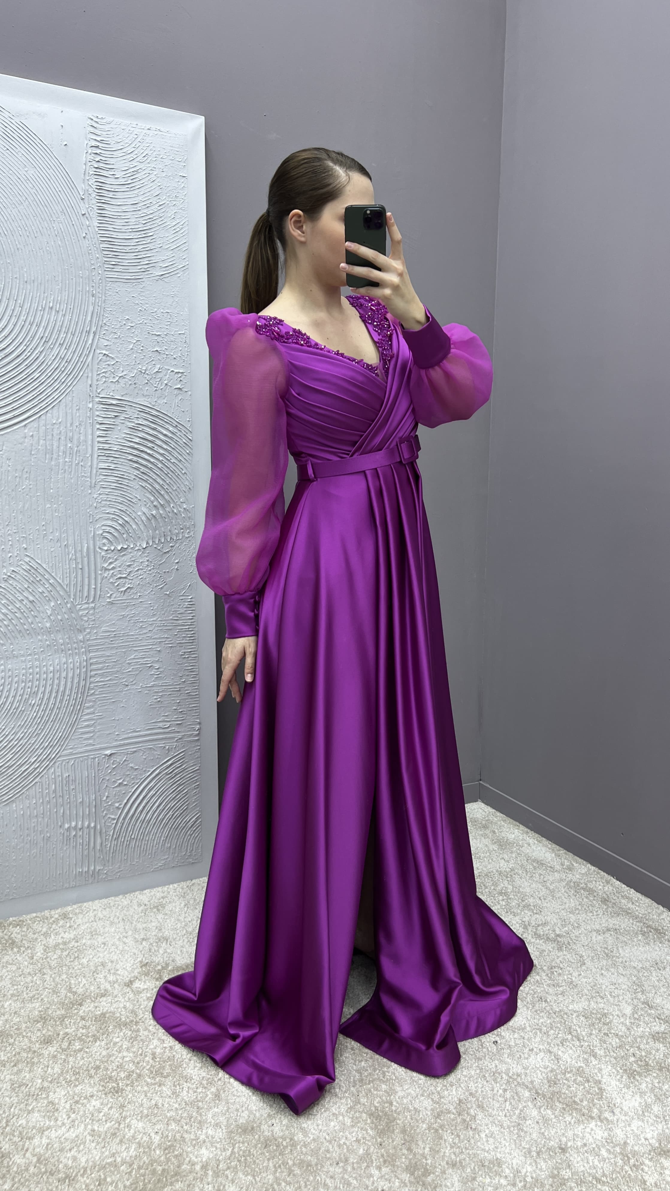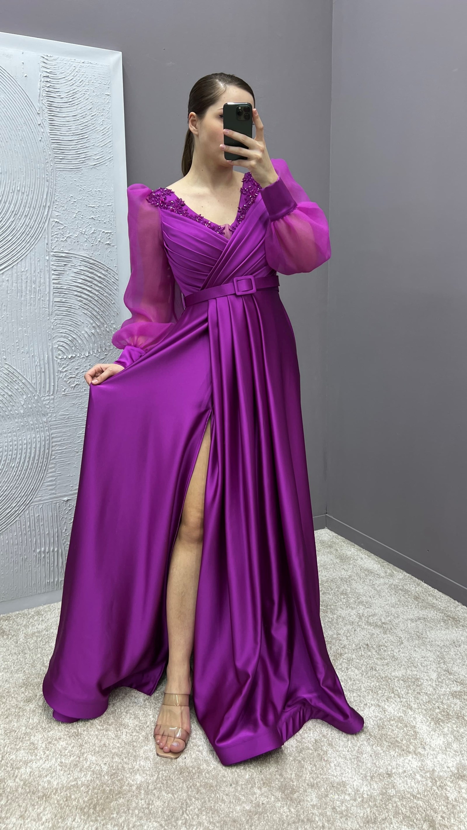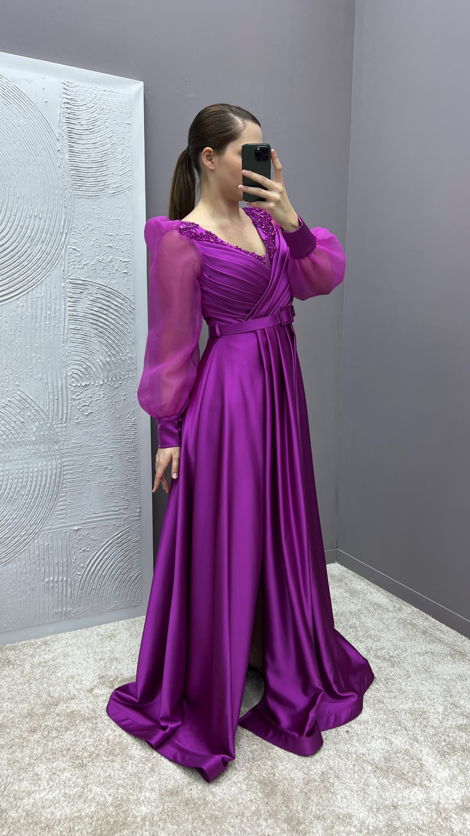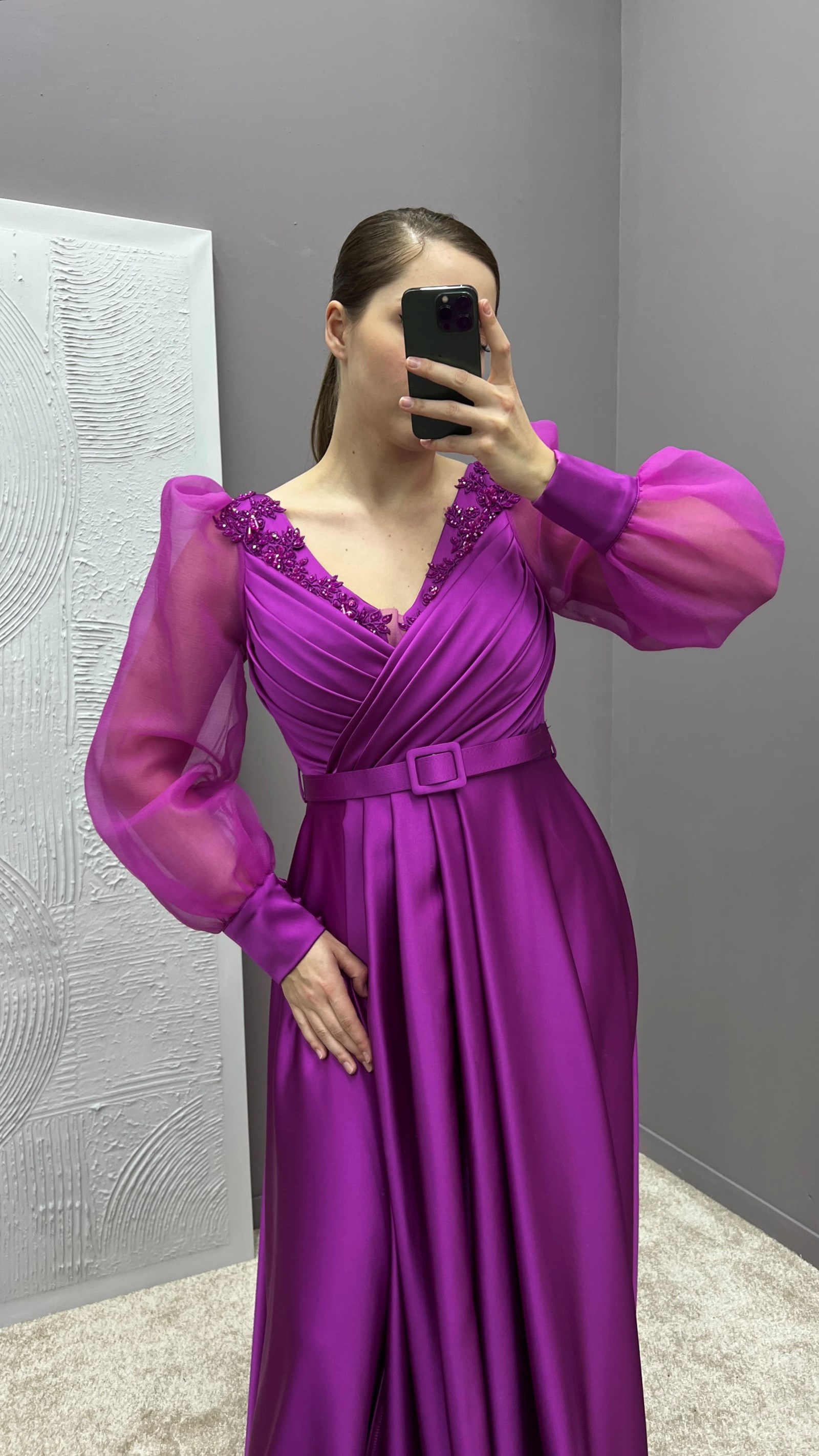 • Fuşya Drapeli Kolları Tül Tasarım Saten Büyük Beden Abiye Elbise