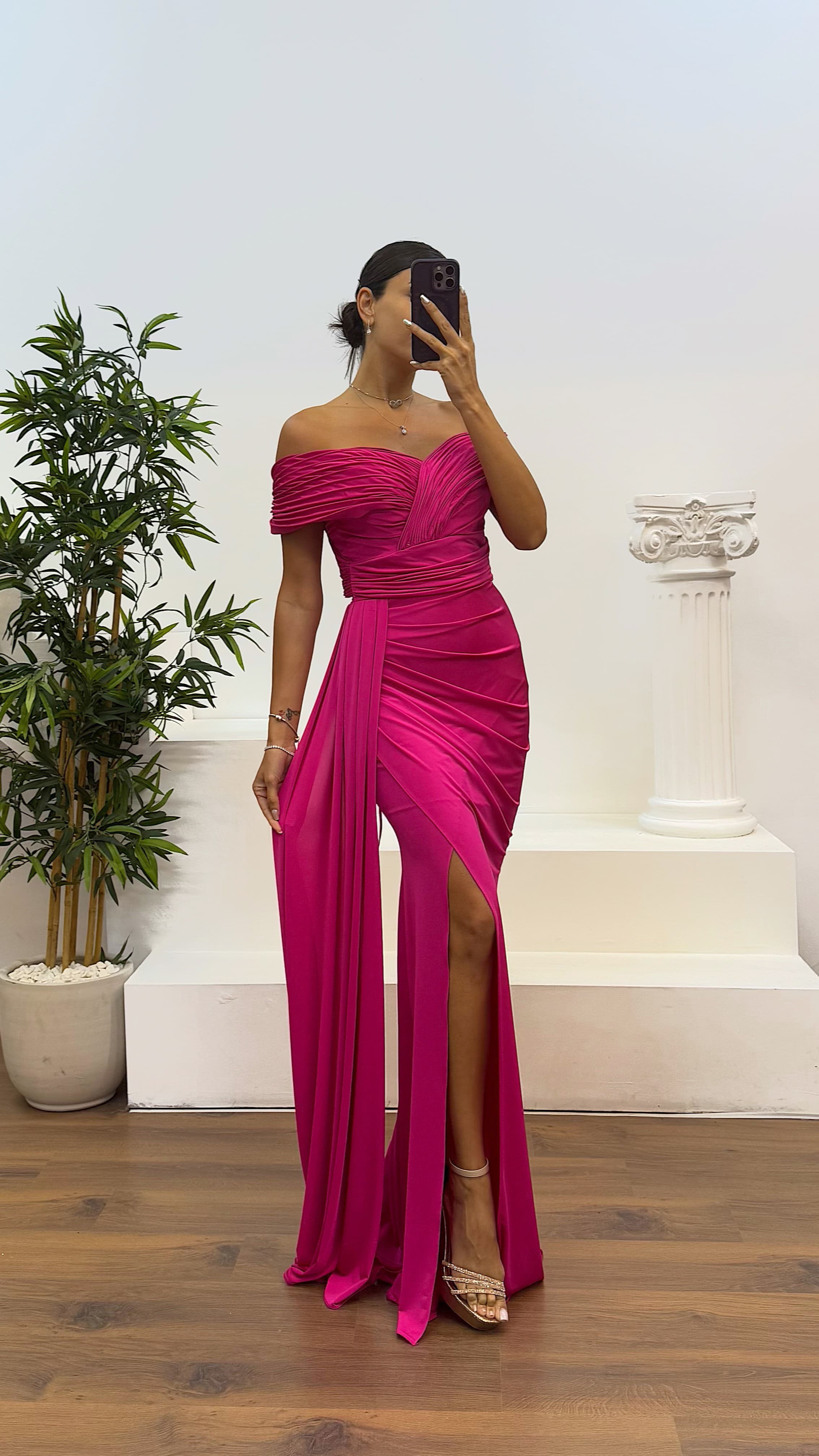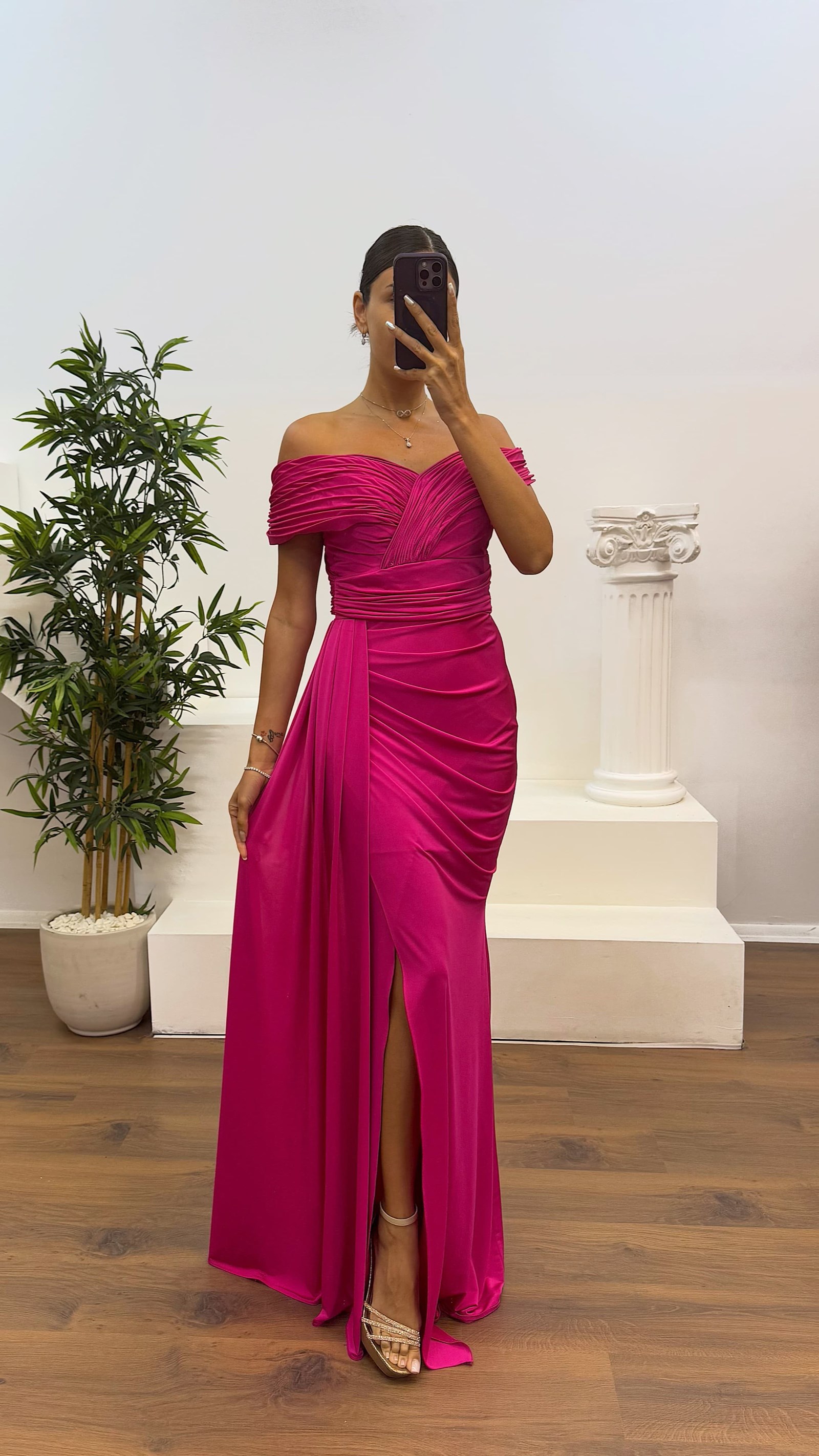 Madonna neckline evening dress The product is compatible with sizes 36-42, designed with breast padding, lined, with a back zipper closure, and a slit. Product length: 160 cm. Fabric type: jersey lycra, polyester.