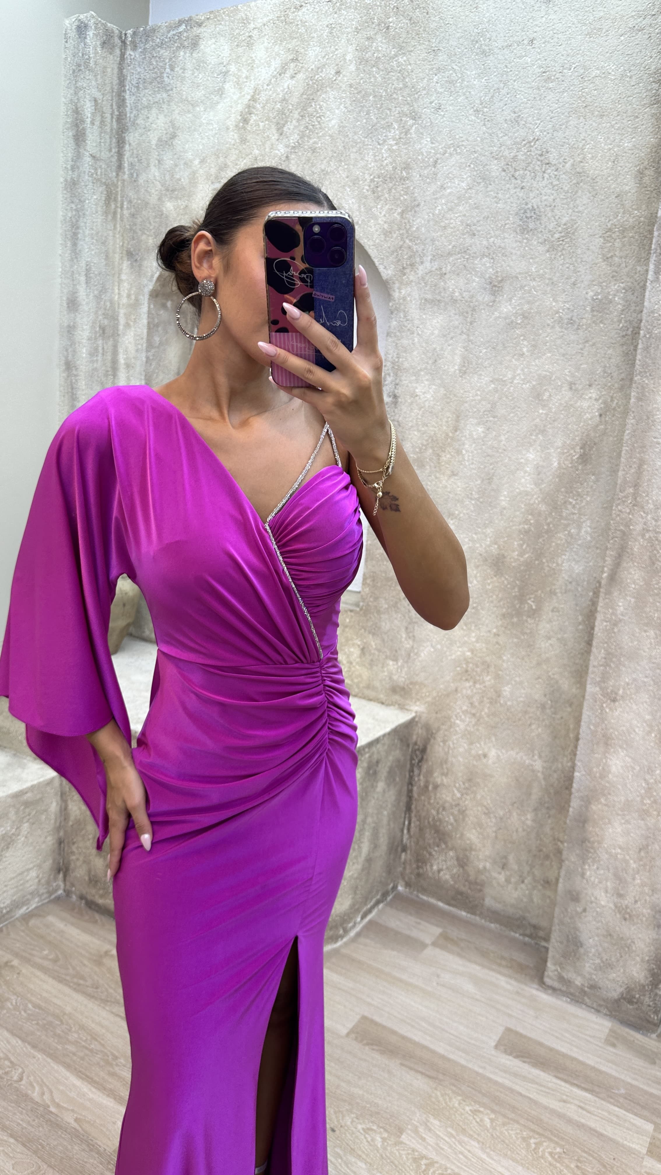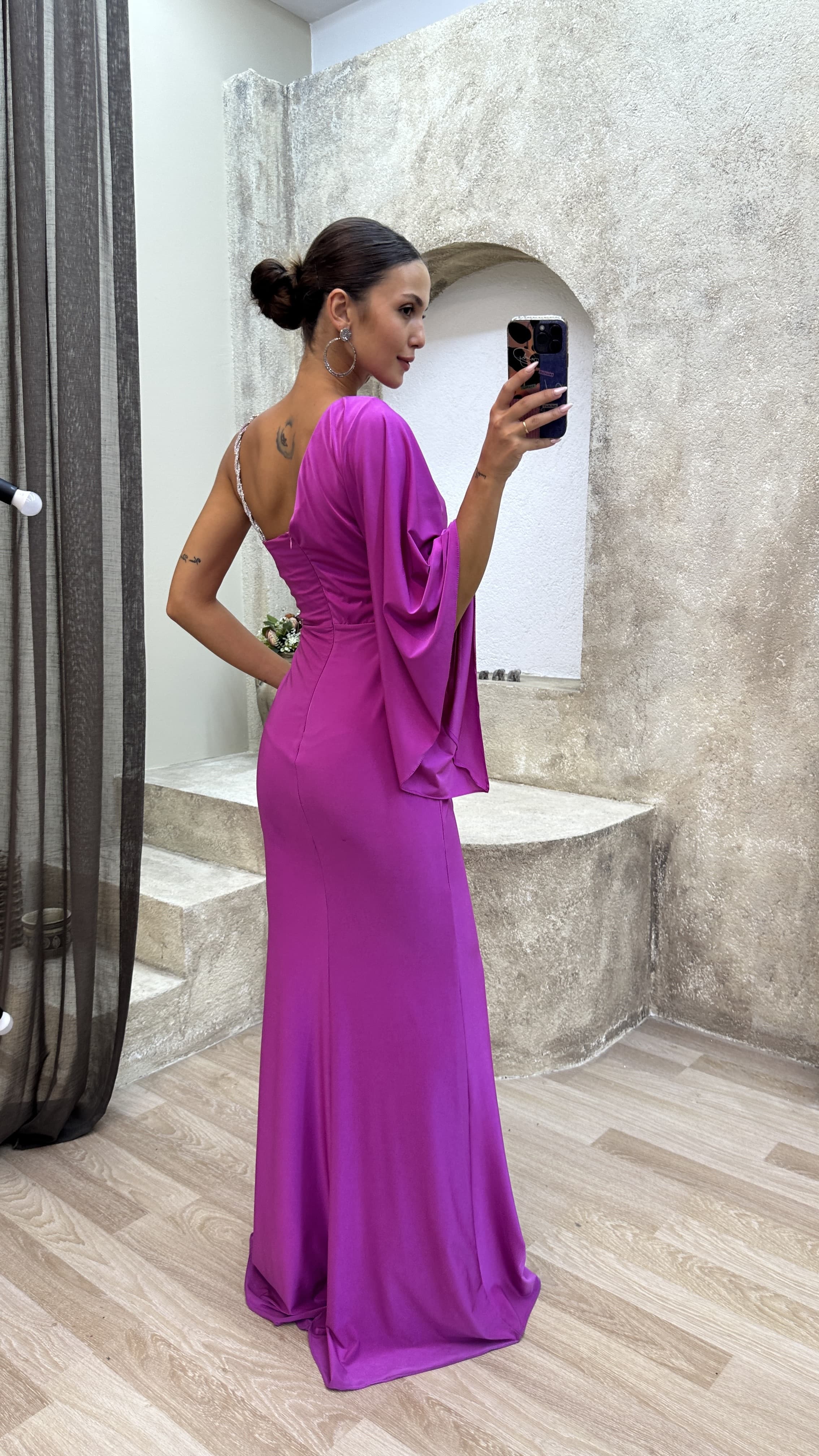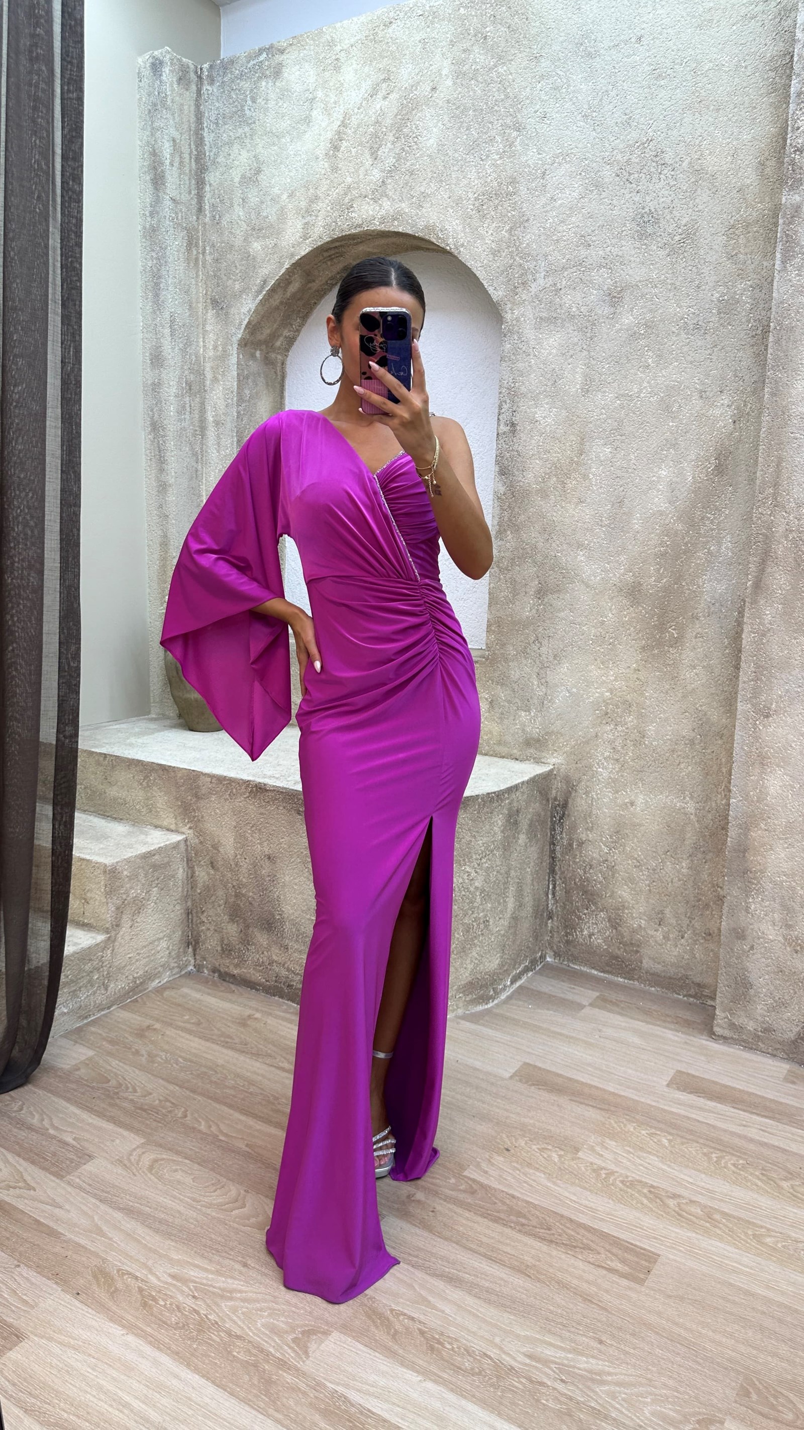 • Fuşya Tek Kol Göğüs Detay Drapeli Abiye Elbise