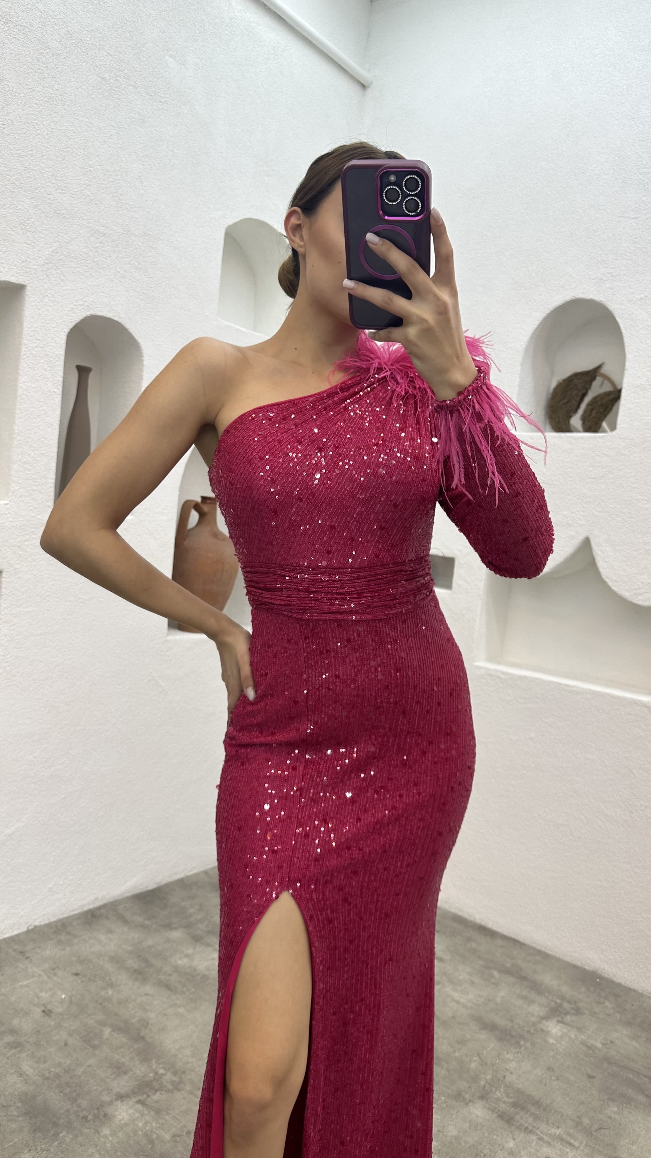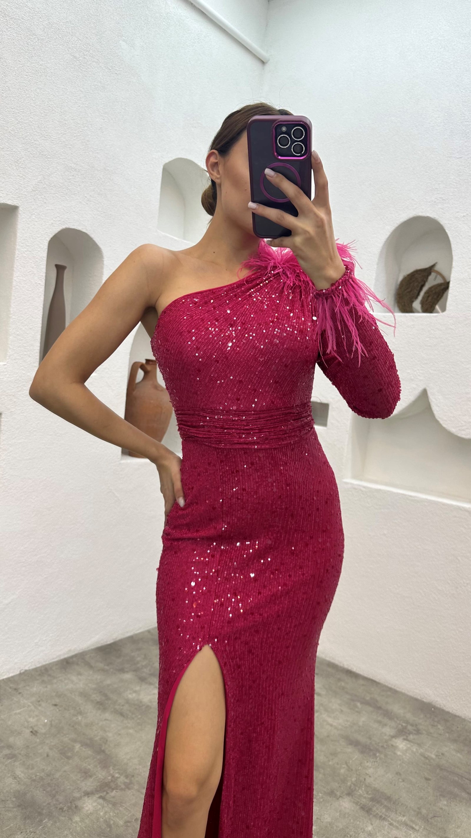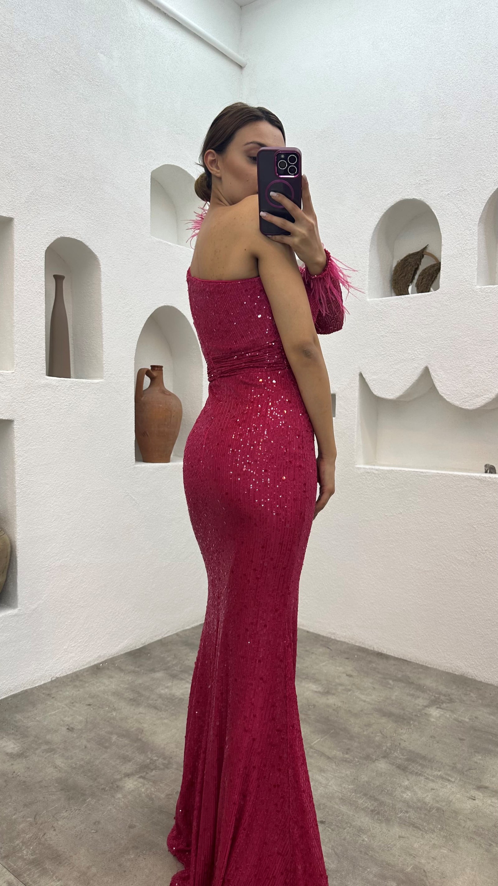 • Fuşya Tek Kol Tüylü Pul Payet Abiye Elbise