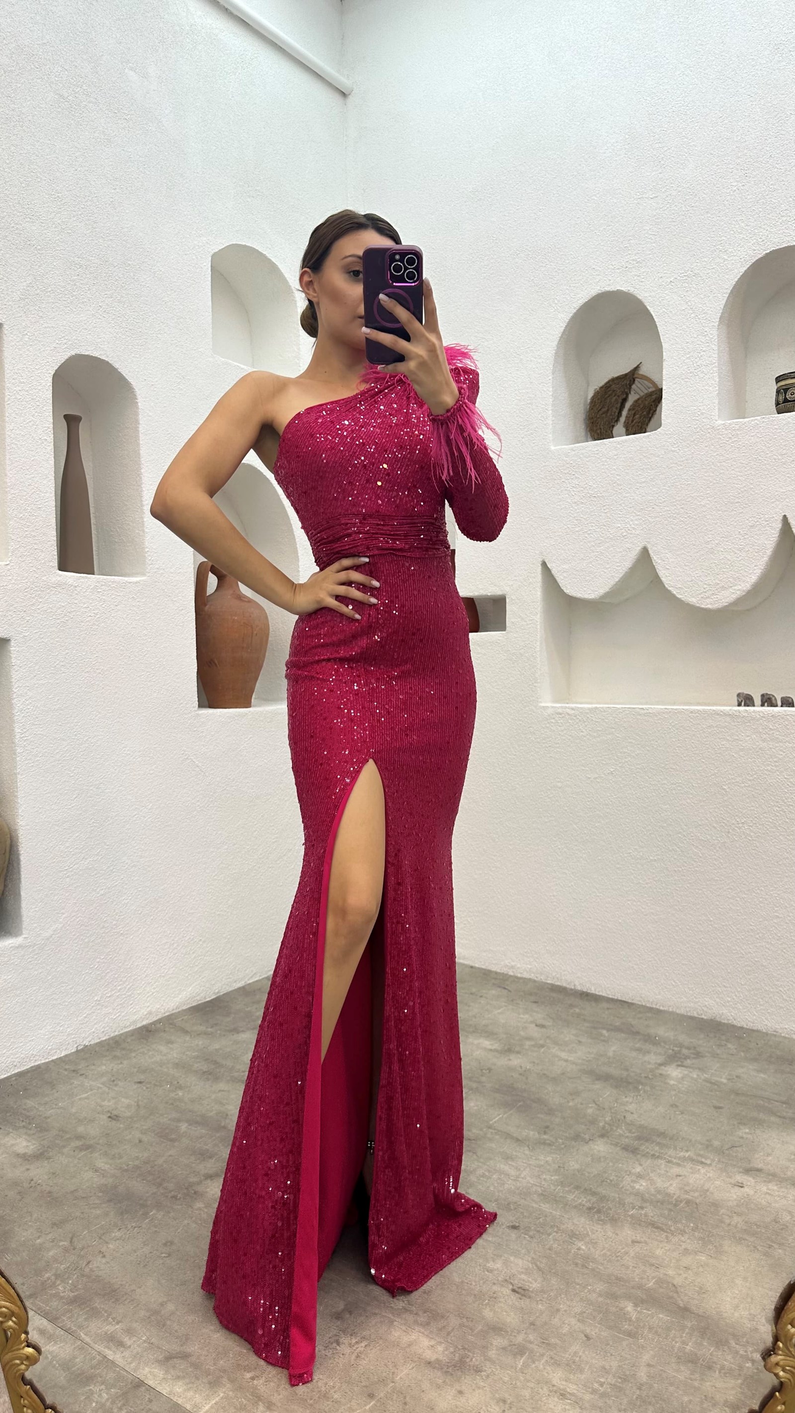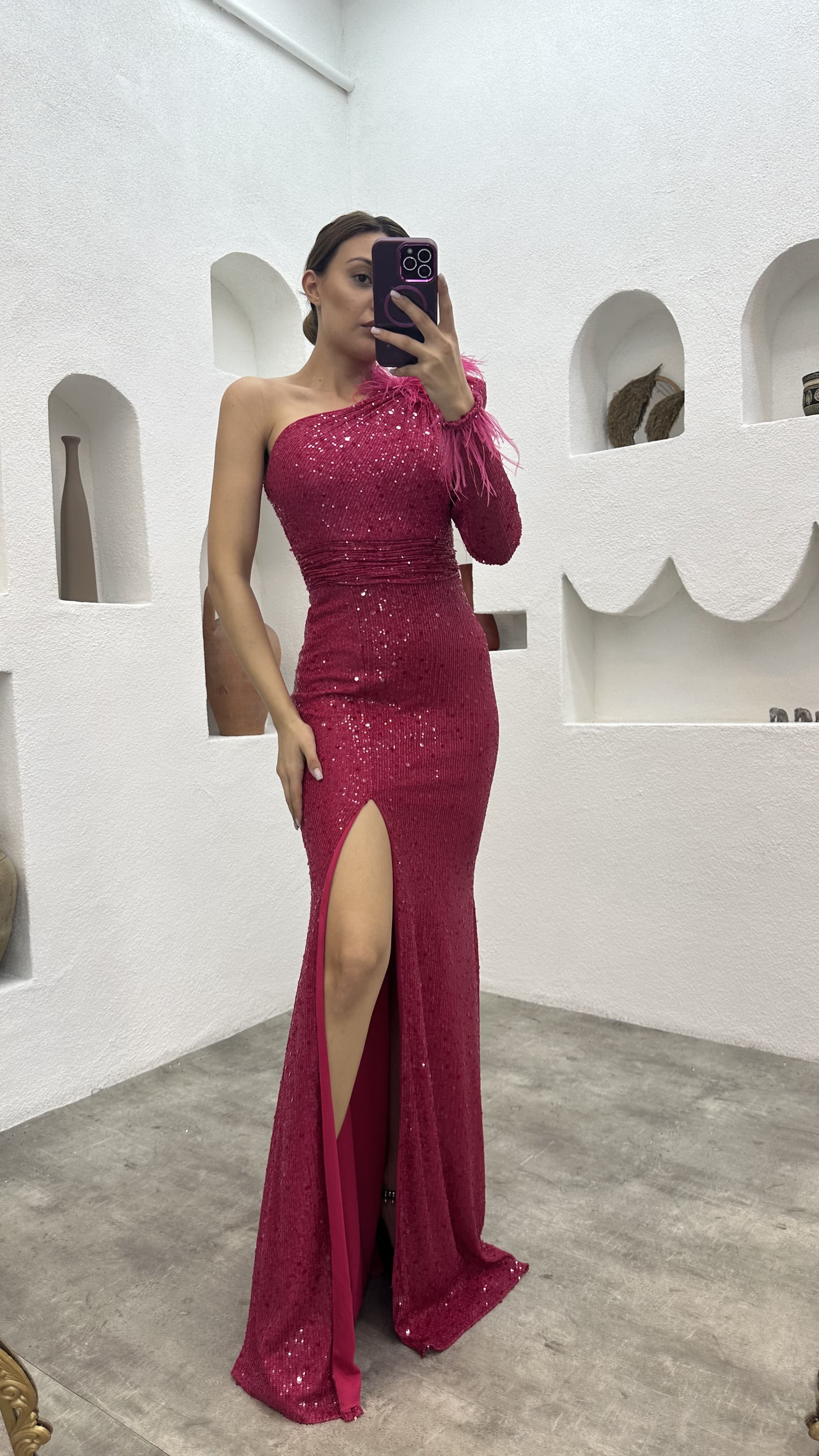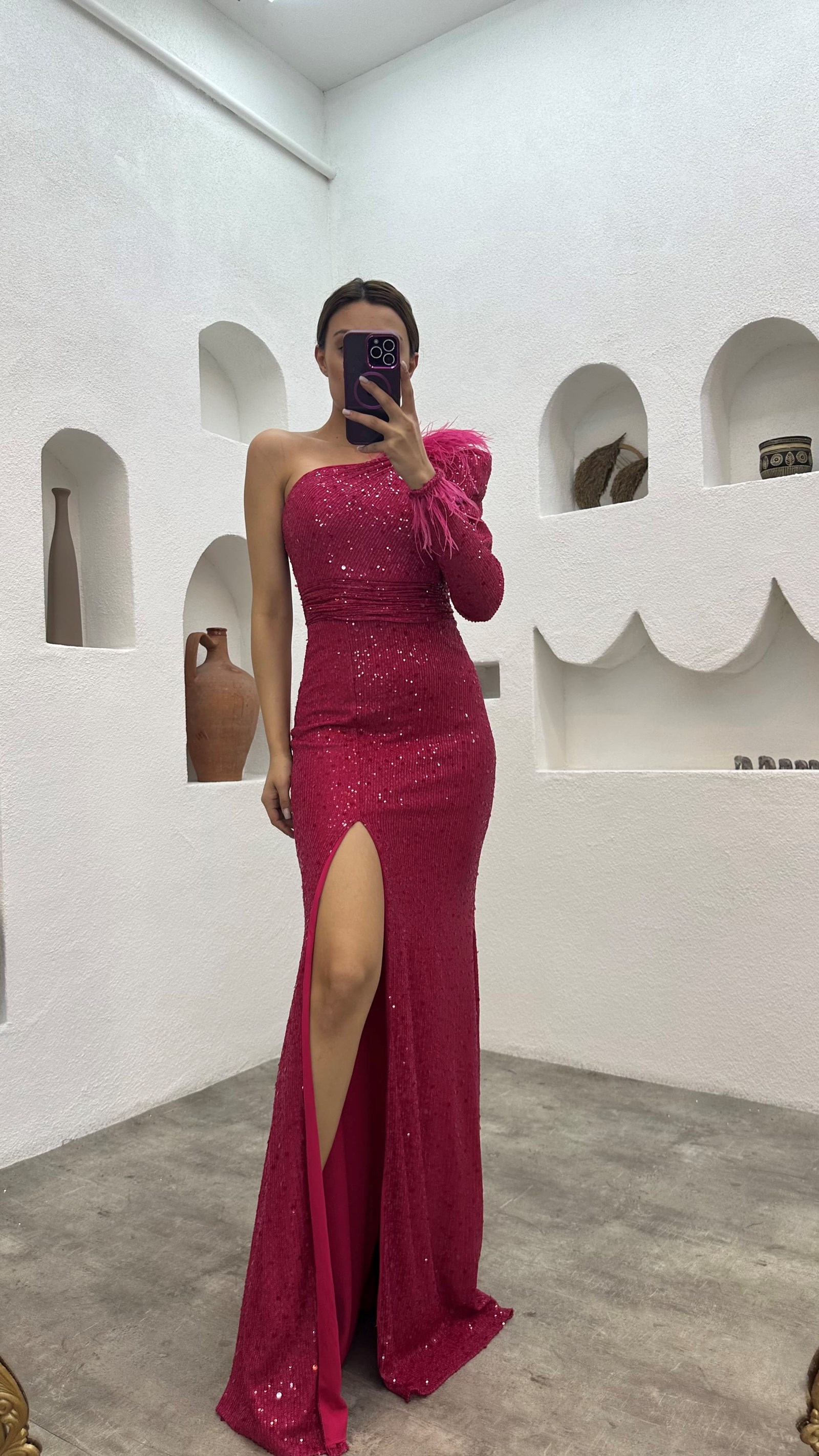 • Fuşya Tek Kol Tüylü Pul Payet Abiye Elbise