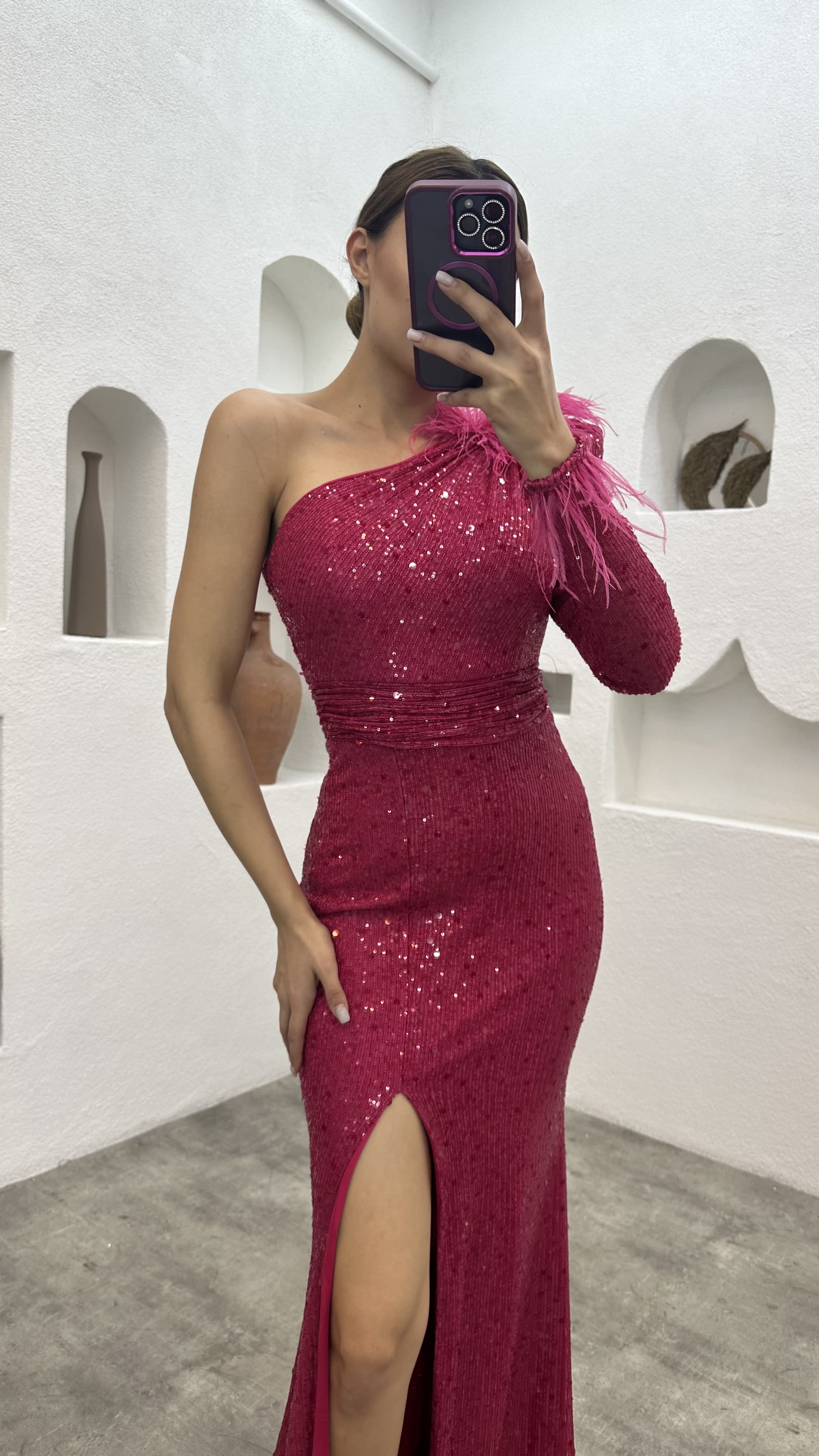 Fuşya Tek Kol Tüylü Pul Payet Abiye Elbise