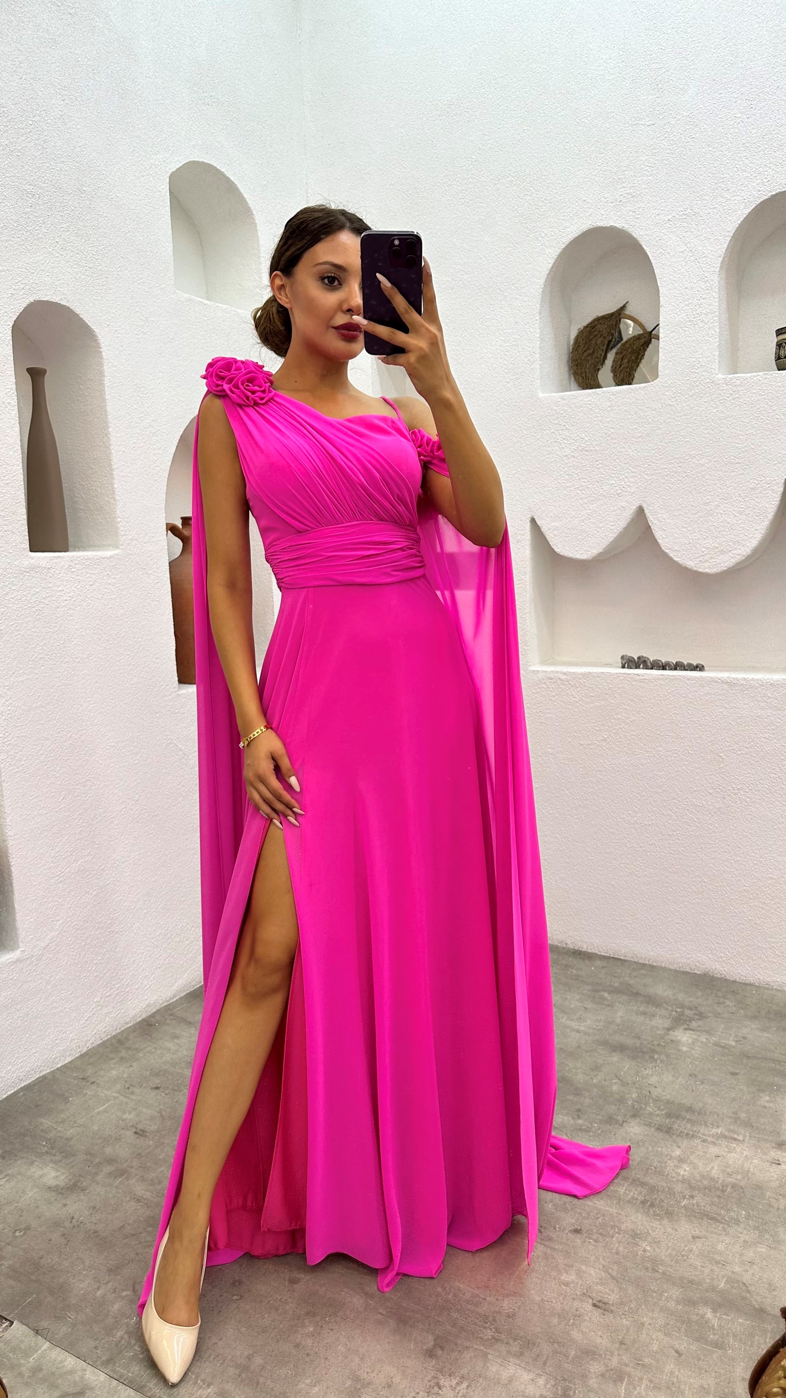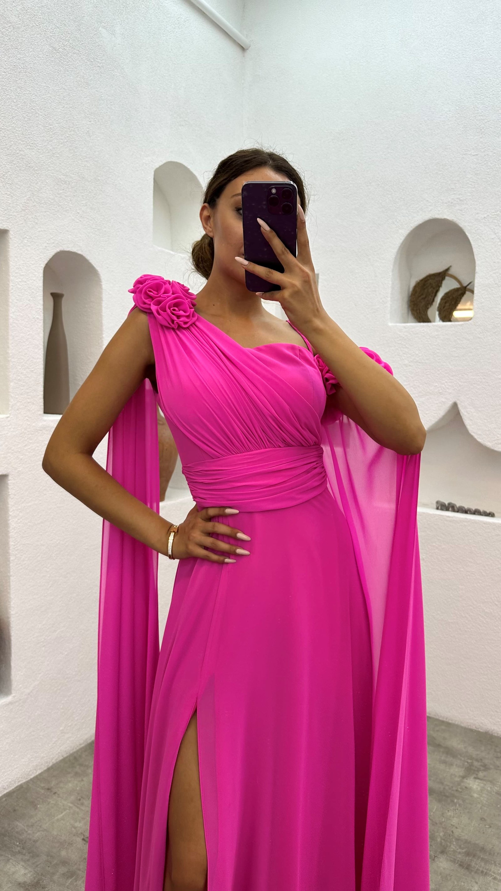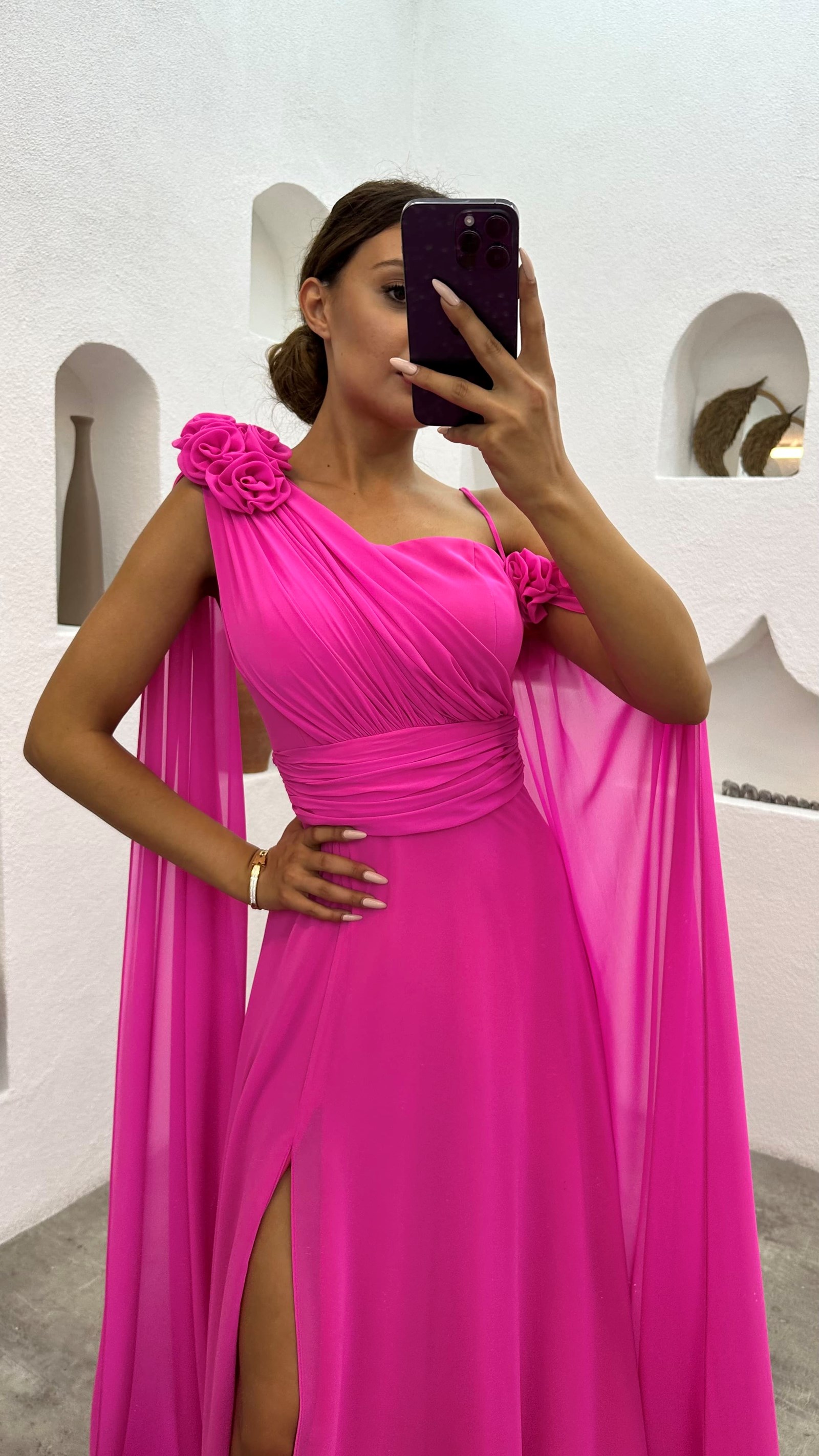 • Fuşya Tek Omuz Gül Detay Abiye Elbise
