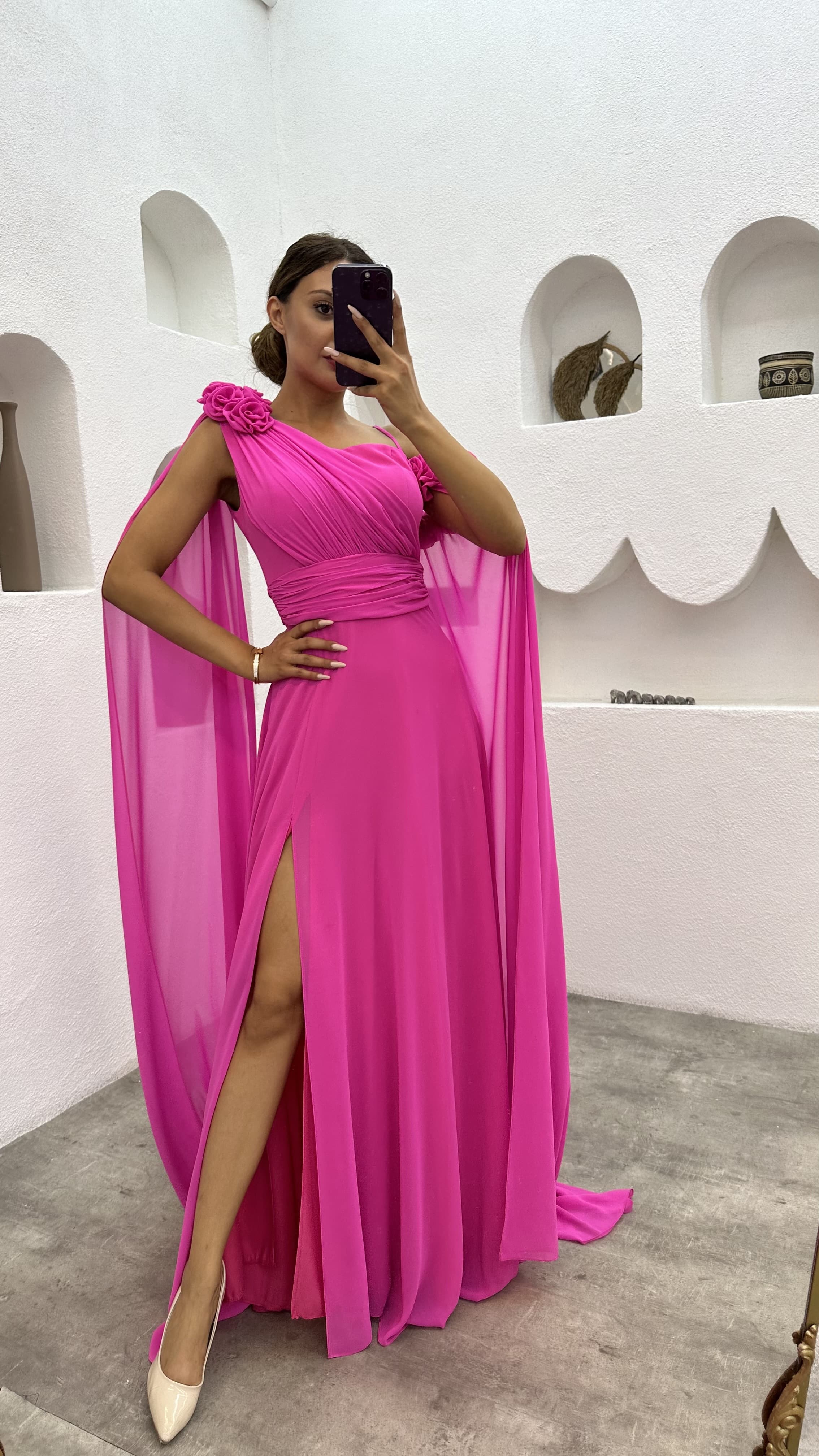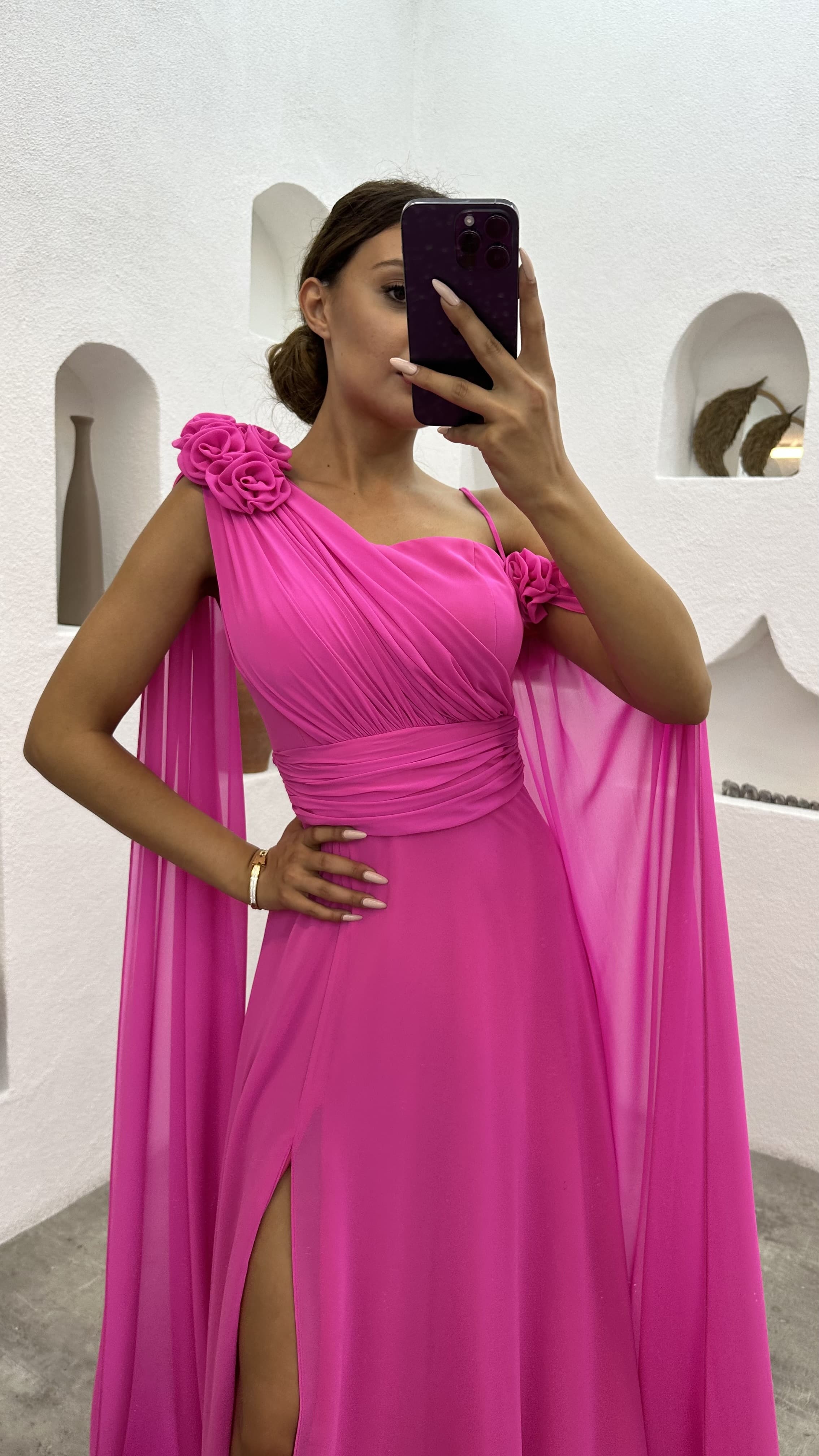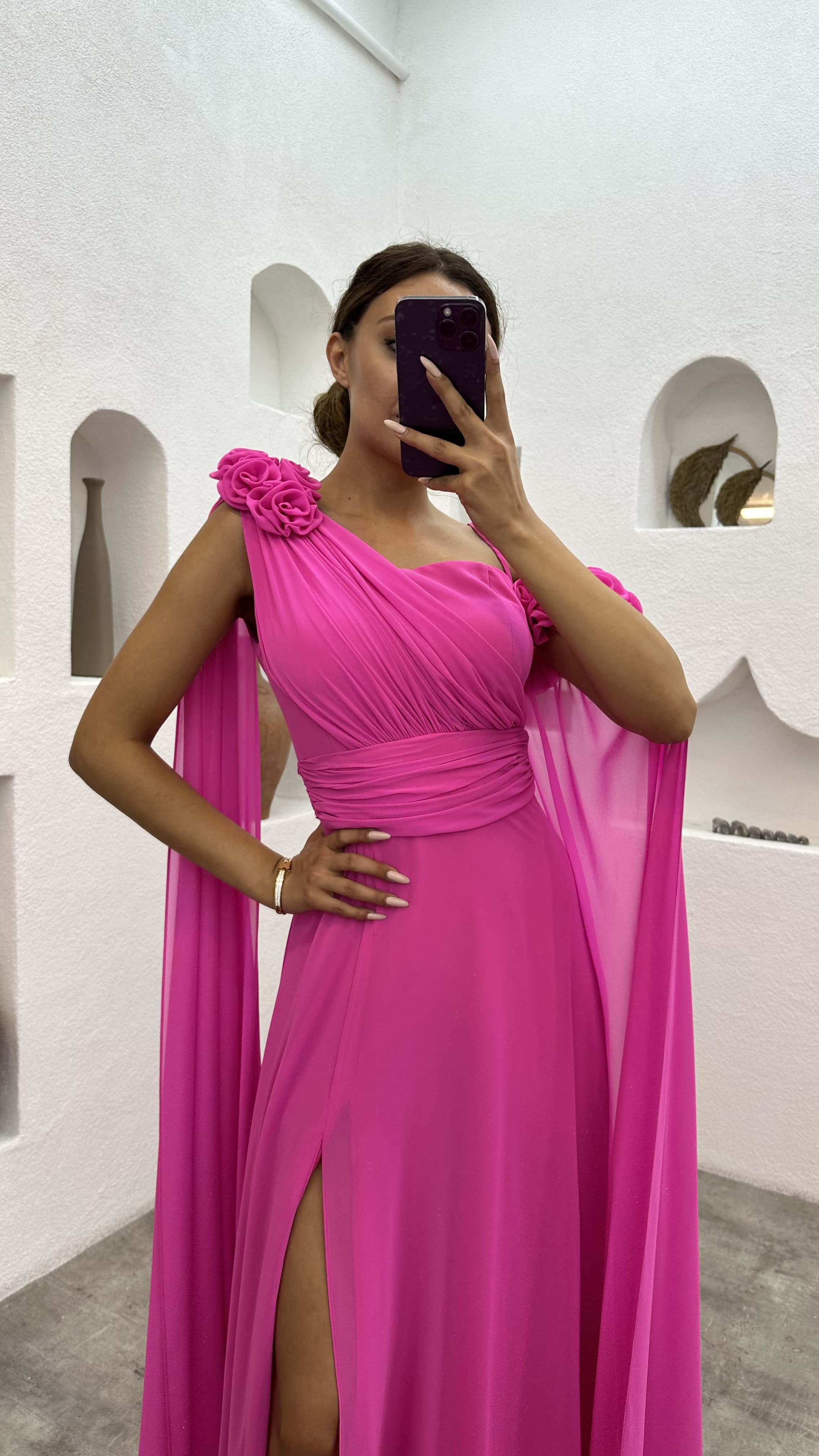 • Fuşya Tek Omuz Gül Detay Abiye Elbise