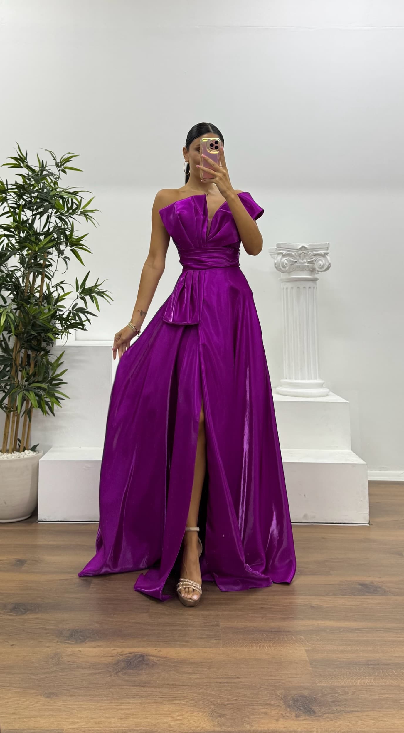 One-shoulder puff sleeve evening dressThe product fits sizes 36 to 42, features padded bust, lining, a back zipper closure, and a slit design.Product length: May vary between 170-175 cm.Fabric type: Satin polyester-viscose