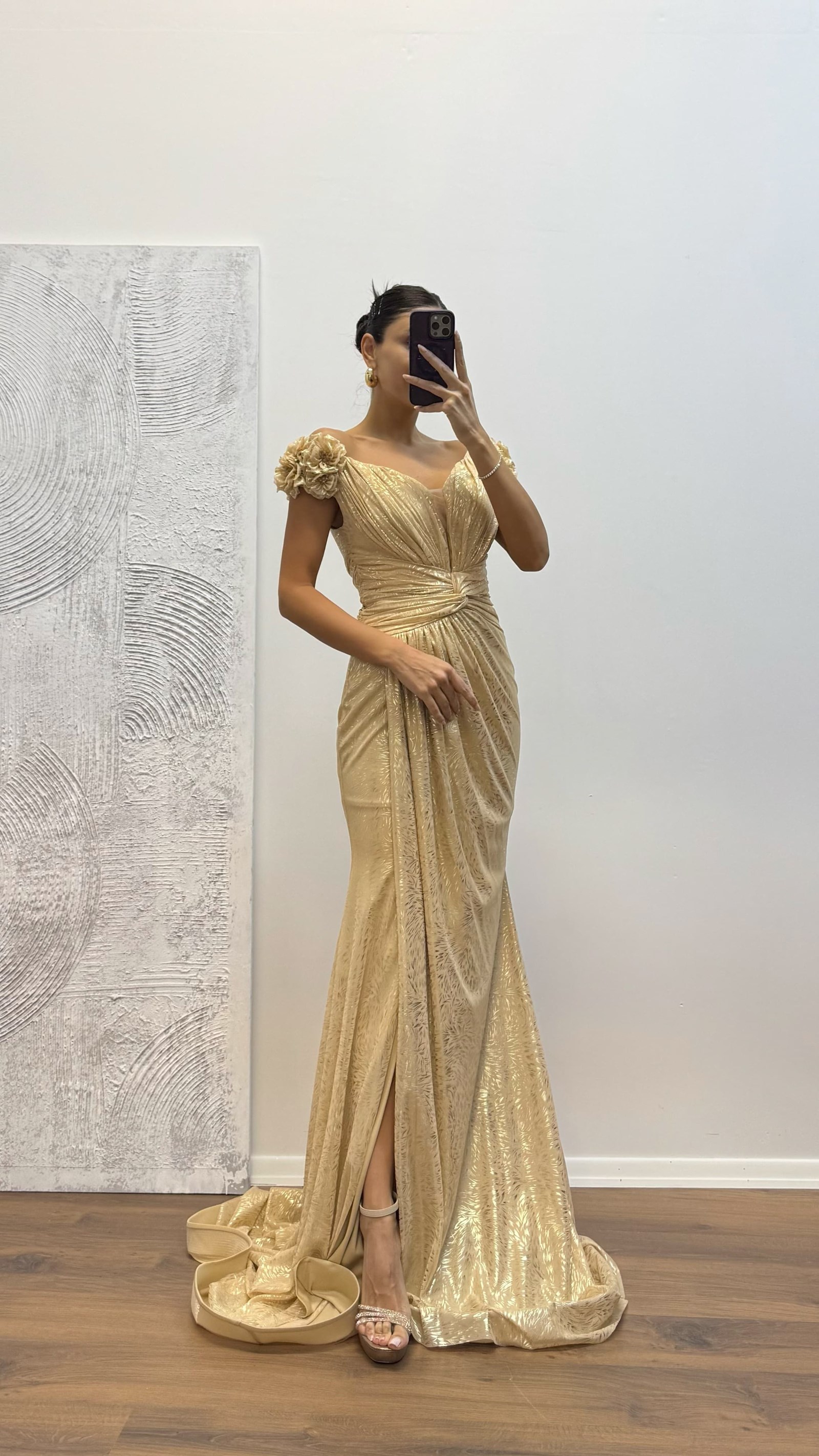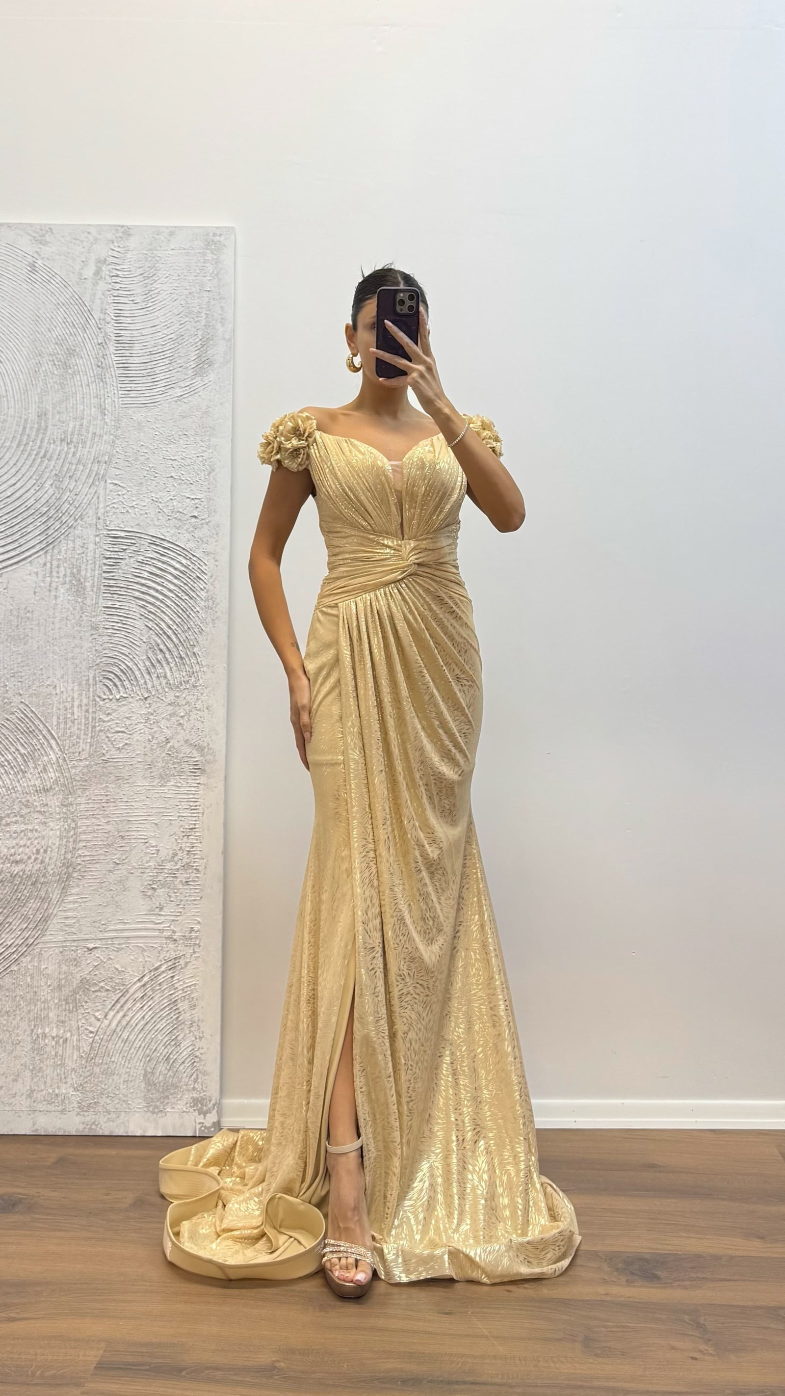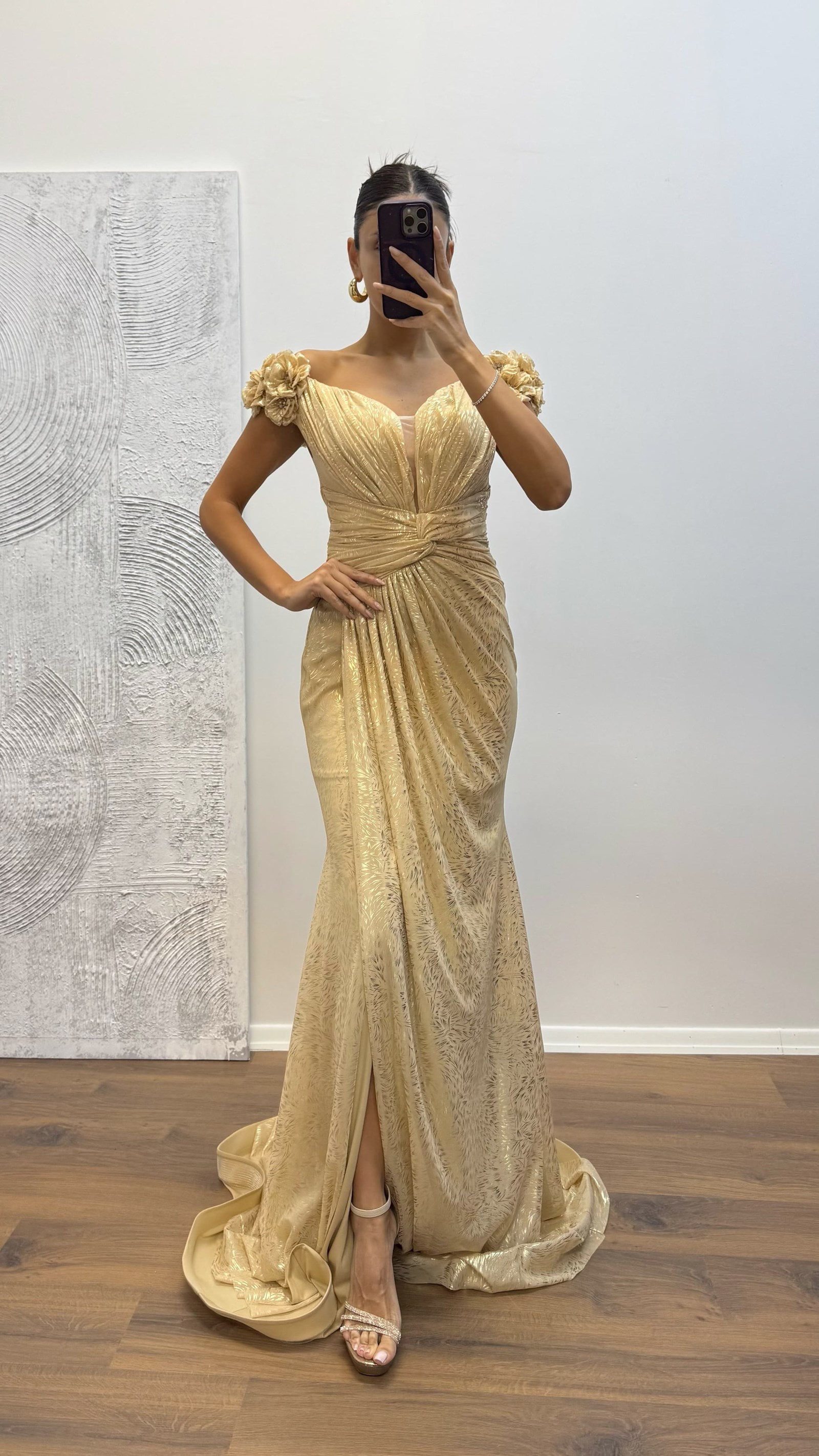 Evening dress with shoulder floral detail The product is suitable for sizes 36–42, features padded cups, is fully lined, has a back zipper closure, a slit, and is designed as an evening dress with floral details. Product length: 160 cm. Fabric type: Patterned tulle.