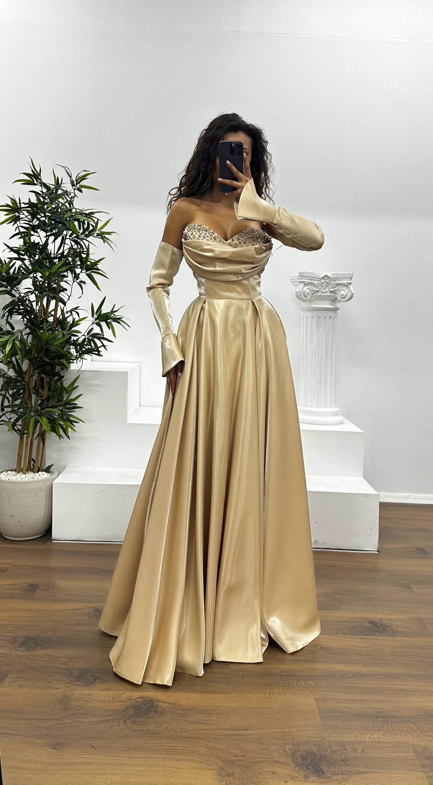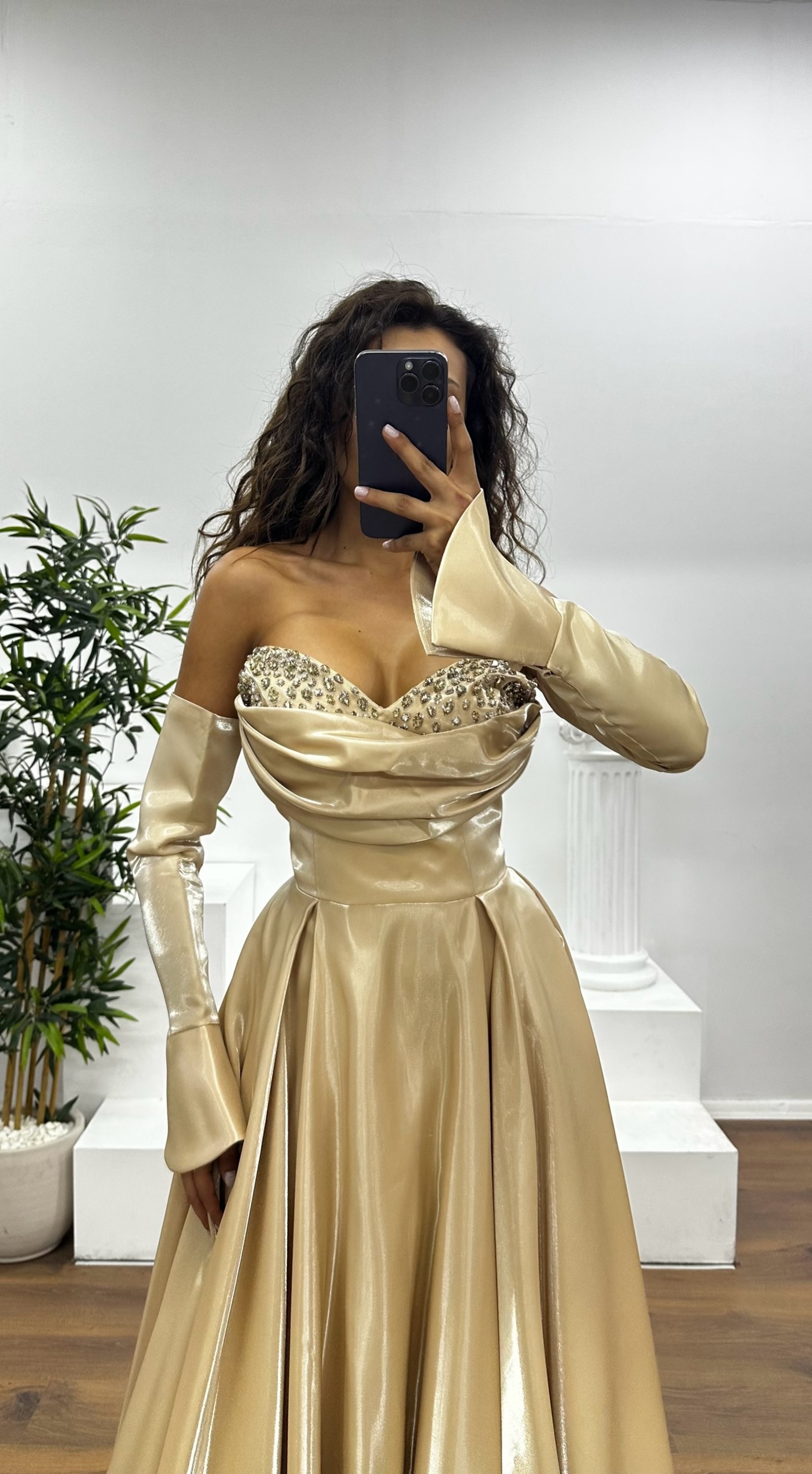 • Gold Straplez Göğüs Taş Detay Abiye Elbise