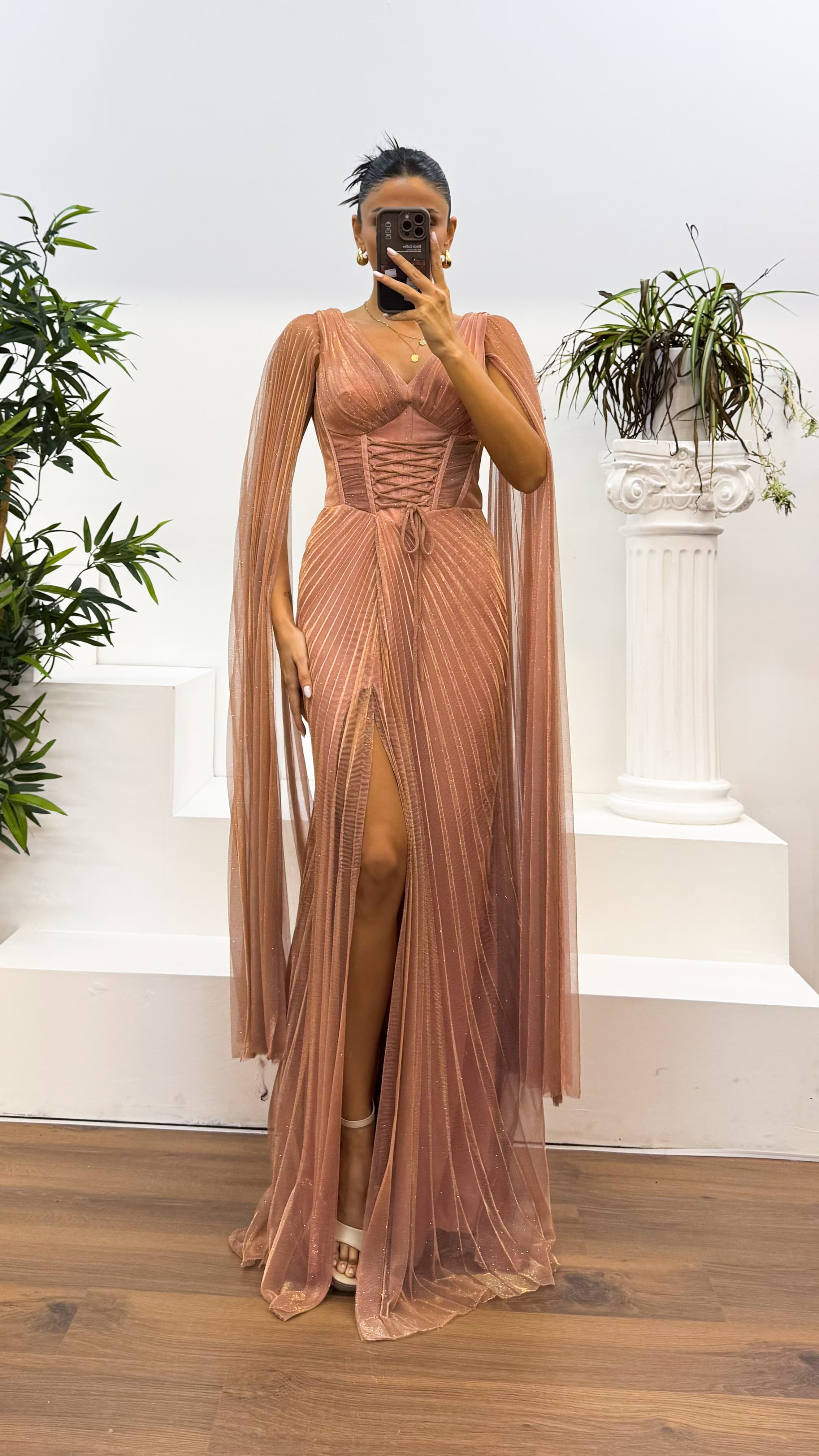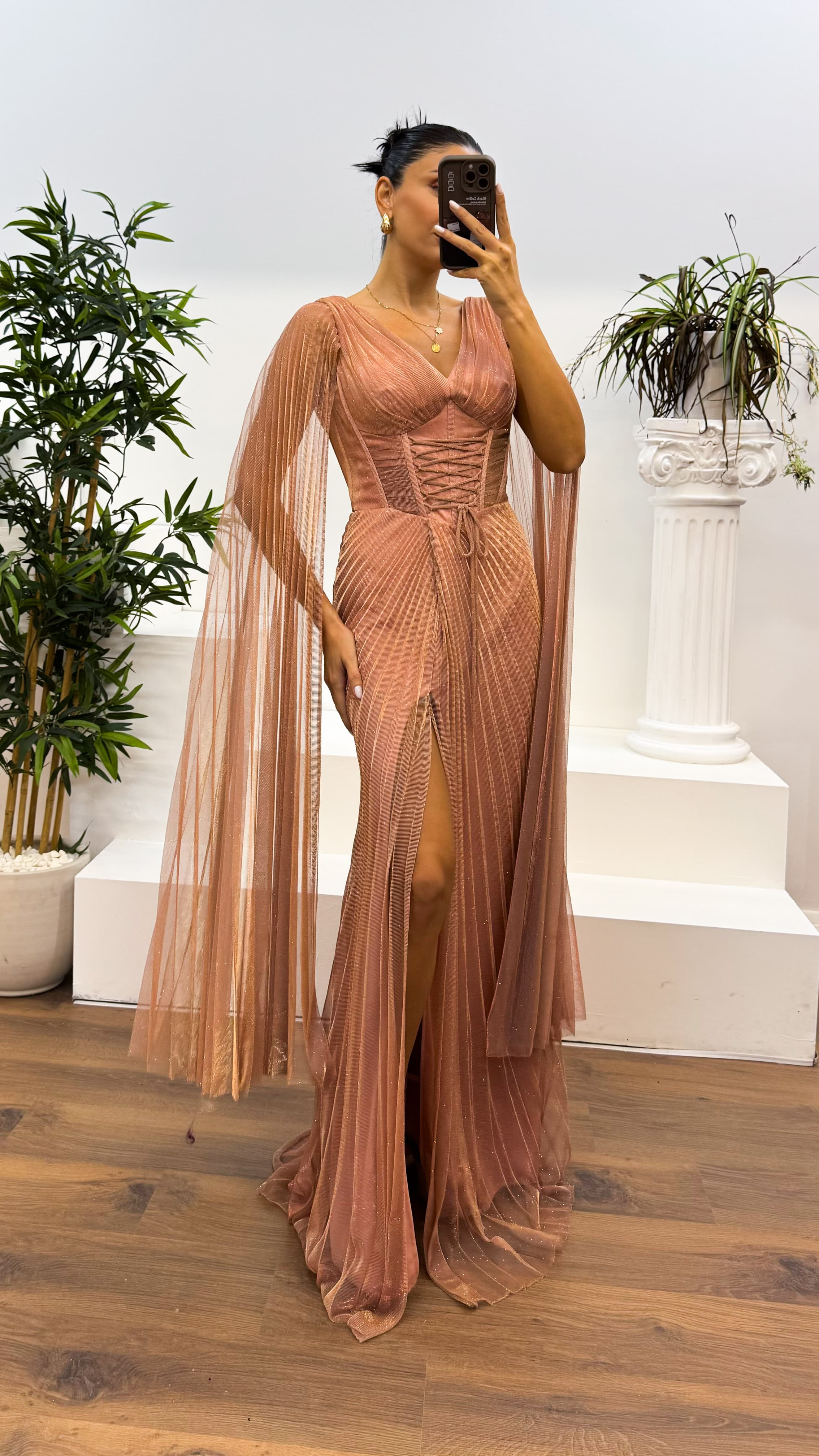 • Gül Kurusu V Yaka Sırt Detay Pliseli Abiye Elbise