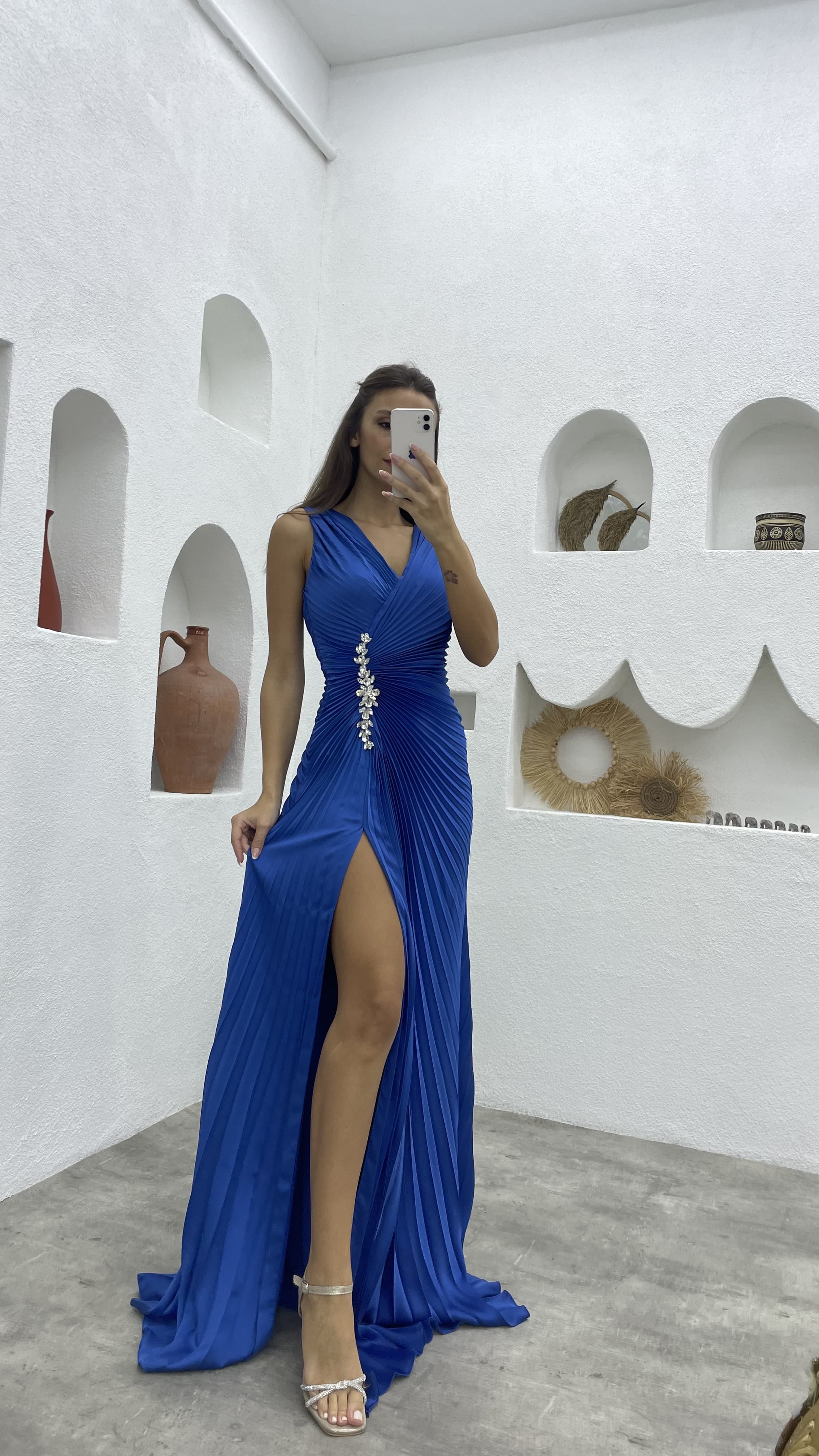 İndigo Büzgülü Beli İşlemeli Saten Abiye Elbise