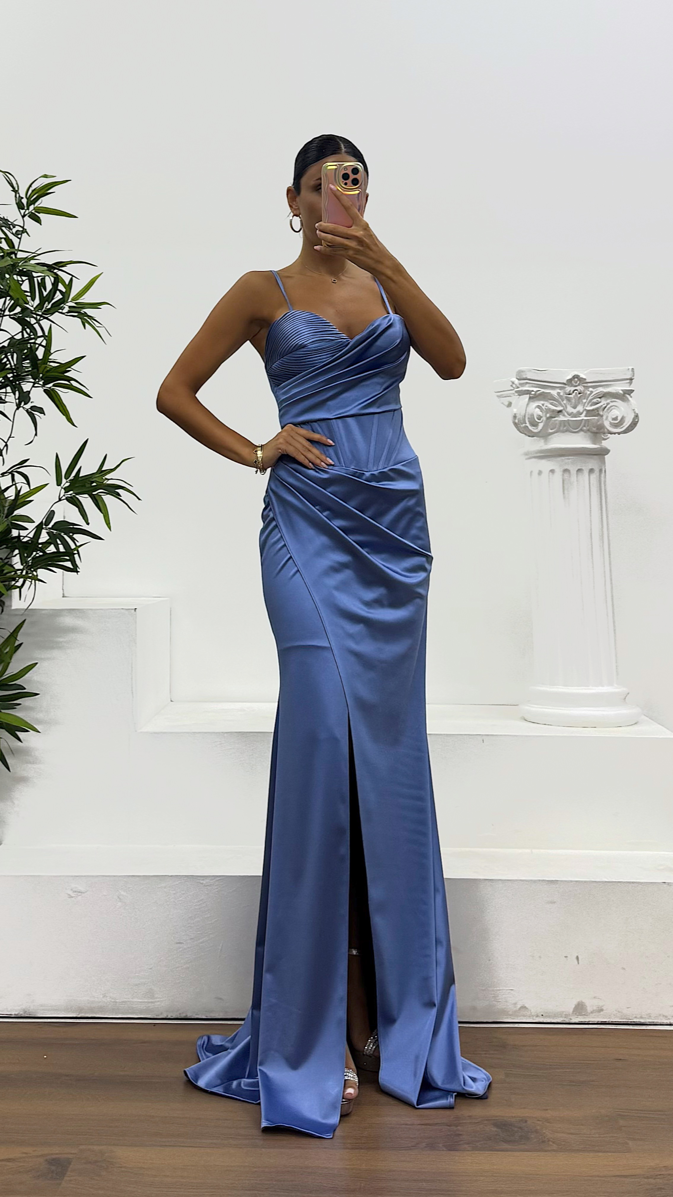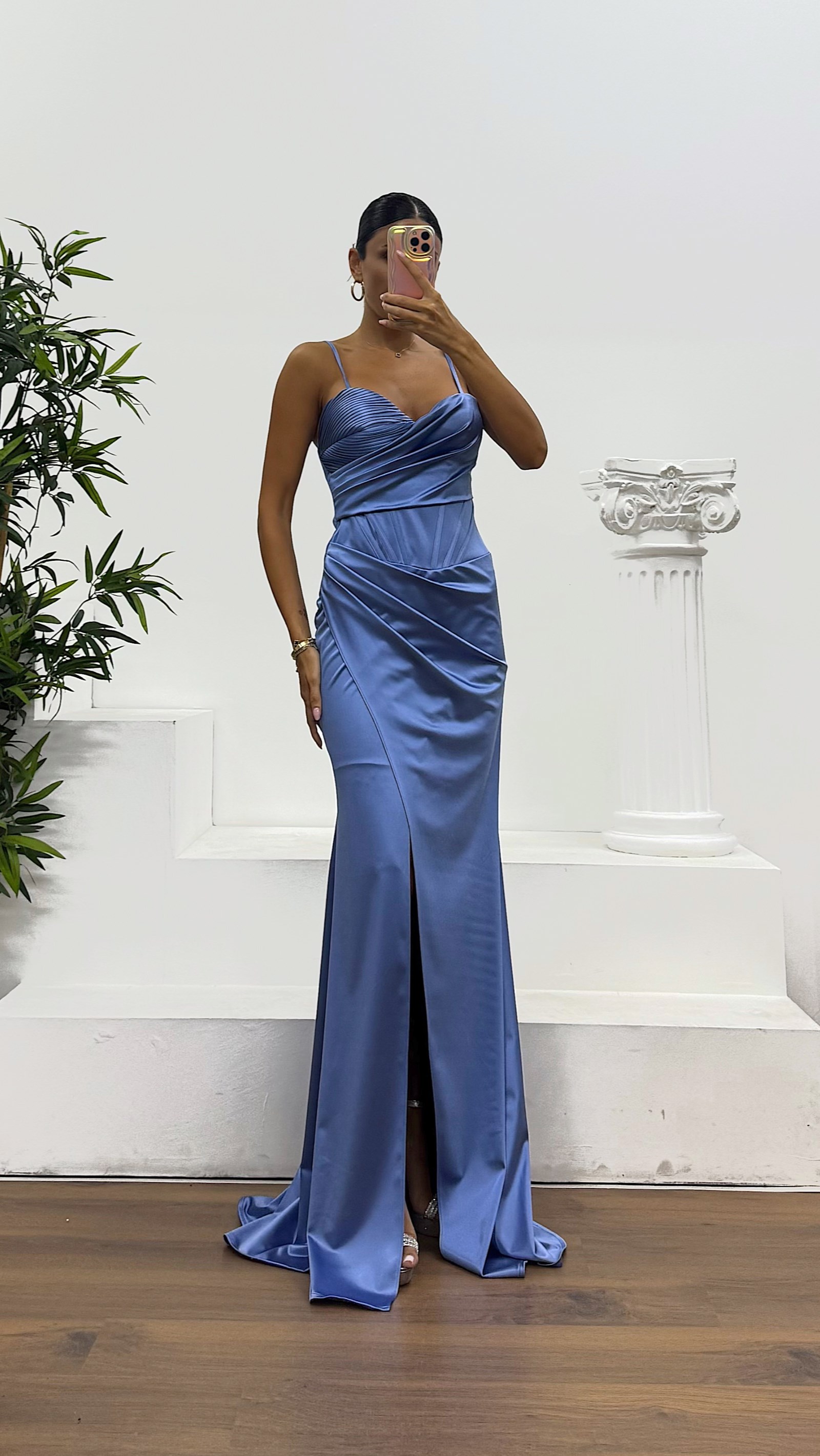 • İndigo İp Askılı Sırt Bağlamalı Abiye Elbise