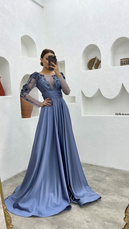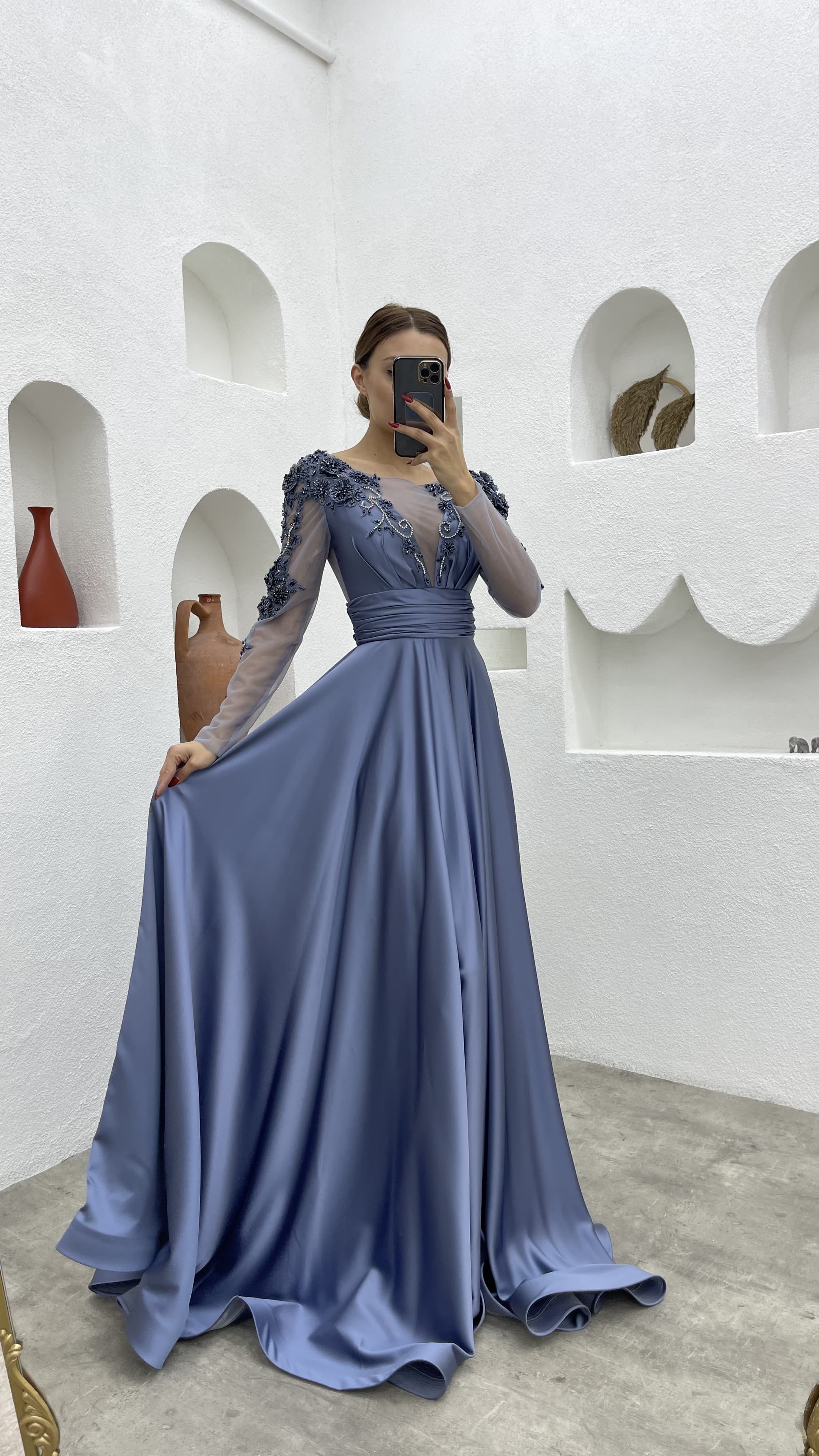 Indigo Embroidered Detail Draped Long Satin Evening Dress