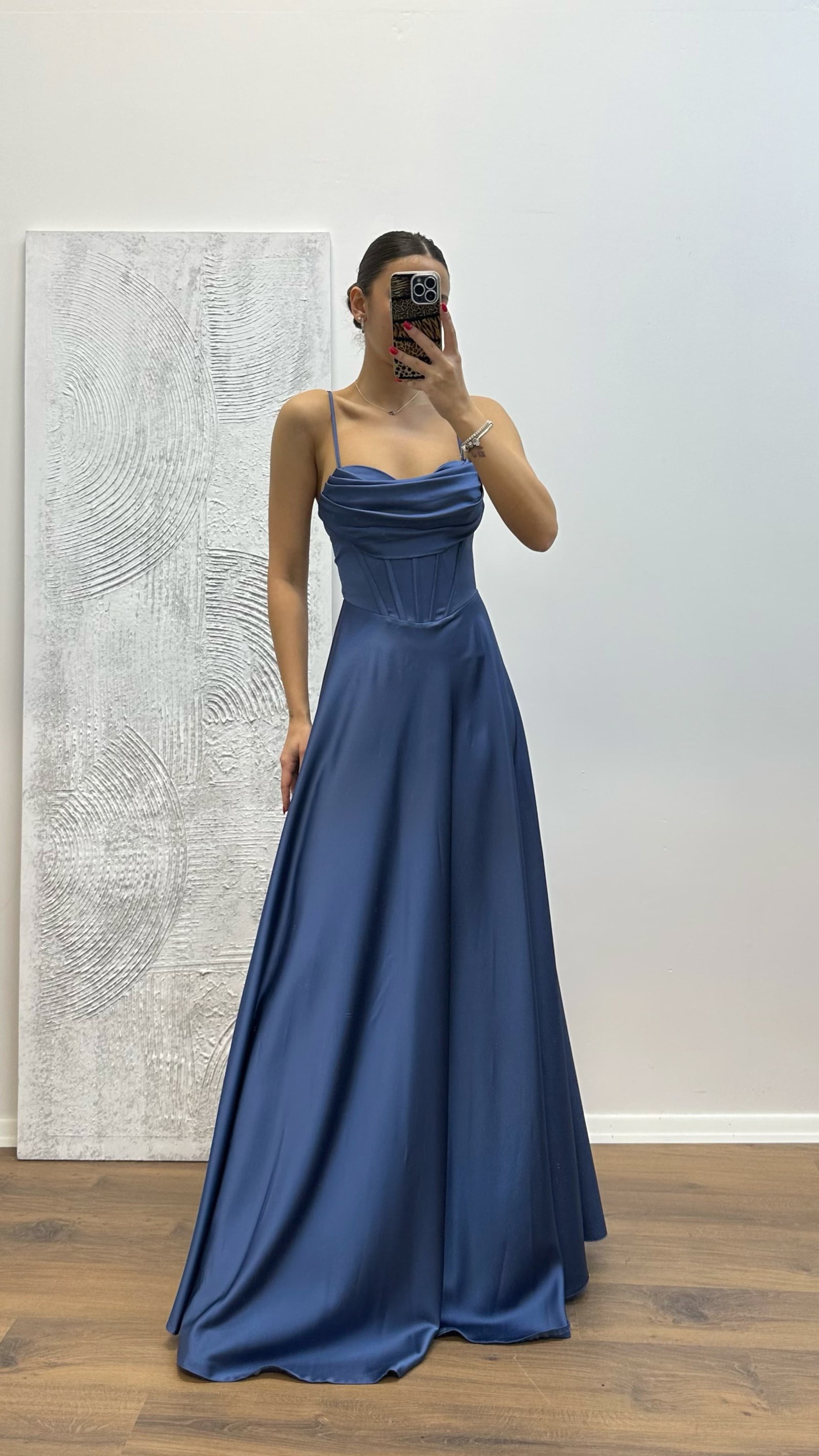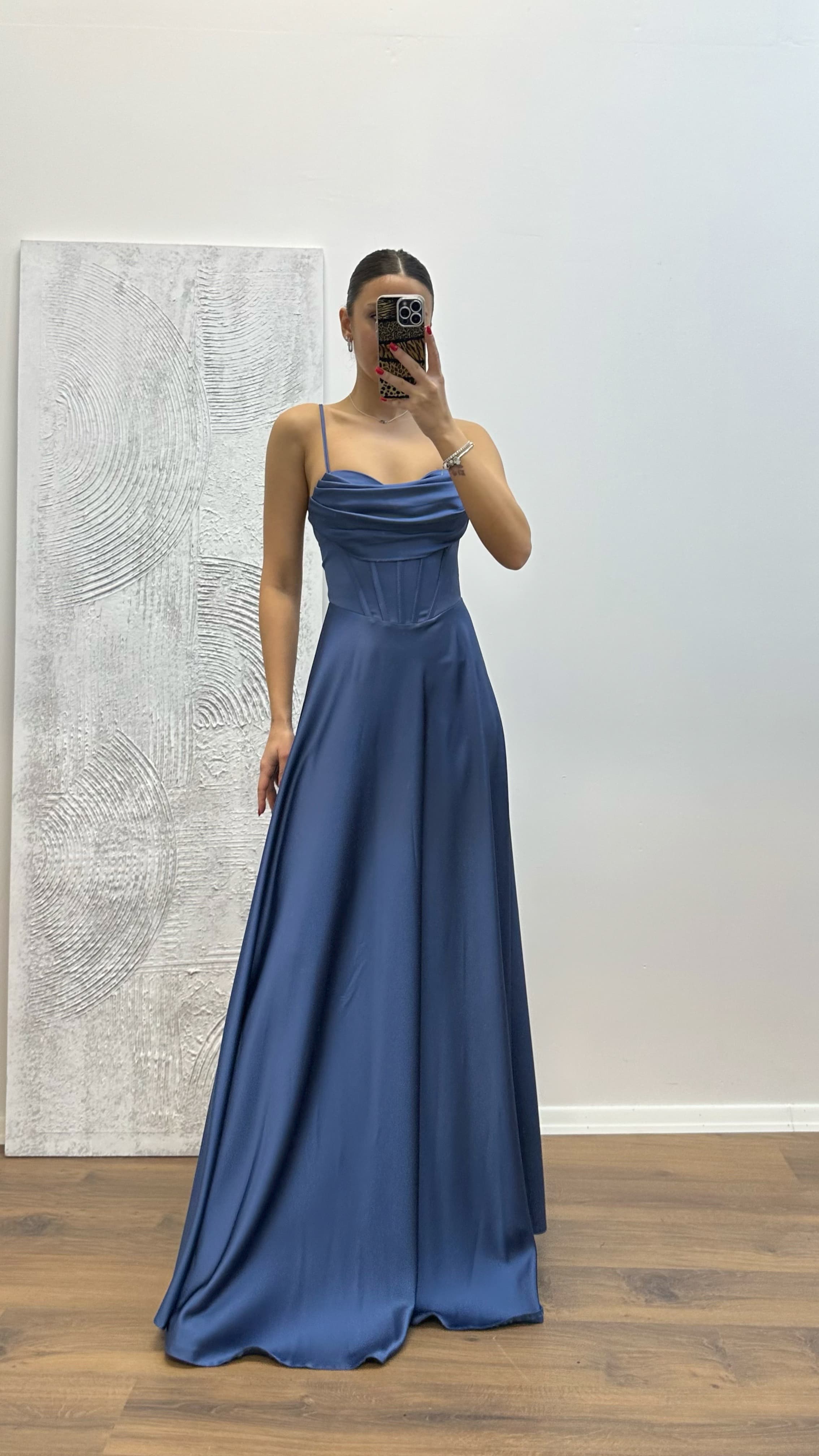 • Zümrüt Sırt Detay Saten Abiye Elbise