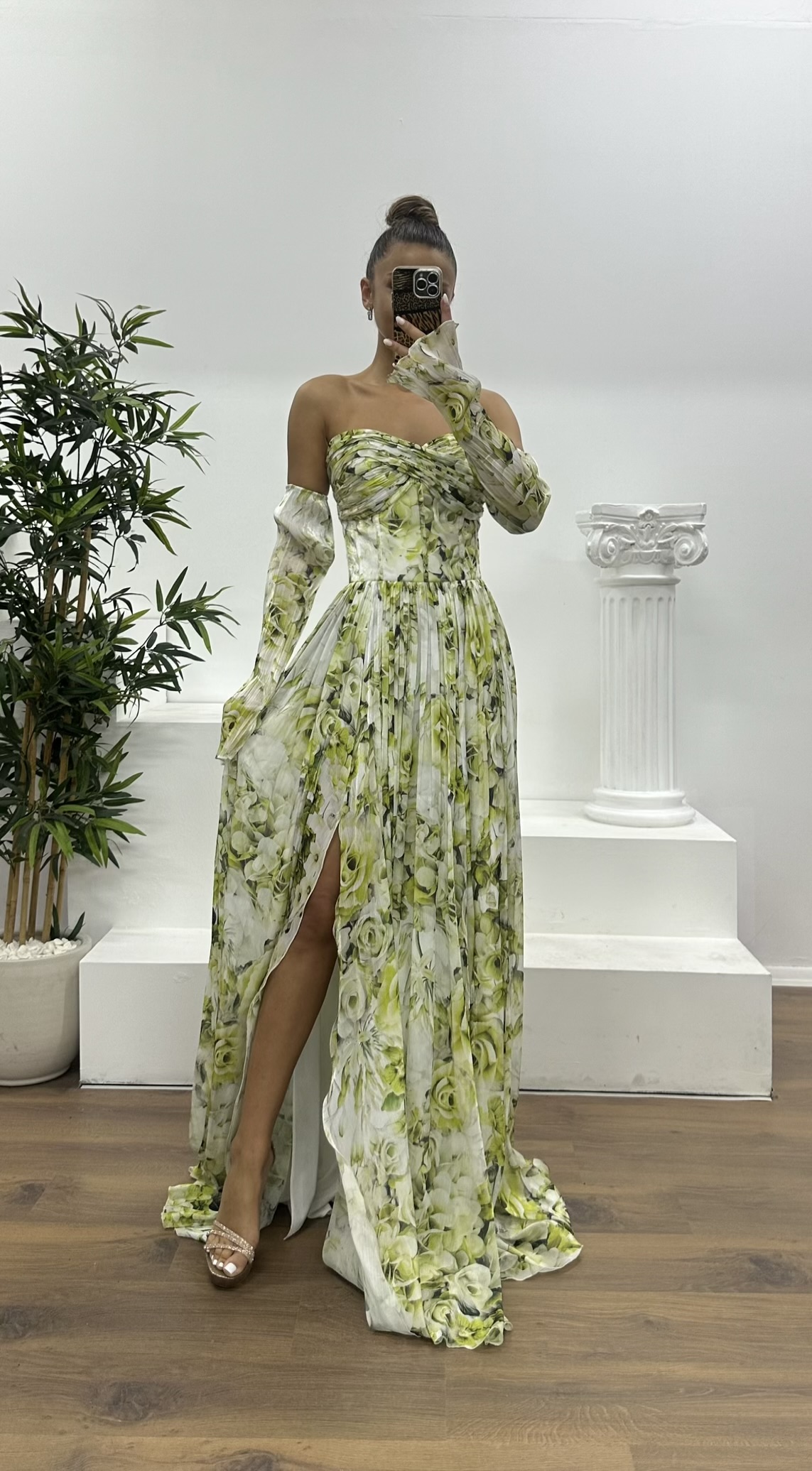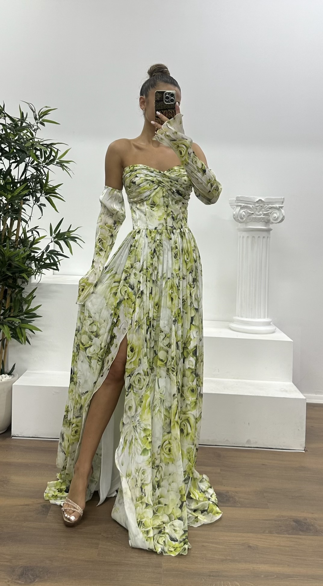 • Kemik-Yeşil Kalp Yaka Desenli Abiye Elbise