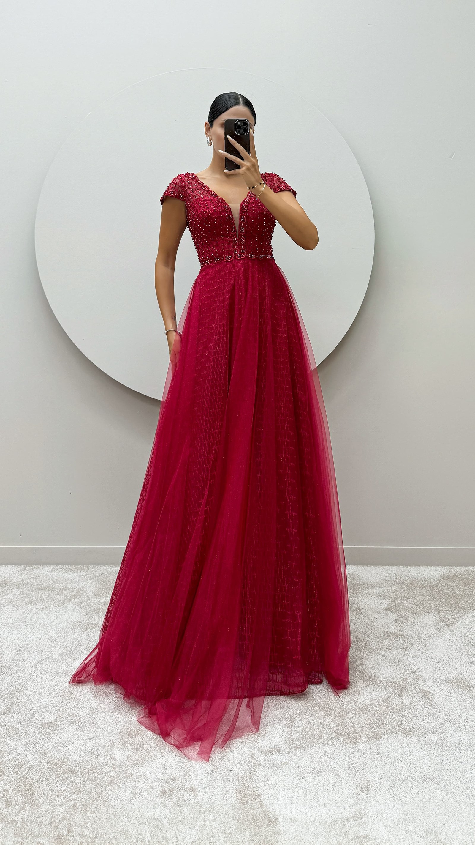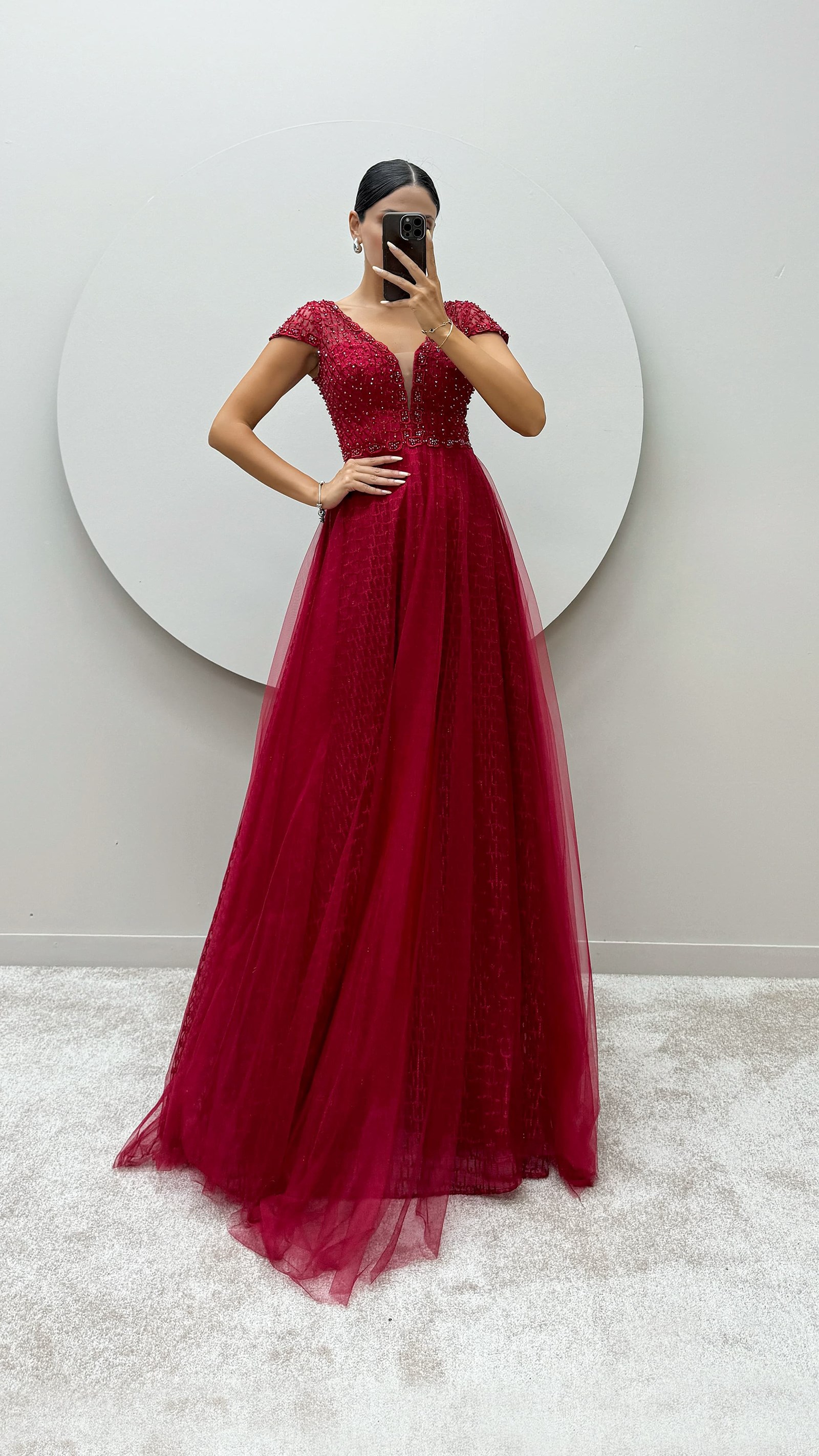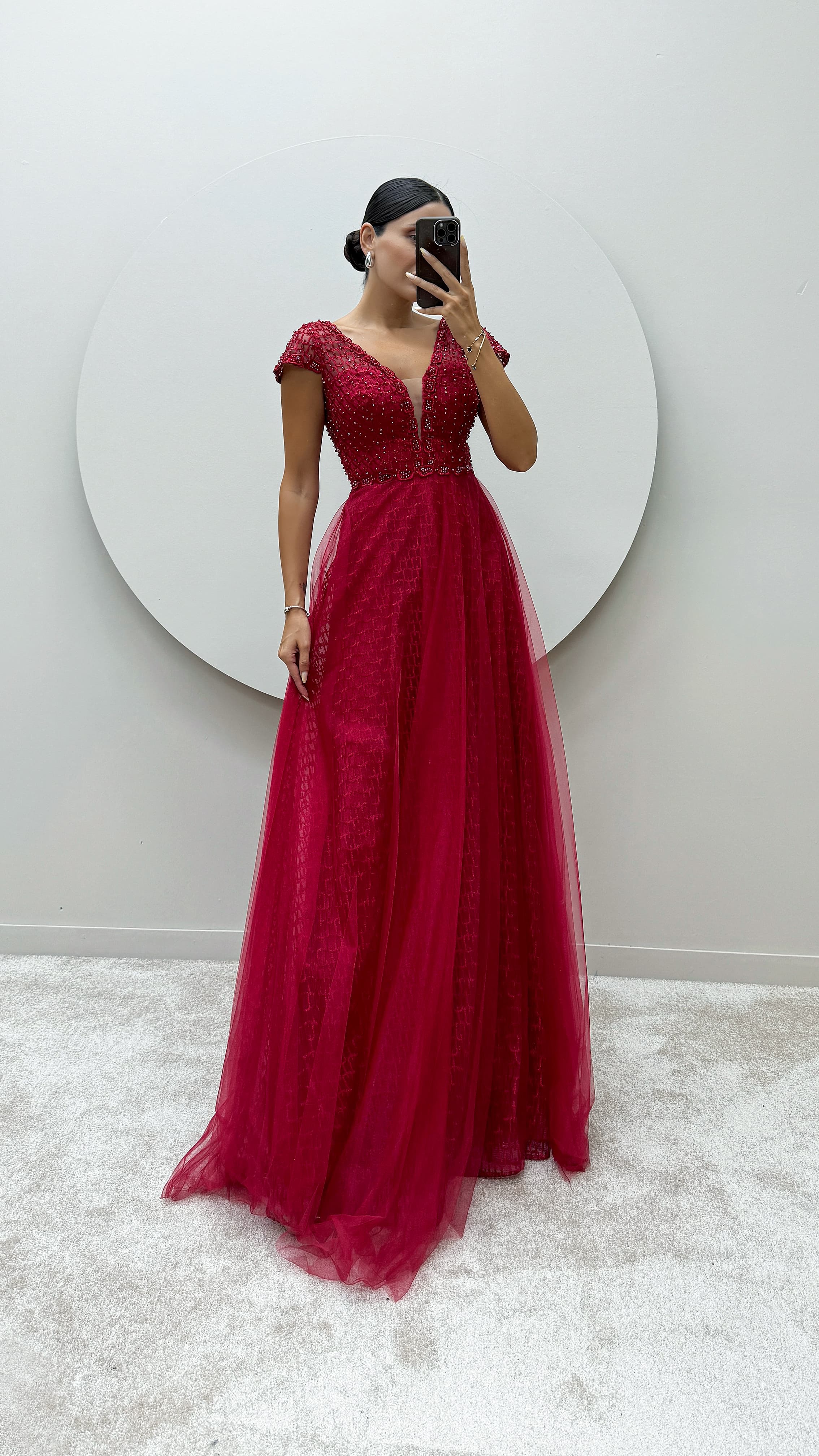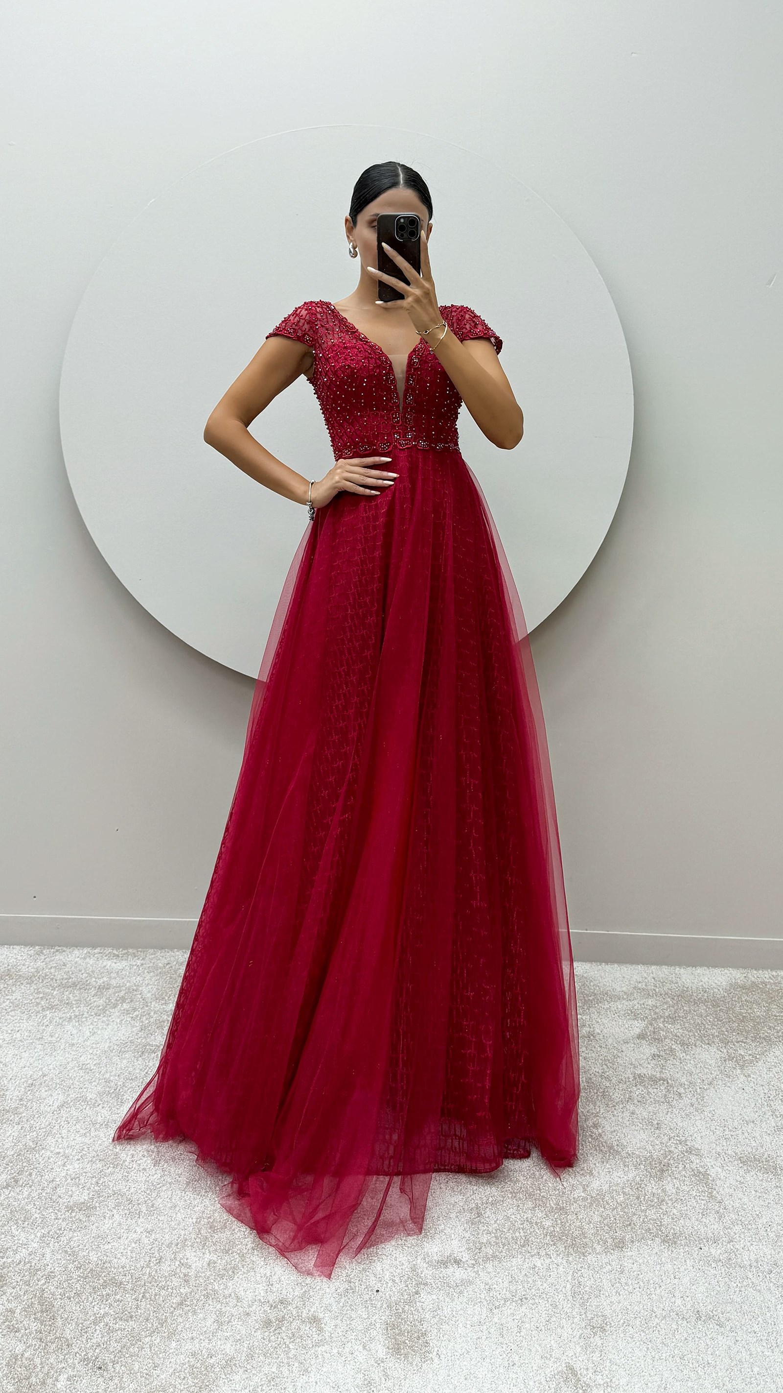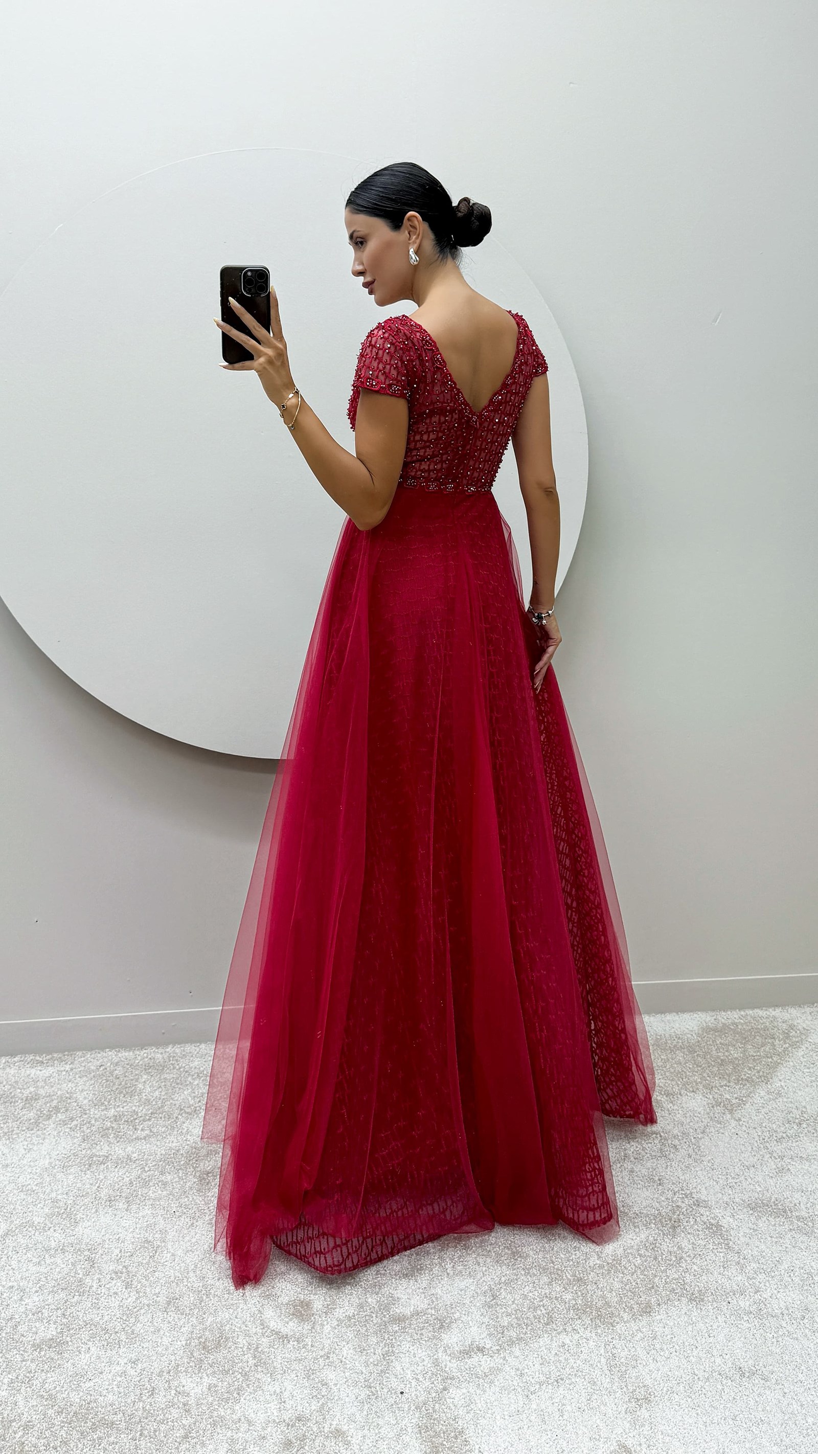 Kırmızı Göğüs Detay İşlemeli Tasarım Elbise