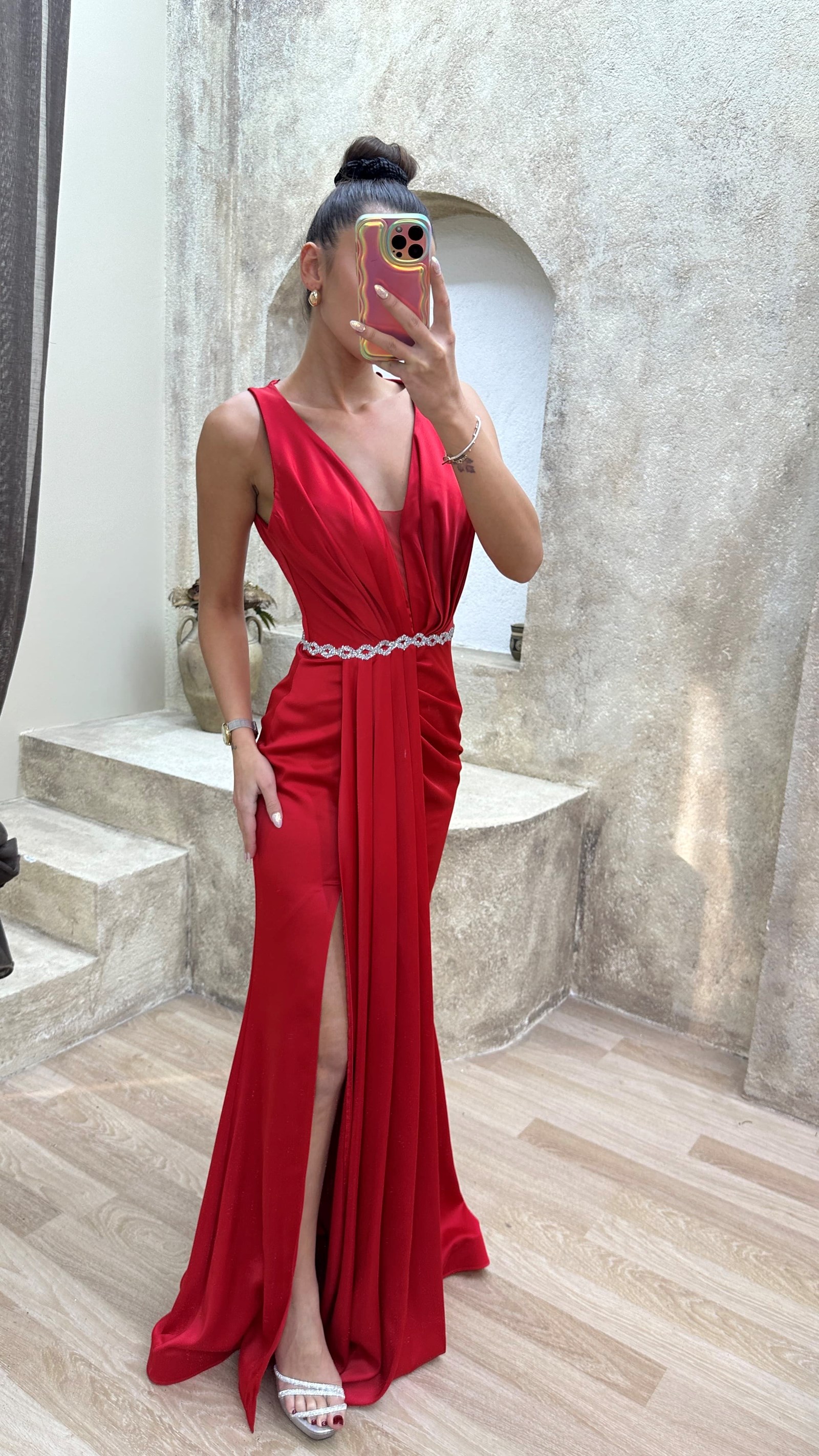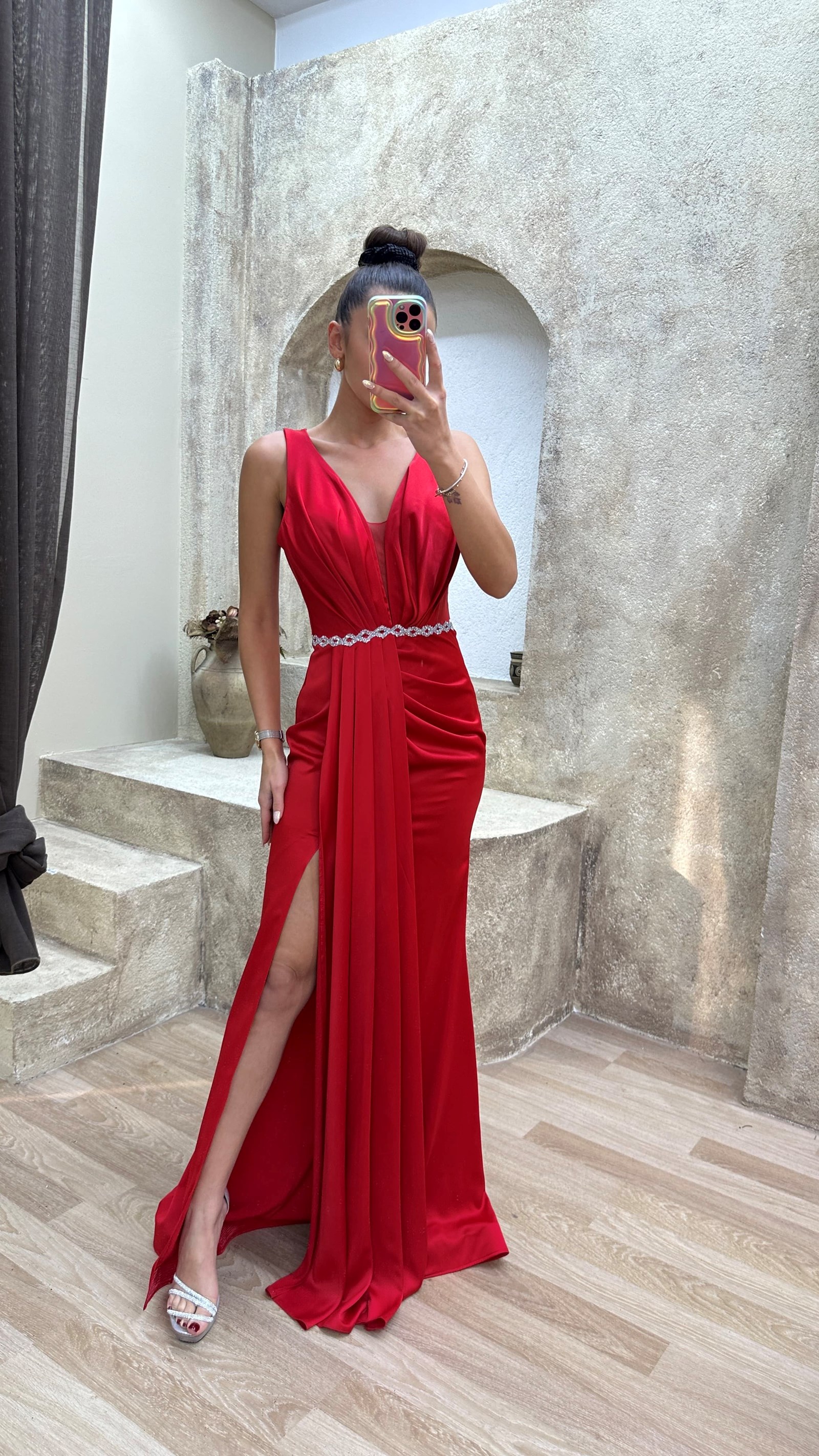 Kırmızı Sırt Detay Yırtmaçlı Drapeli Tasarım Elbise