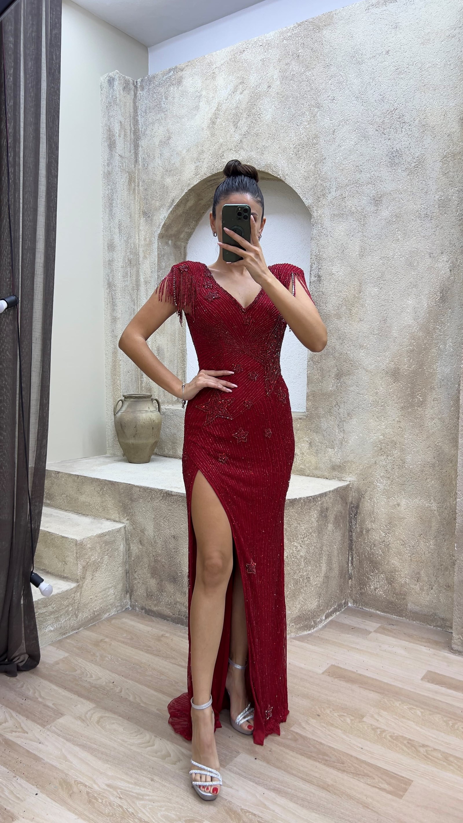 • Kırmızı V Yaka Sırt Detay Özel İşleme Tasarım Abiye Elbise