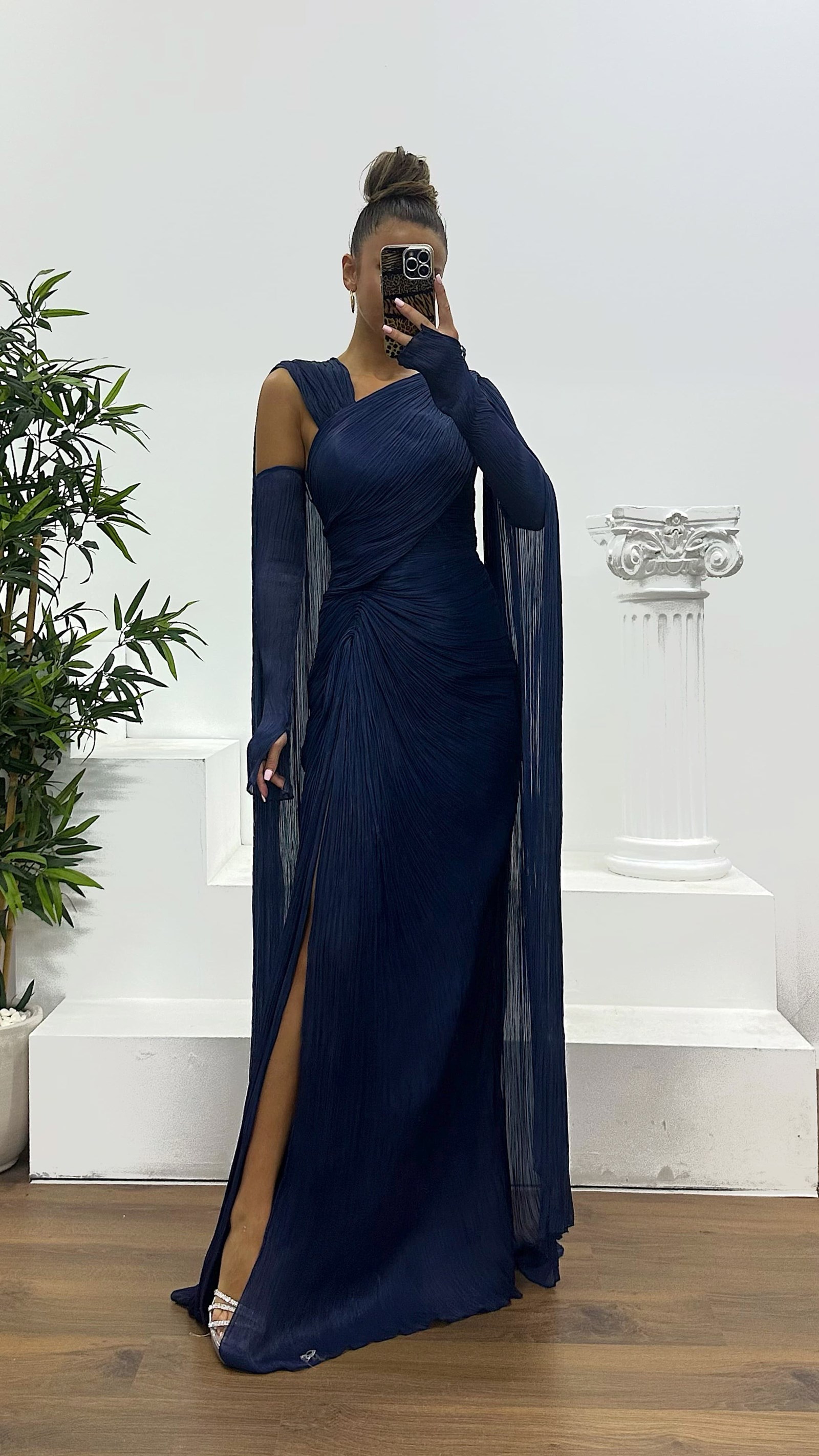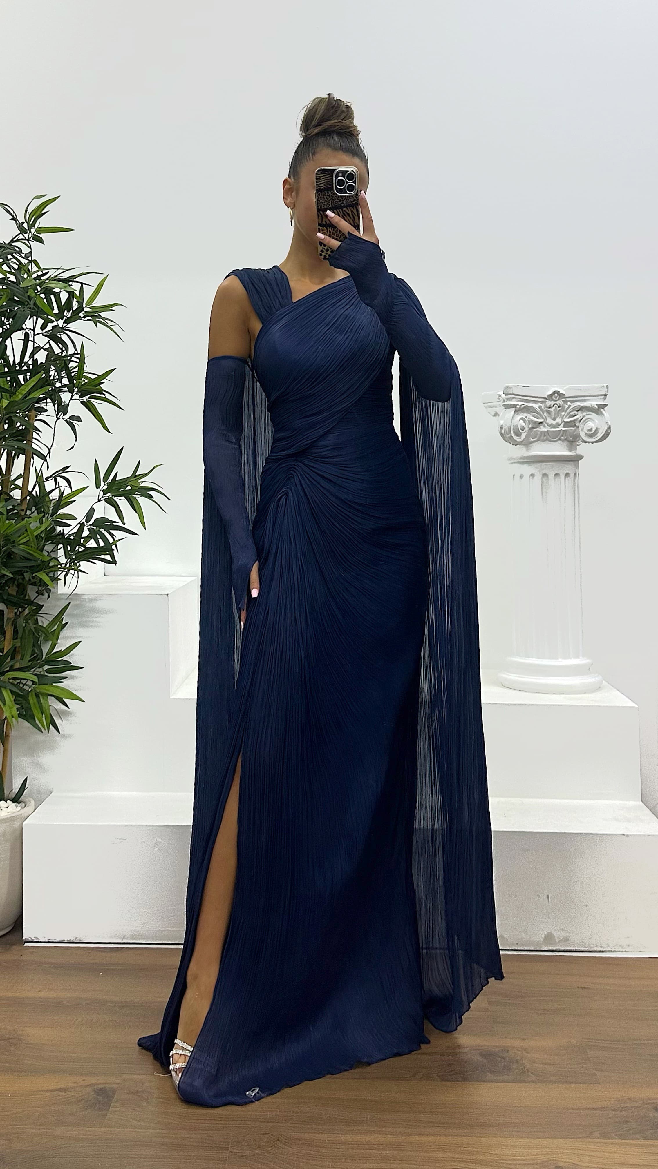 The crinkle evening dress is designed to fit sizes 36–44. It features padded cups, full lining, a back zipper, a slit, and   elegant glove details. Length: varies between 170–175 cm. Fabric: crinkle — 70% viscose, 30% polyester. An ideal   choice to stand out with your elegance at weddings, engagements, graduations, or special events.