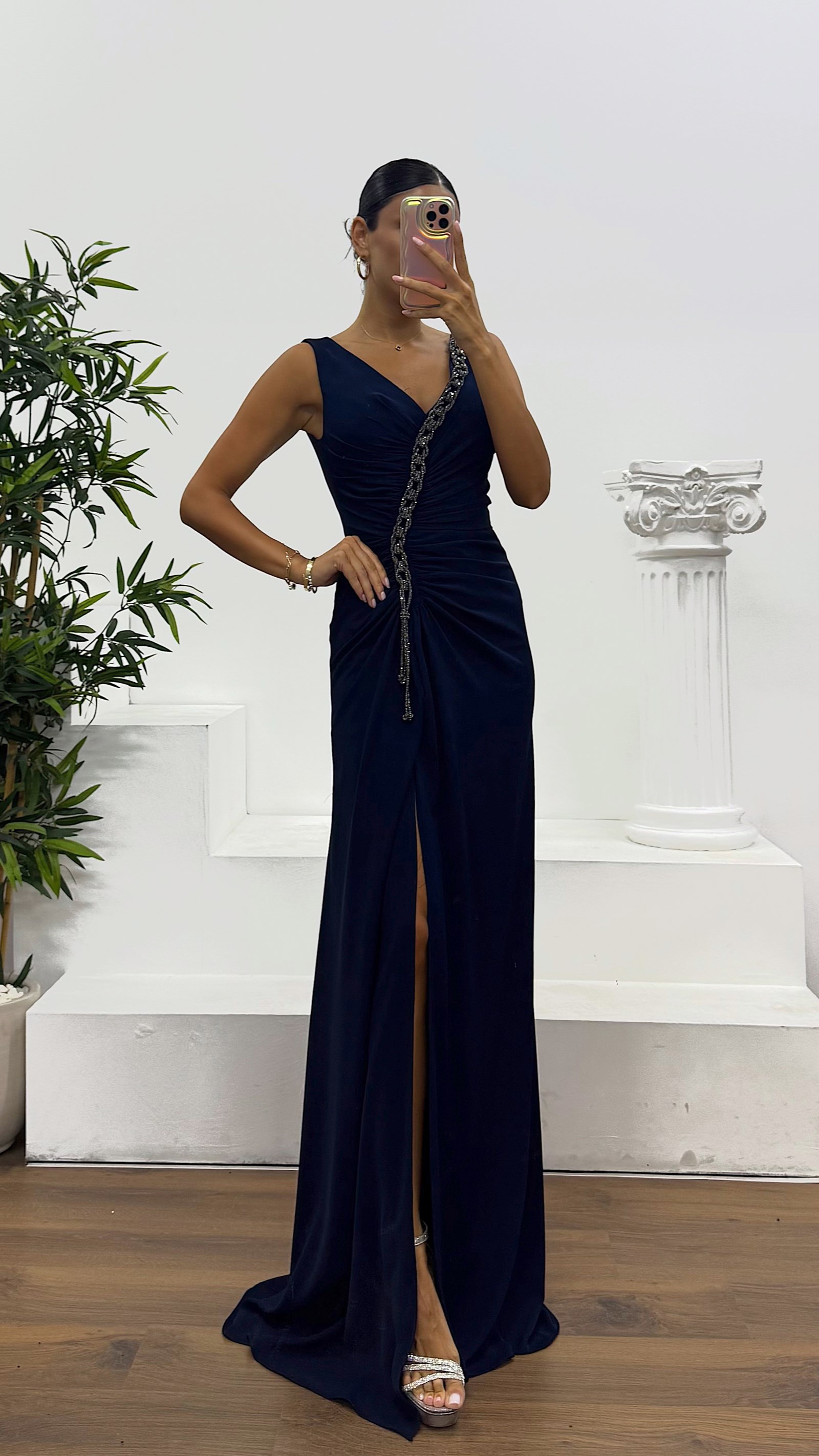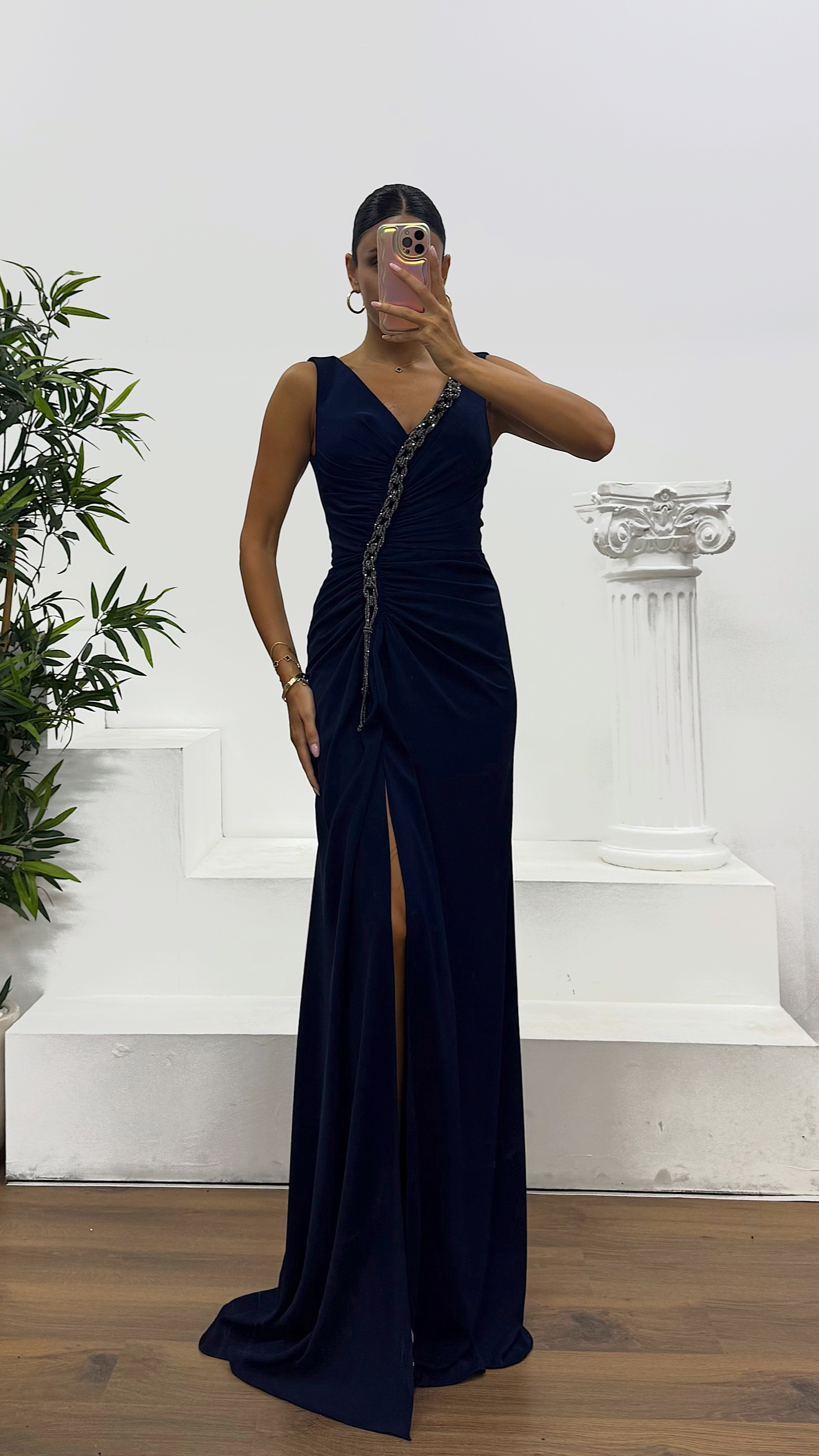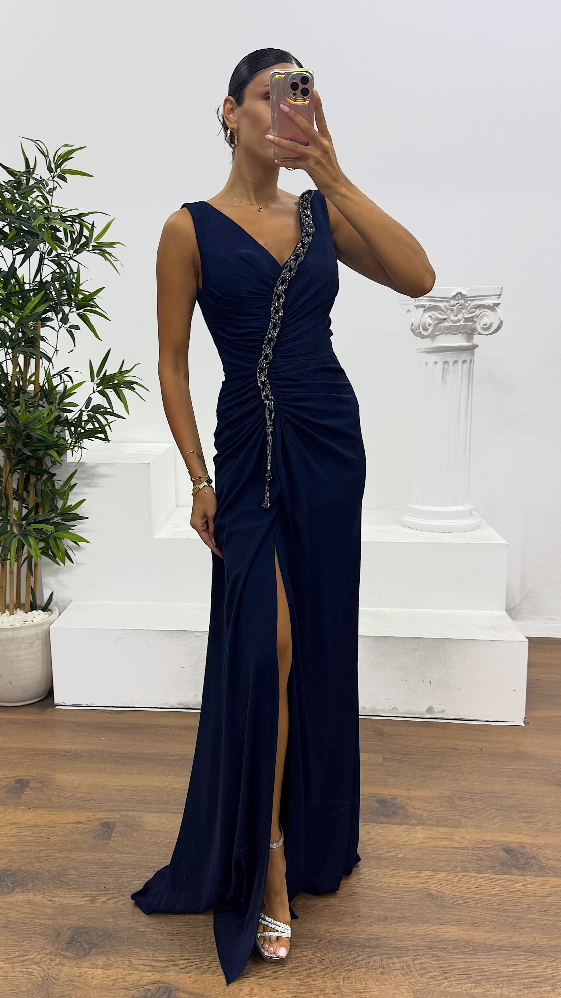 V-Neck Evening Dress with Chain Detail This elegant evening dress is designed to fit sizes 36 to 42. It features built-in bust pads, full lining, a back zipper closure, a front slit, and stylish chain details. Dress length: May vary between 175 and 170 cm. Fabric type: Atlas, 100% polyester.