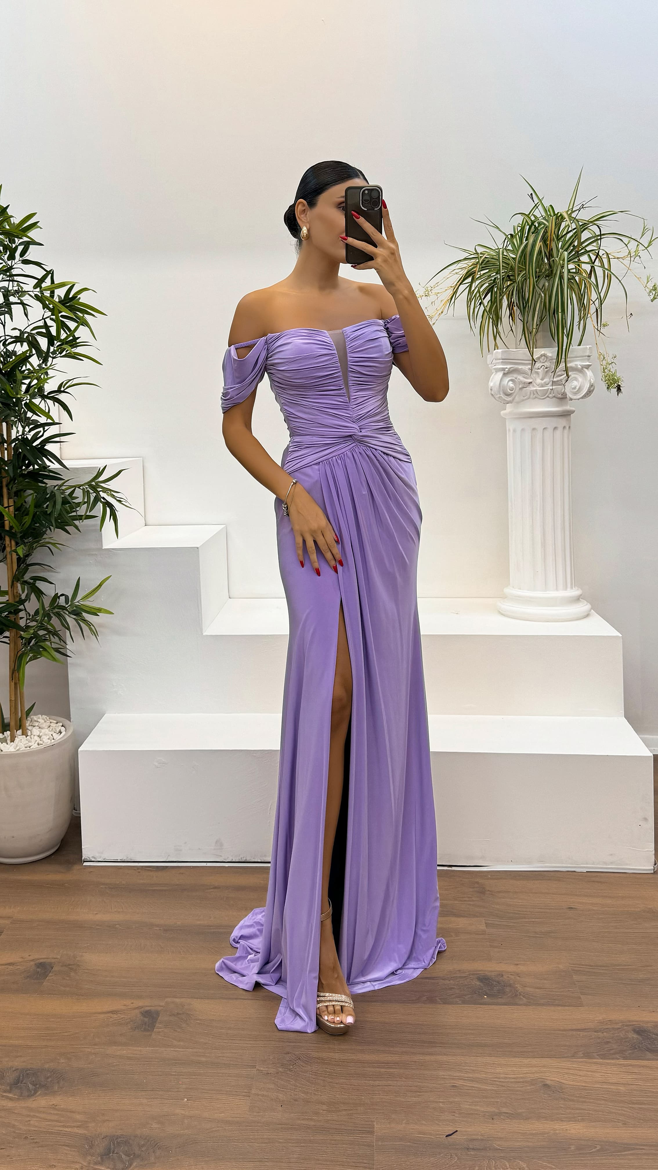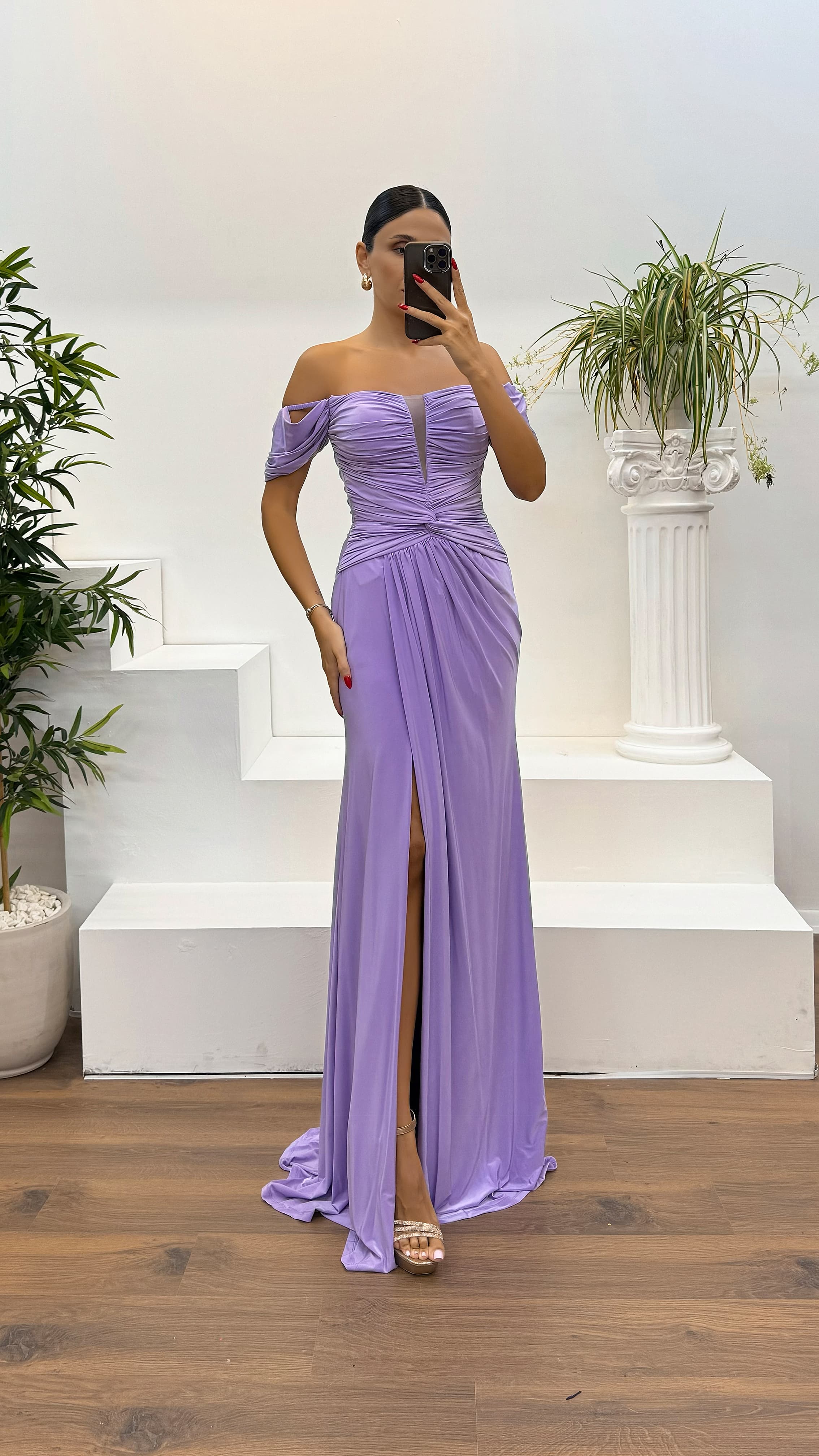 • Lila Kayık Yaka Drapeli Abiye Elbise