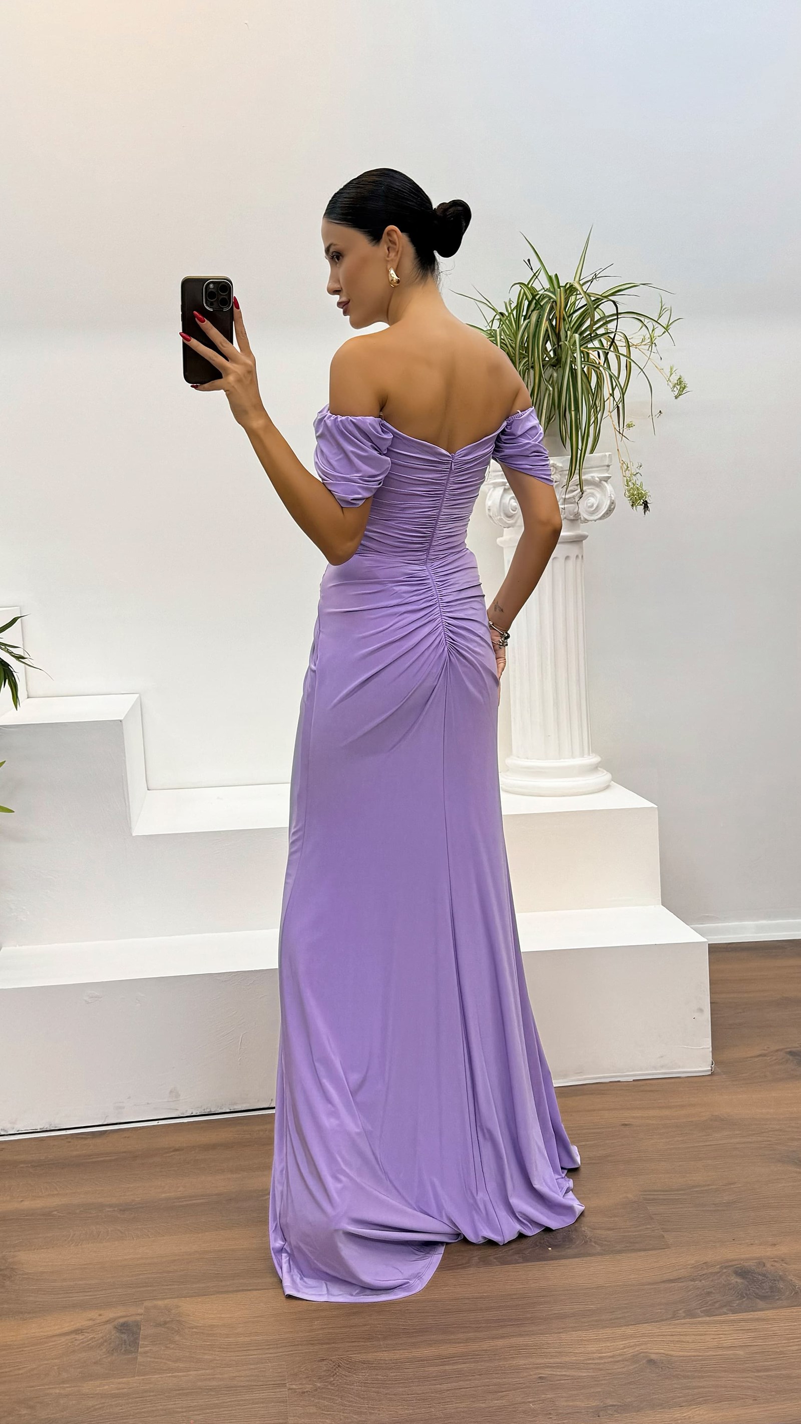 Lila Kayık Yaka Drapeli Abiye Elbise