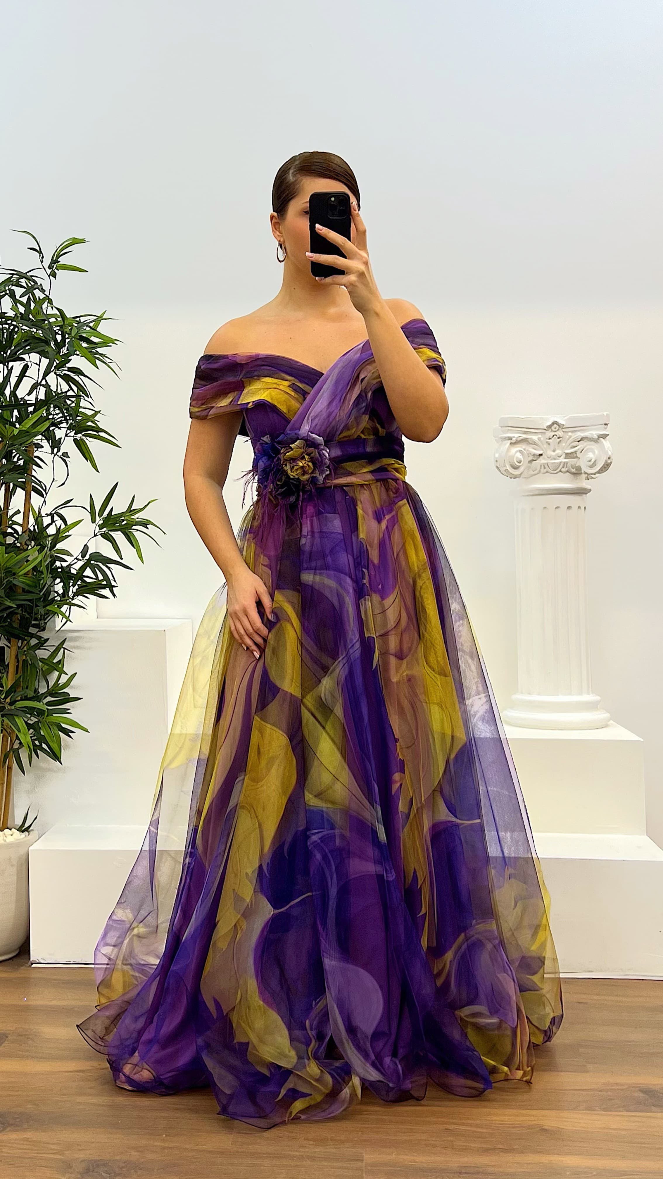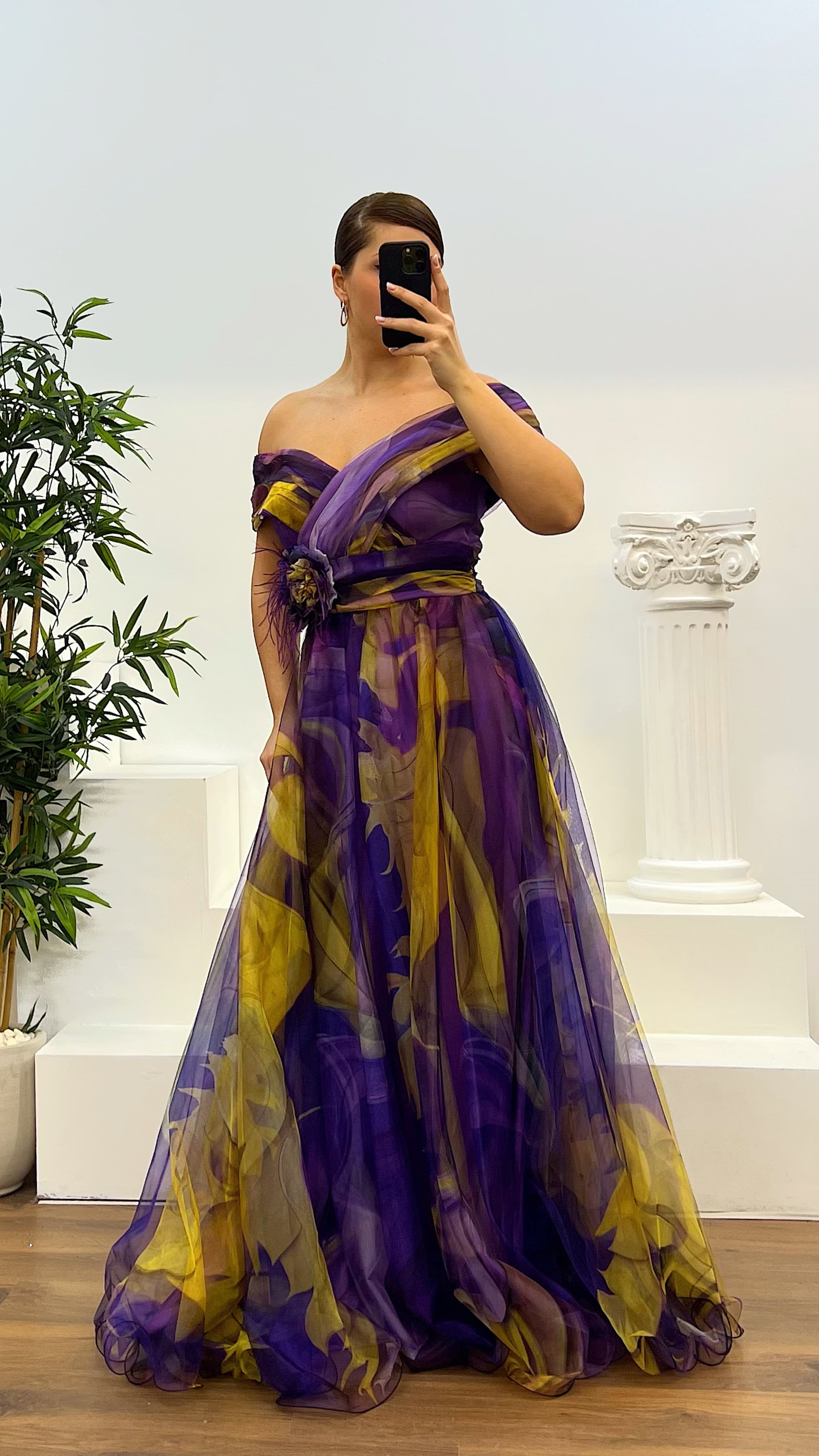 Madonna Neck Design Patterned Tulle Evening Dress The product is compatible with sizes 44-48, featuring breast pads, lined, with a back zipper closure, a slit, and designed with waist details as an evening dress. Product length: 170-175 cm. Fabric type: Tulle 3% Lycra, 97% Polyester.