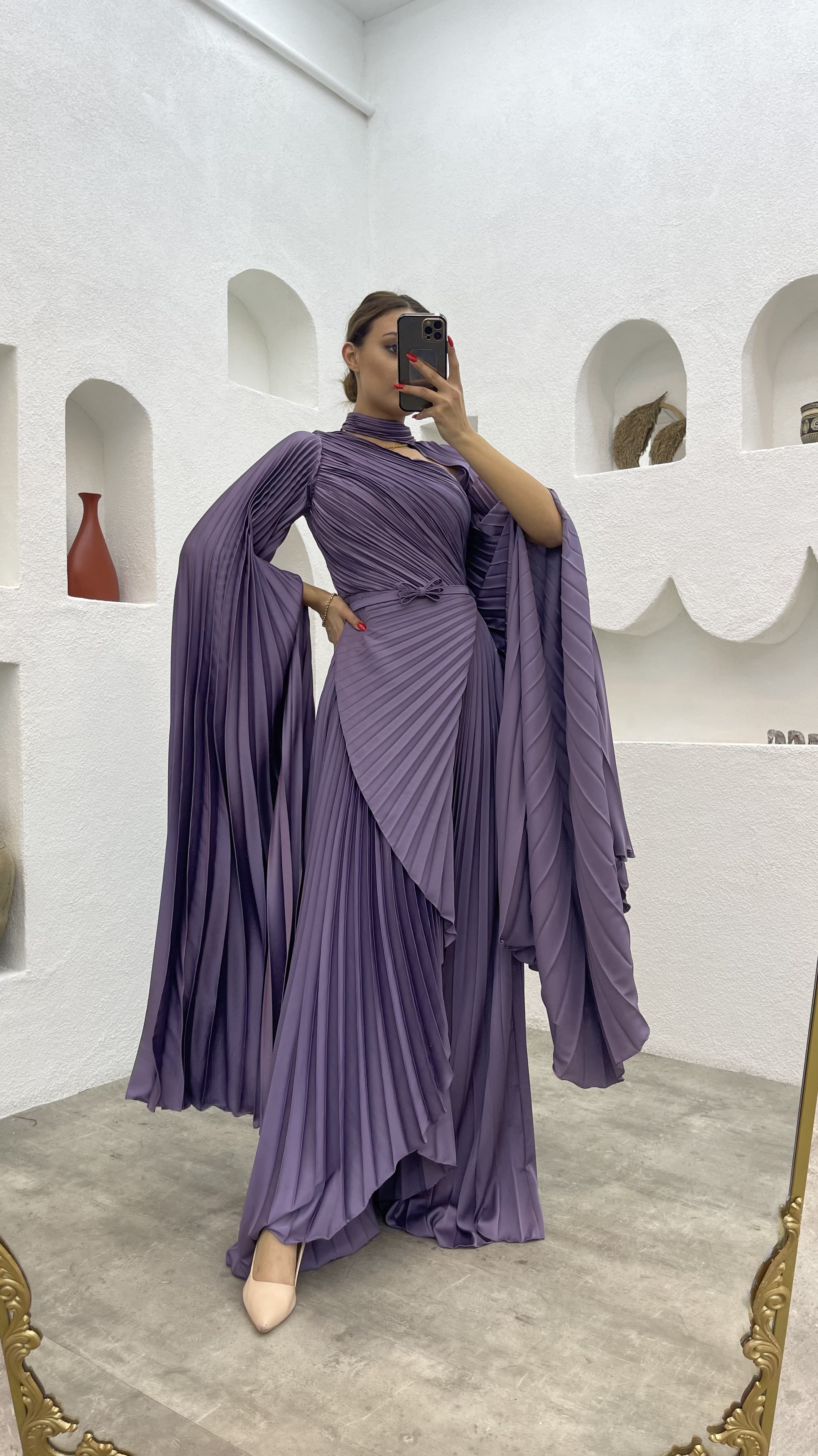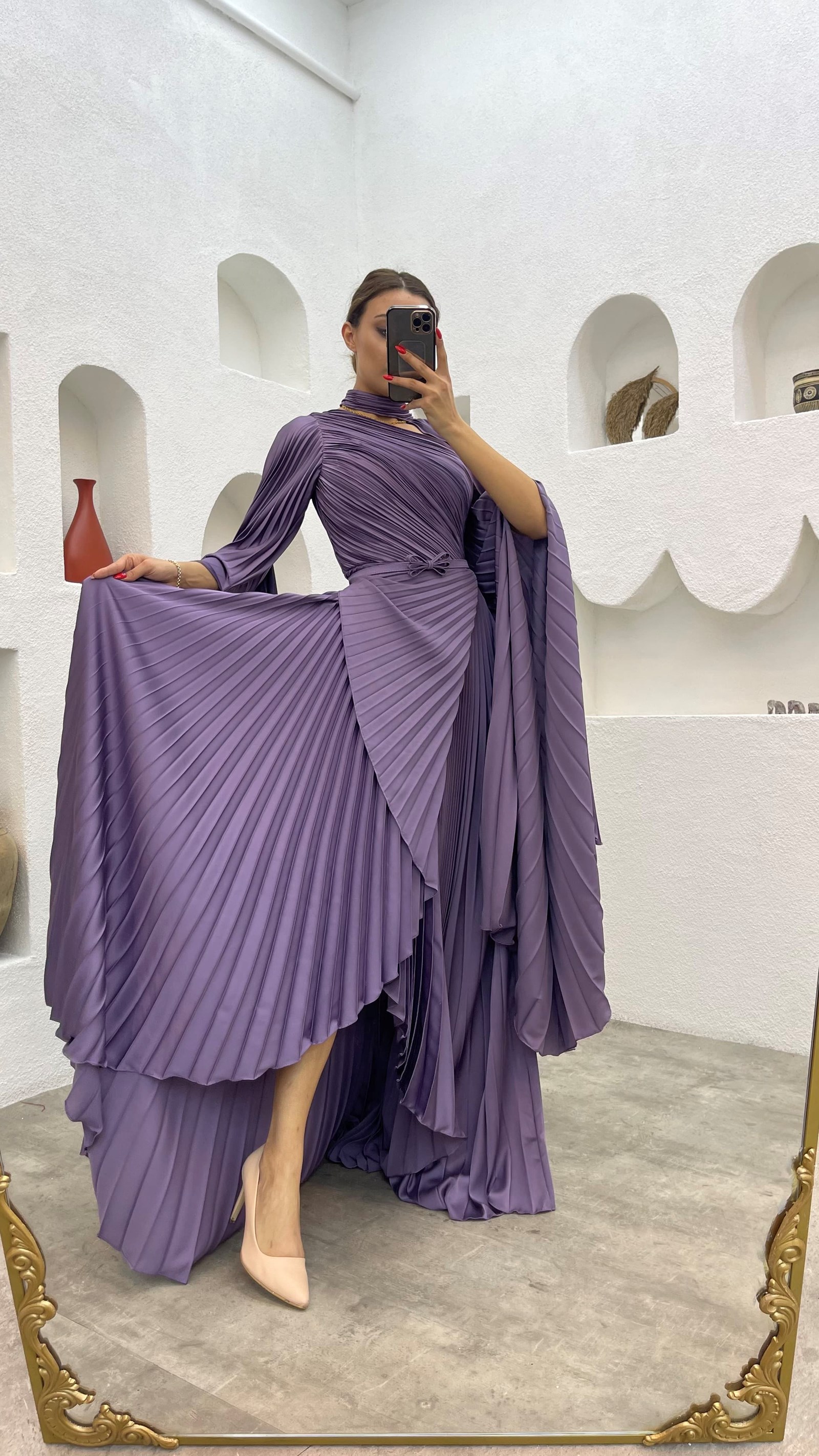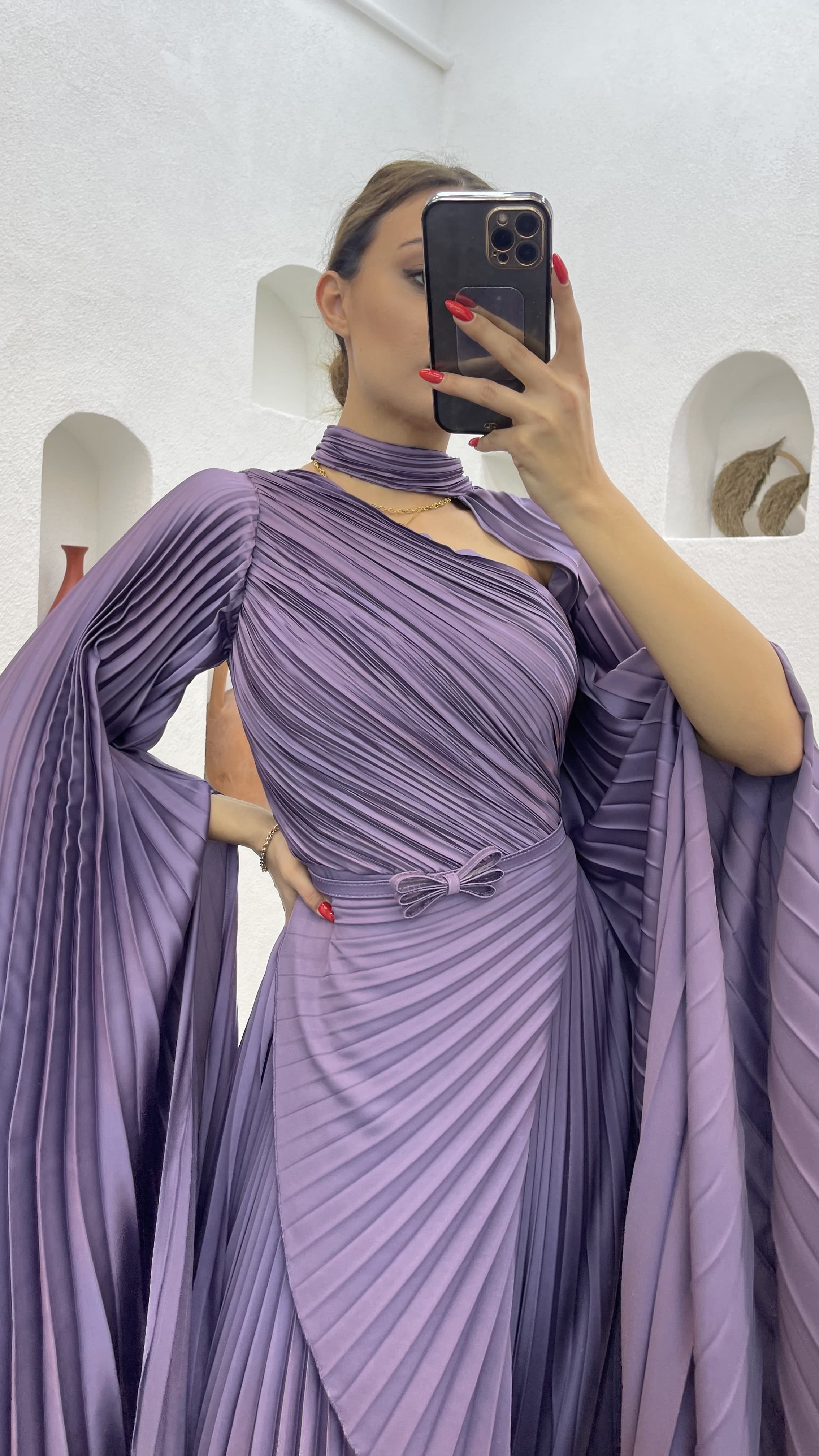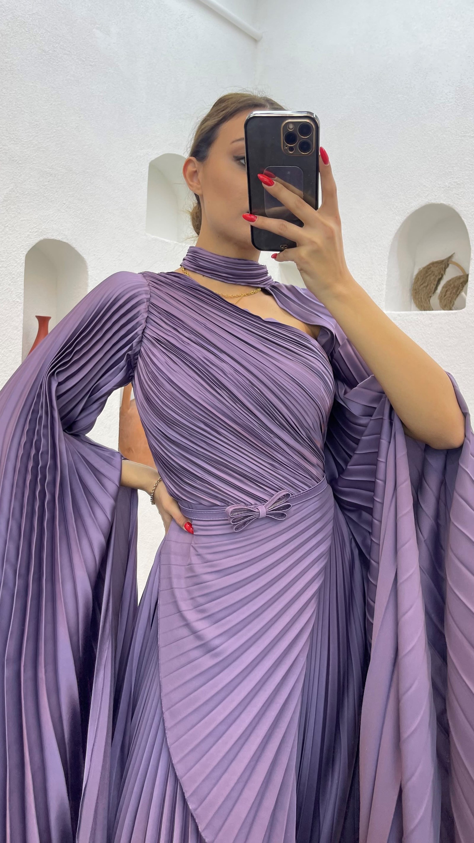 • Lila Piliseli Tek Omuz Saten Abiye Elbise