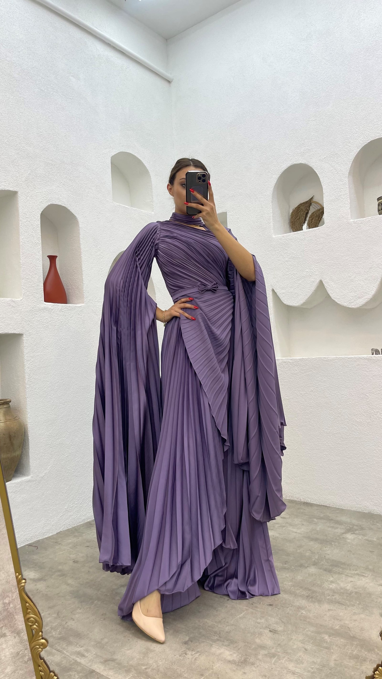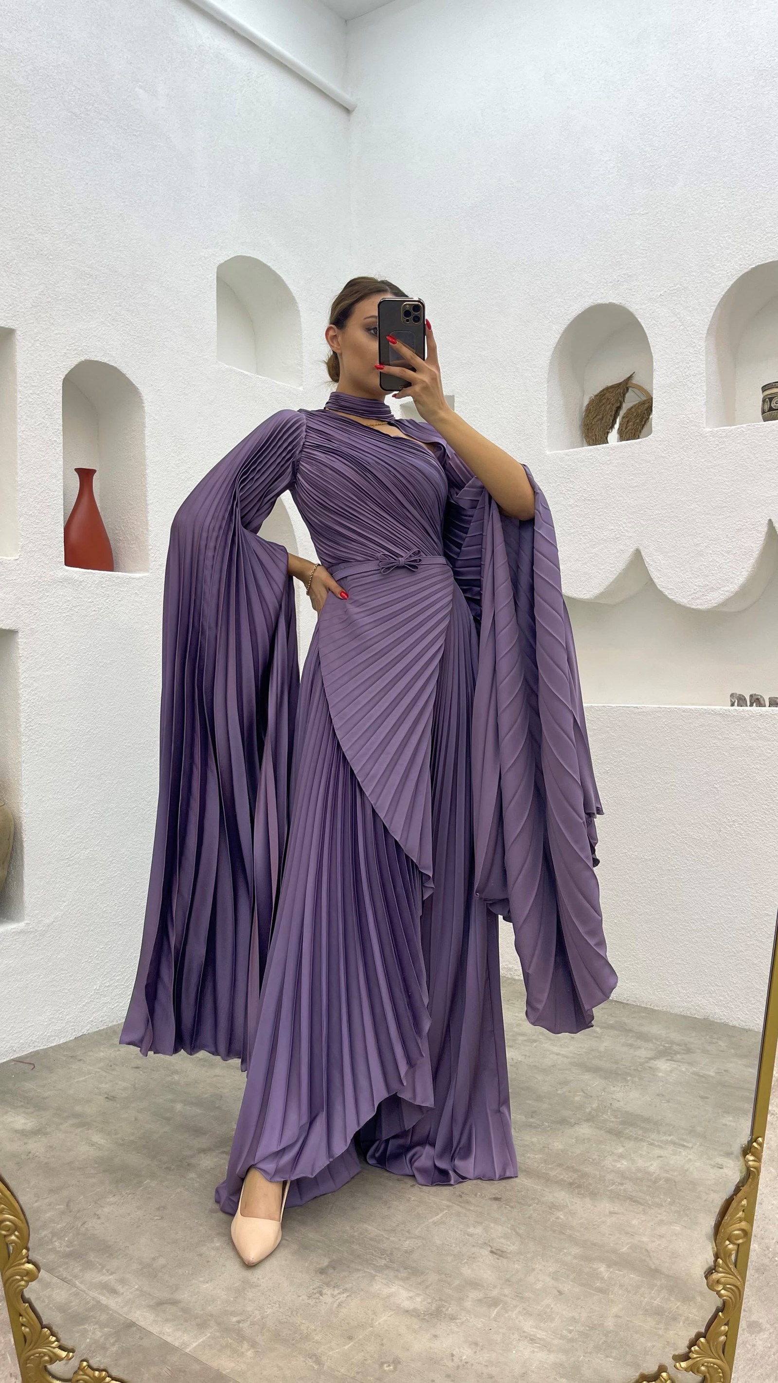 • Kırmızı Pelerinli Piliseli Kemerli Saten Abiye Elbise