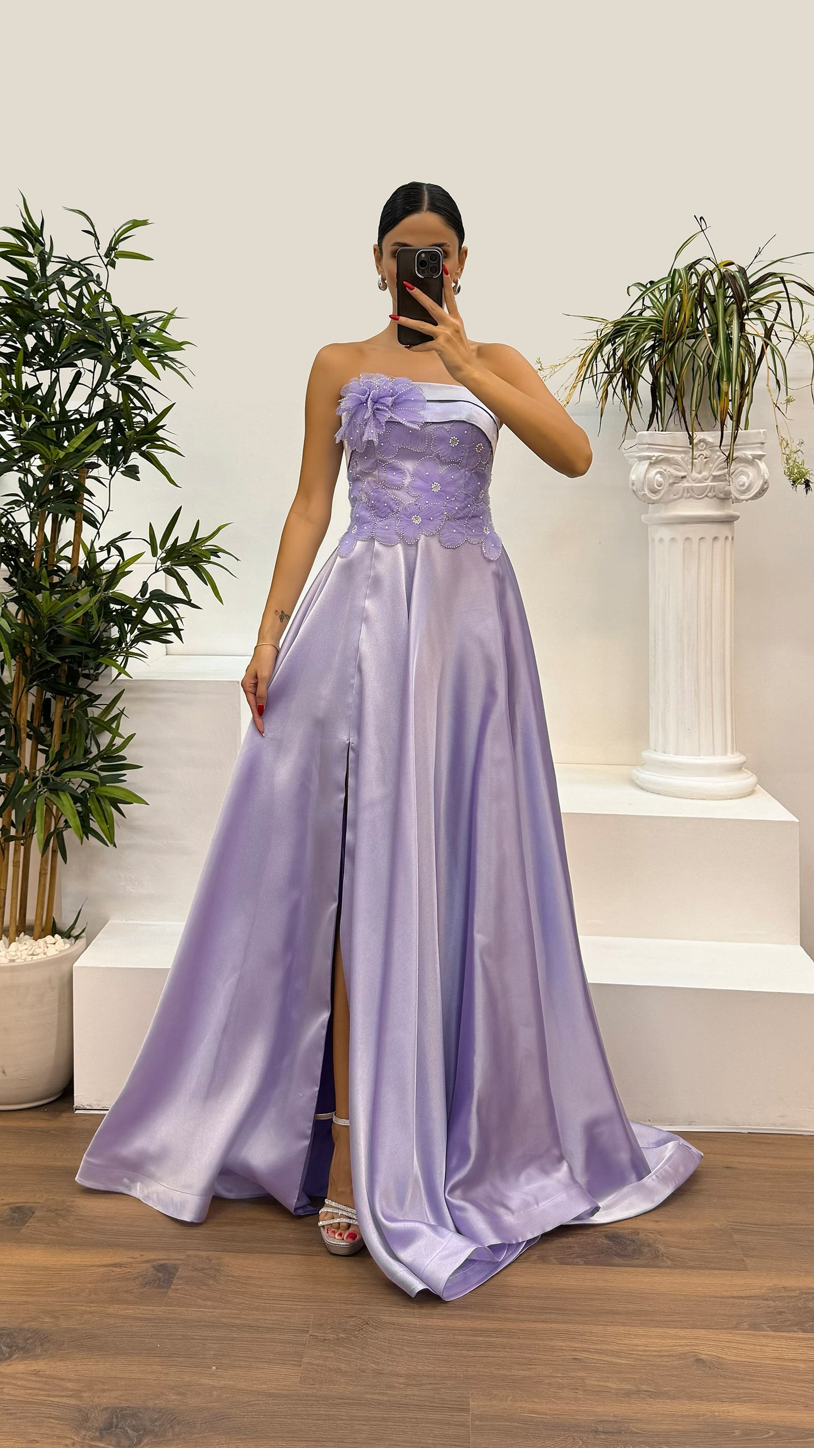 • Lila Straplez Çiçek İşlemeli Saten Abiye Elbise