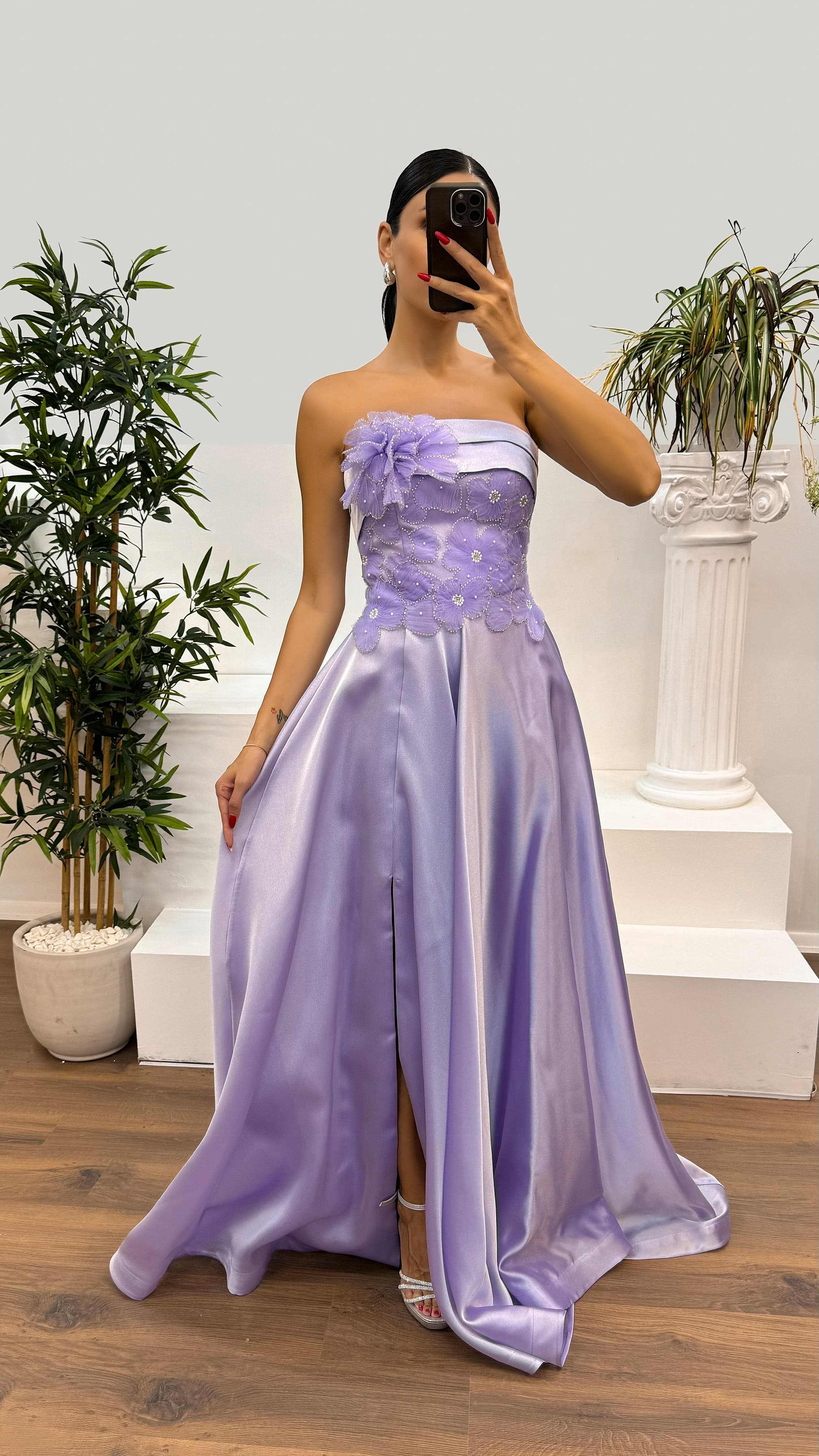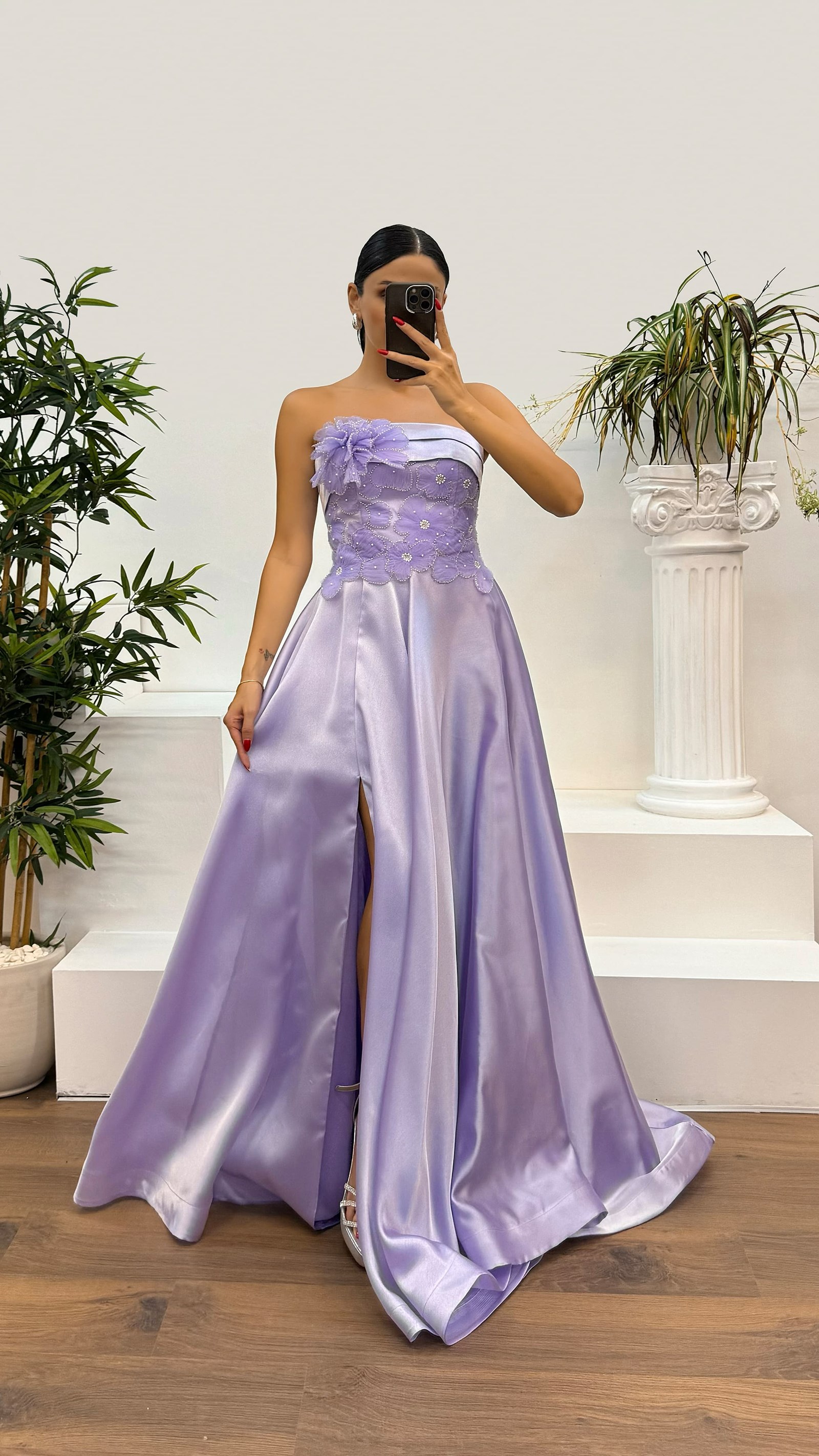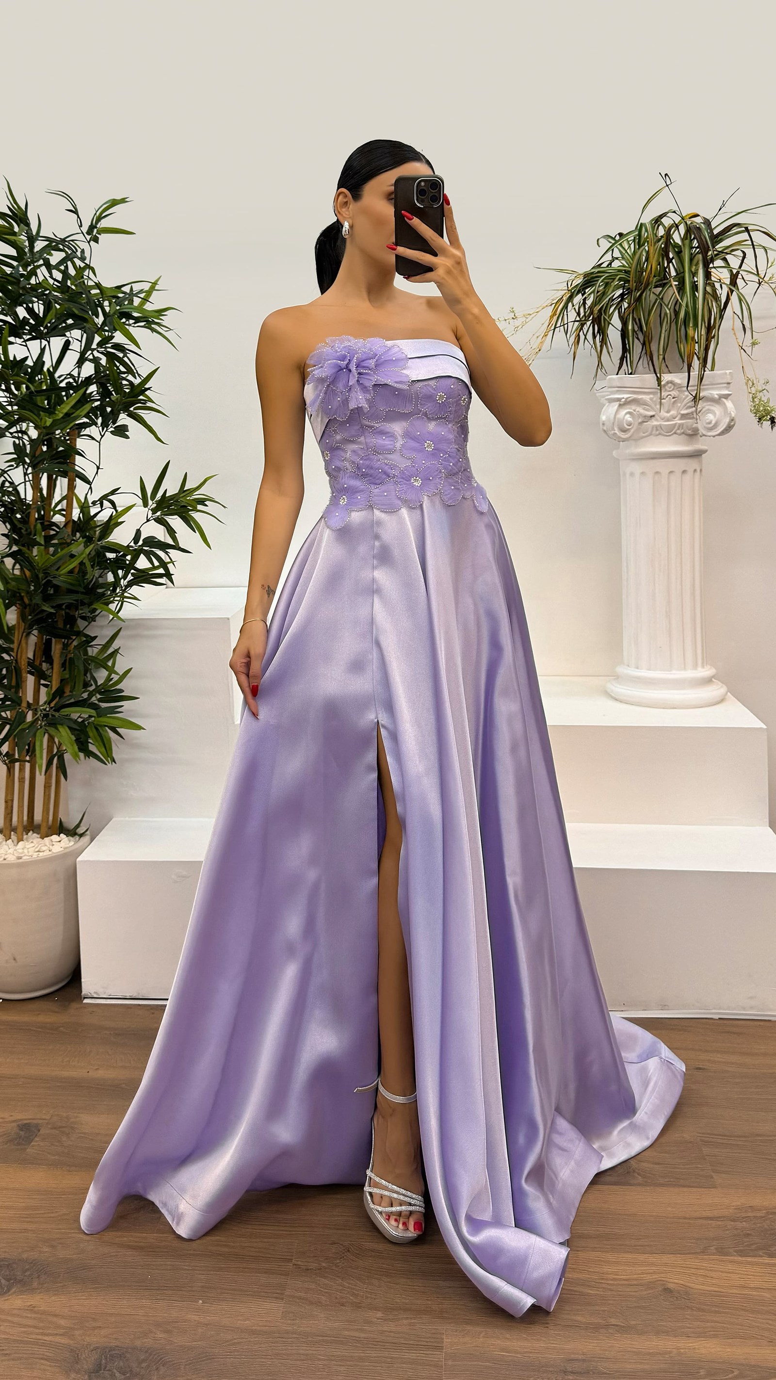 Lila Straplez Çiçek İşlemeli Saten Abiye Elbise