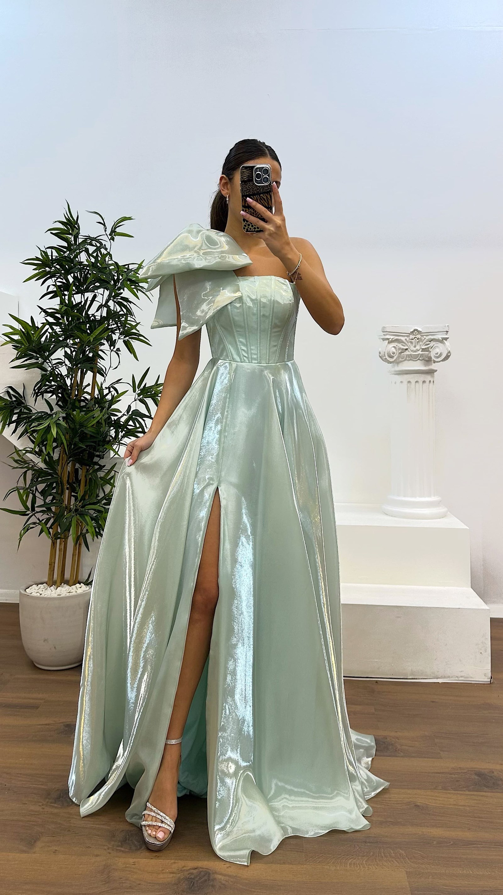 Shoulder Detail Evening Dress The product is compatible with sizes 36-44, featuring built-in breast pads, lined, with a cross strap and zipper closure at the back, designed as an evening dress with shoulder details, and a slit. The dress length may vary between 165-170 cm. Fabric type: Organza satin, 100% polyester.