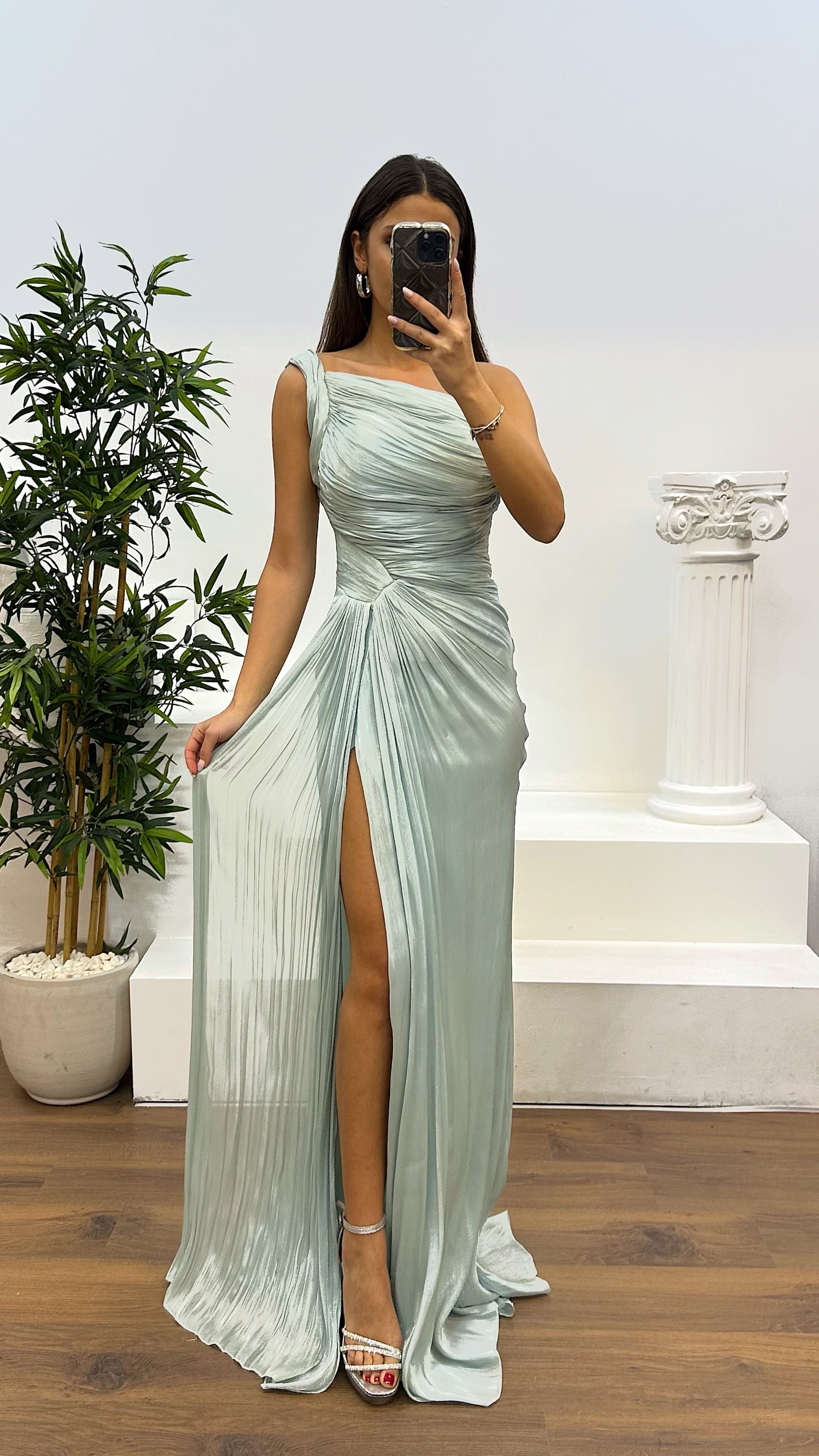 One shoulder drape detail evening dress The product is designed as a one-shoulder, draped evening dress with chest pads, lining, slit, one shoulder, suitable for sizes 36-44. Product length: May vary between 165-170 cm. Fabric type: chiffon 66% viscose 34% polyester