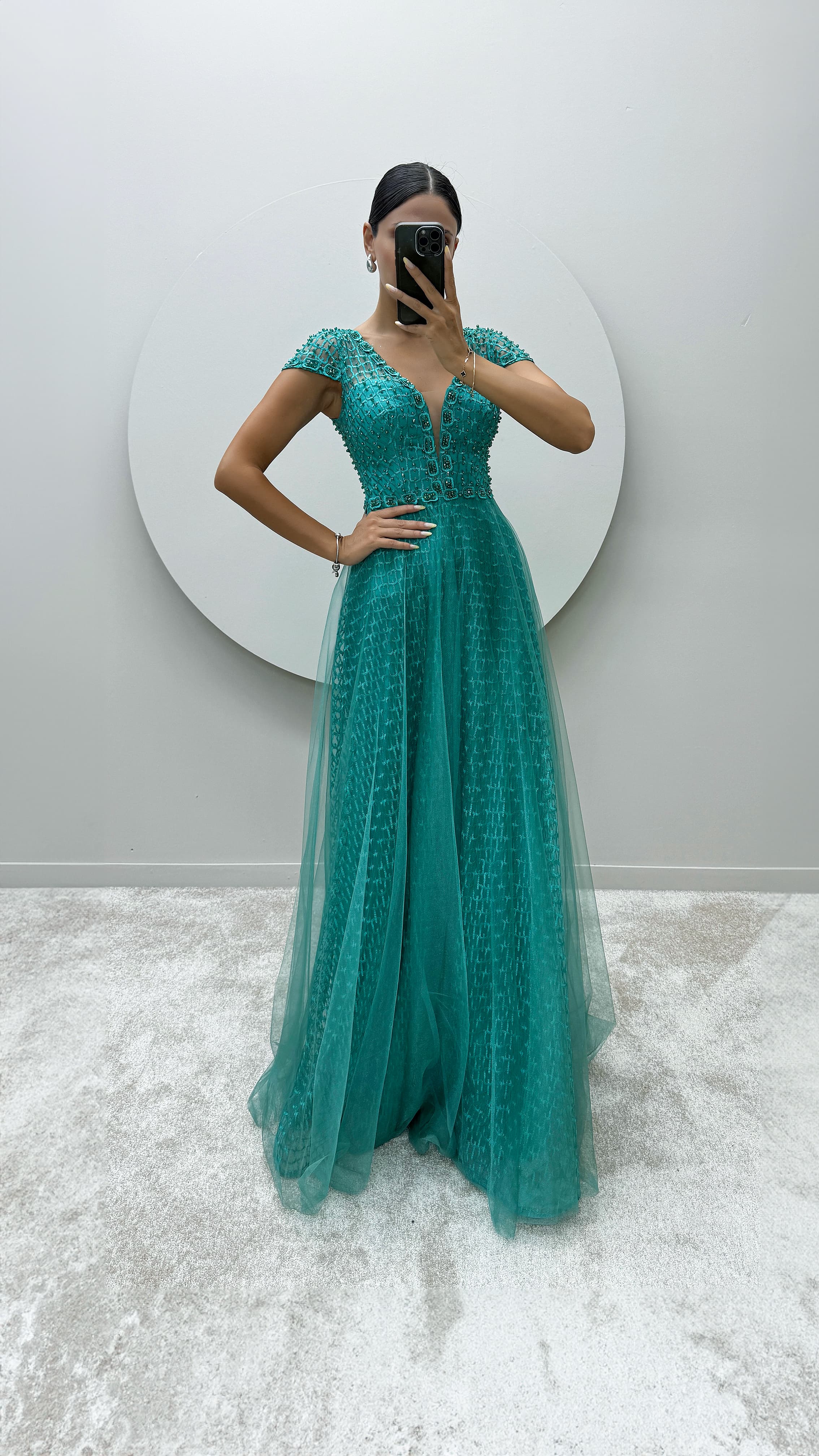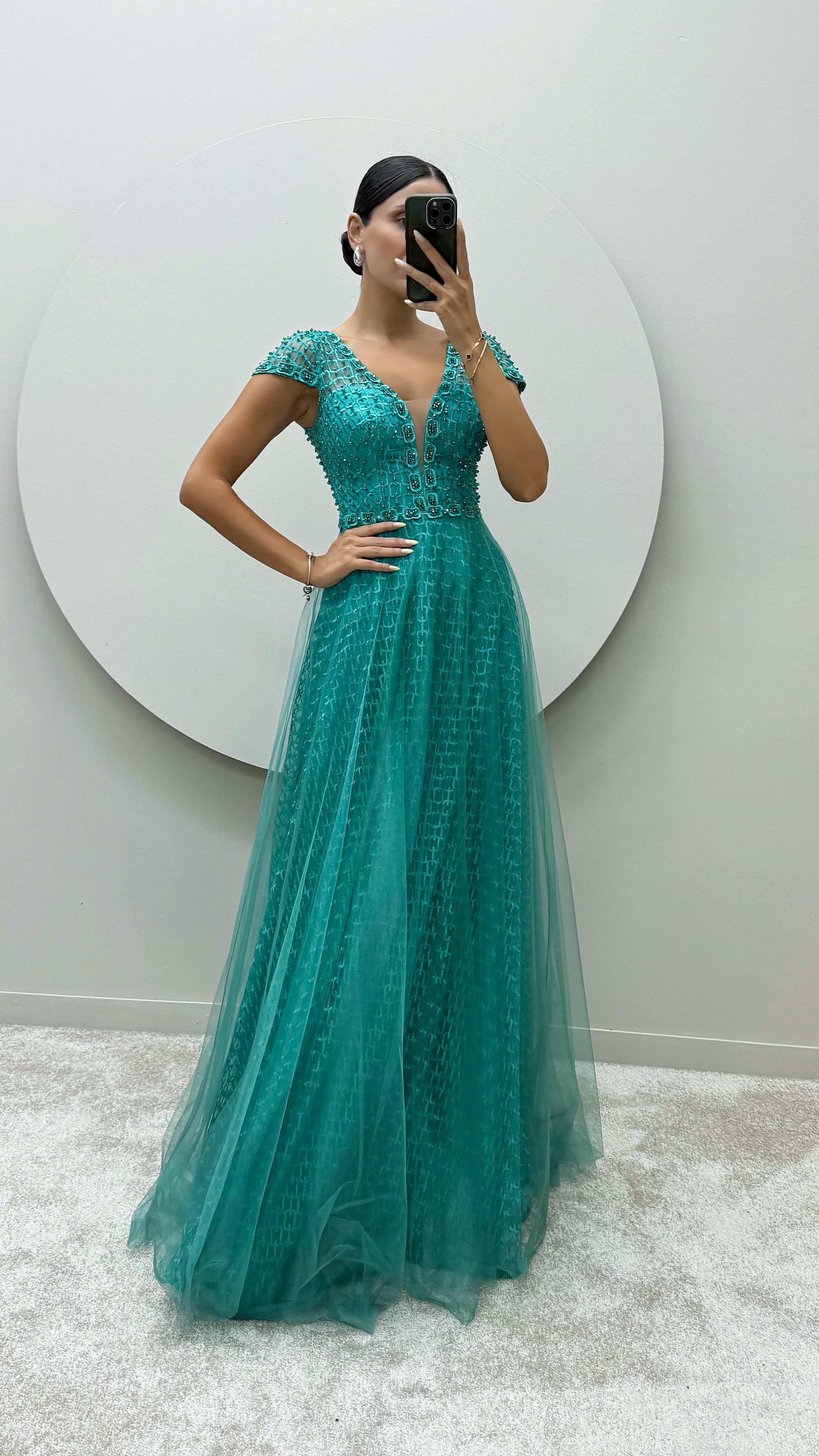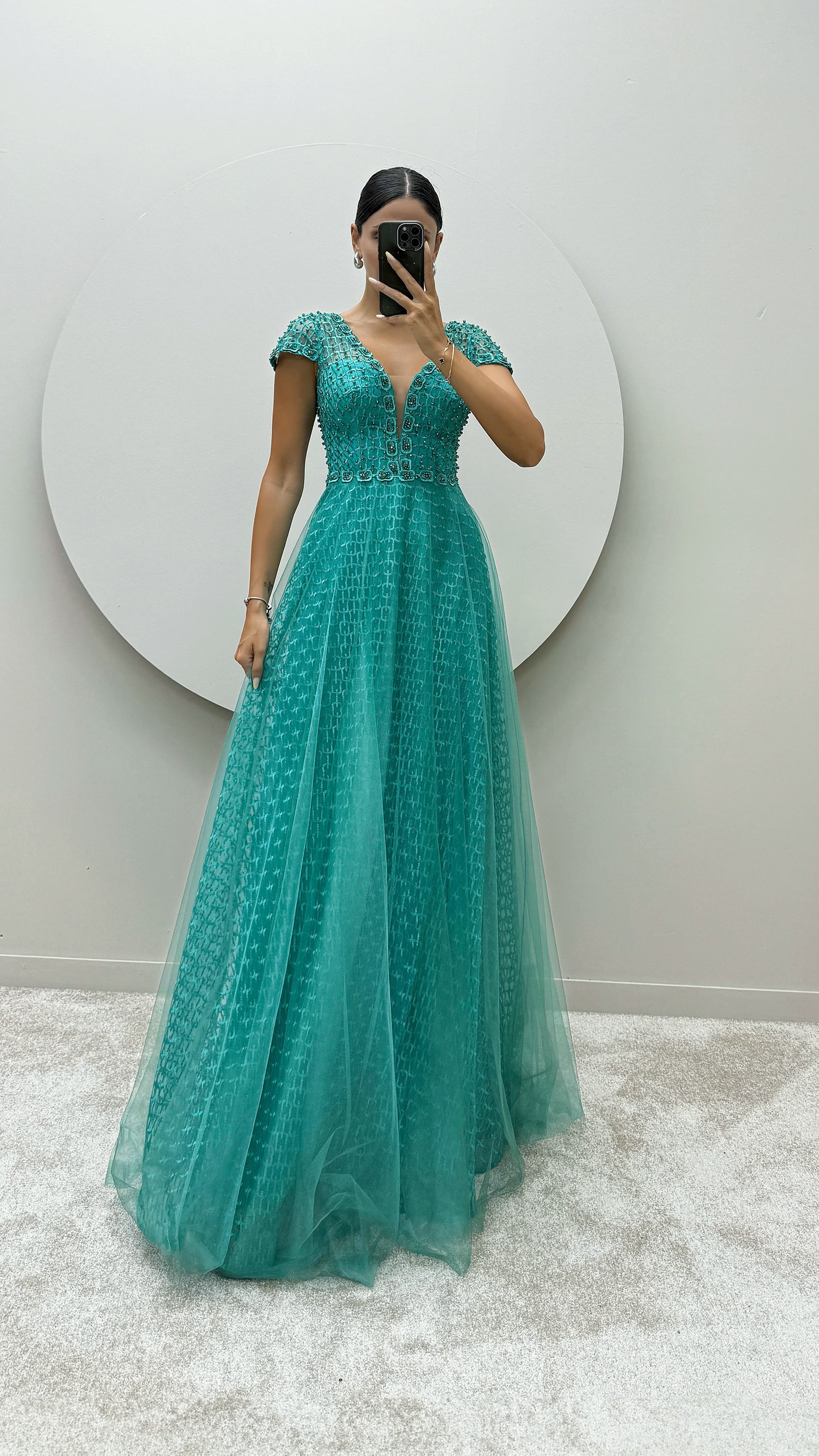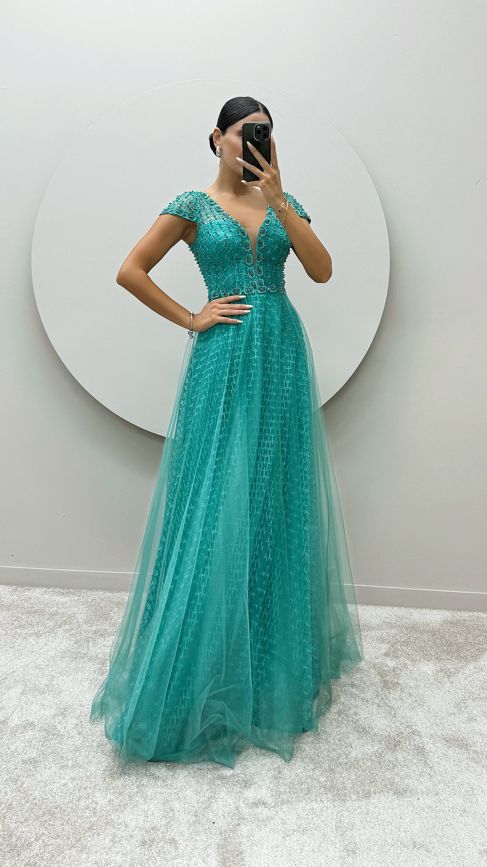 Mint Yeşili Göğüs Detay İşlemeli Tasarım Elbise