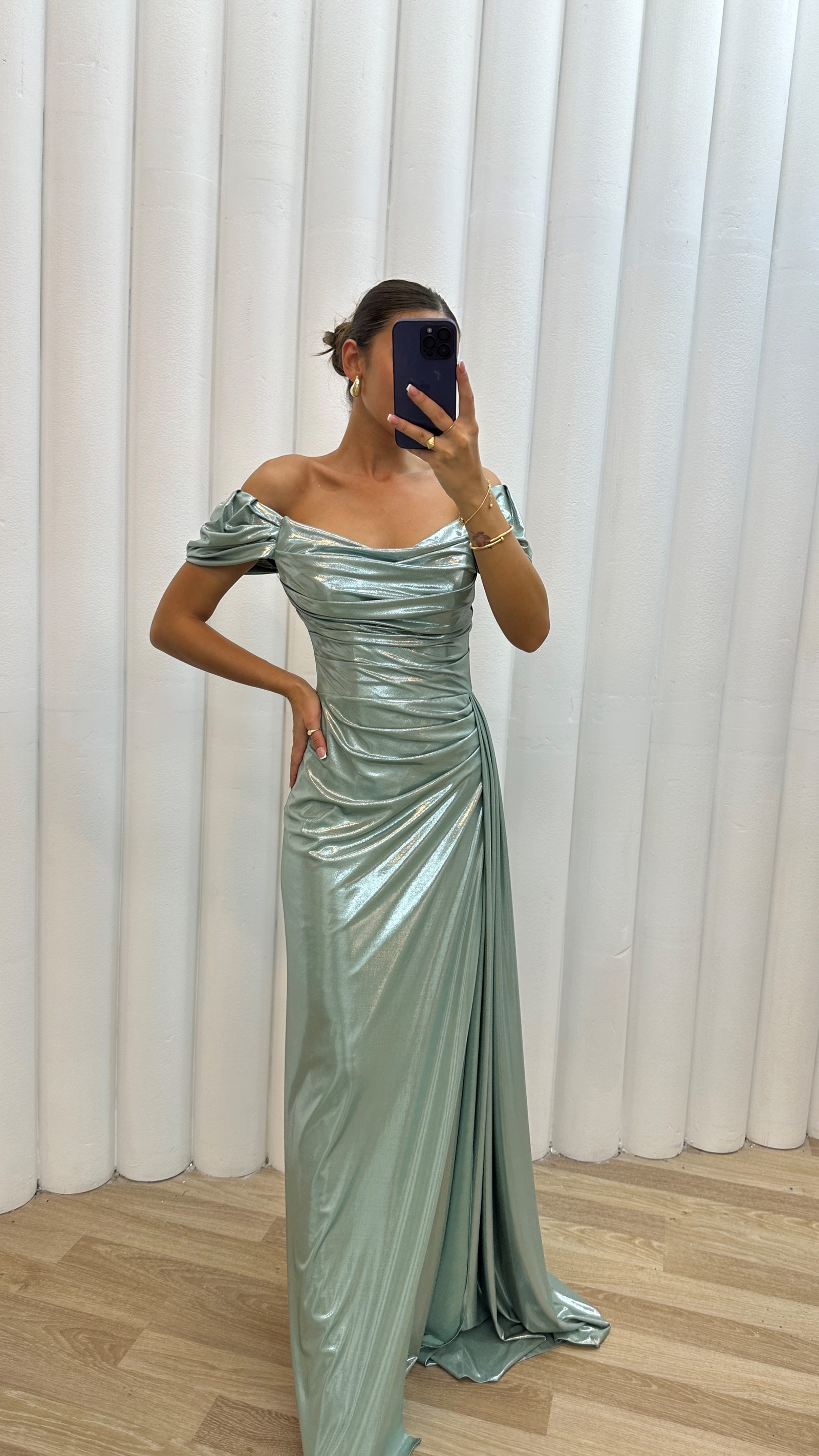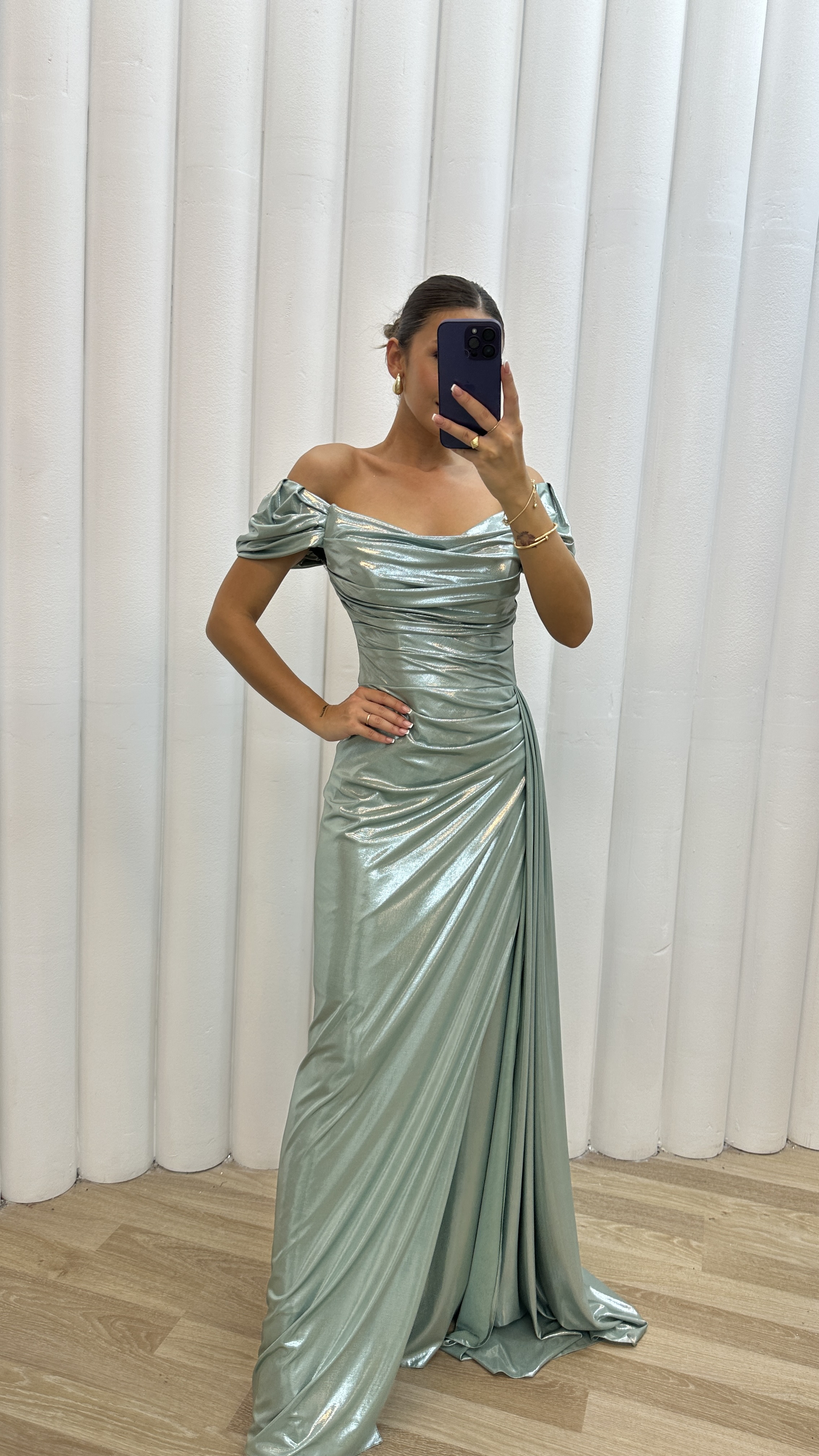 • Mint Yeşili Omuz Detay İşlemeli Drapeli Abiye Elbise