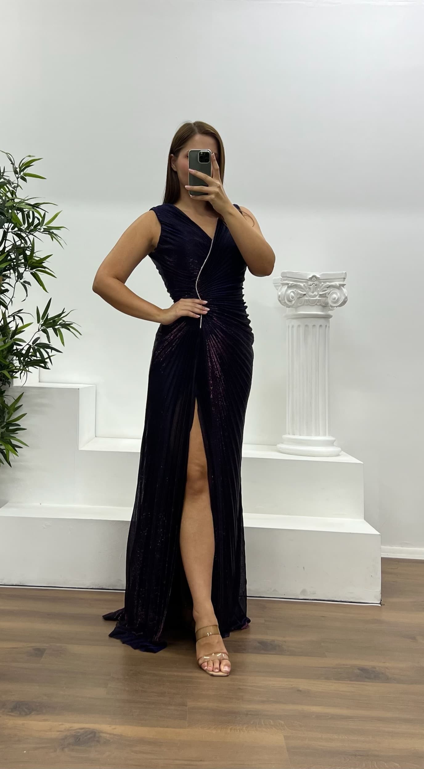 V-Neck Evening Dress with Stone Details The product is compatible with sizes 44-48, featuring built-in bust pads, lined, with a back zipper closure, a slit, and designed with stone details. Product length: May vary between 175-170 cm. Fabric type: Satin viscose-polyester.