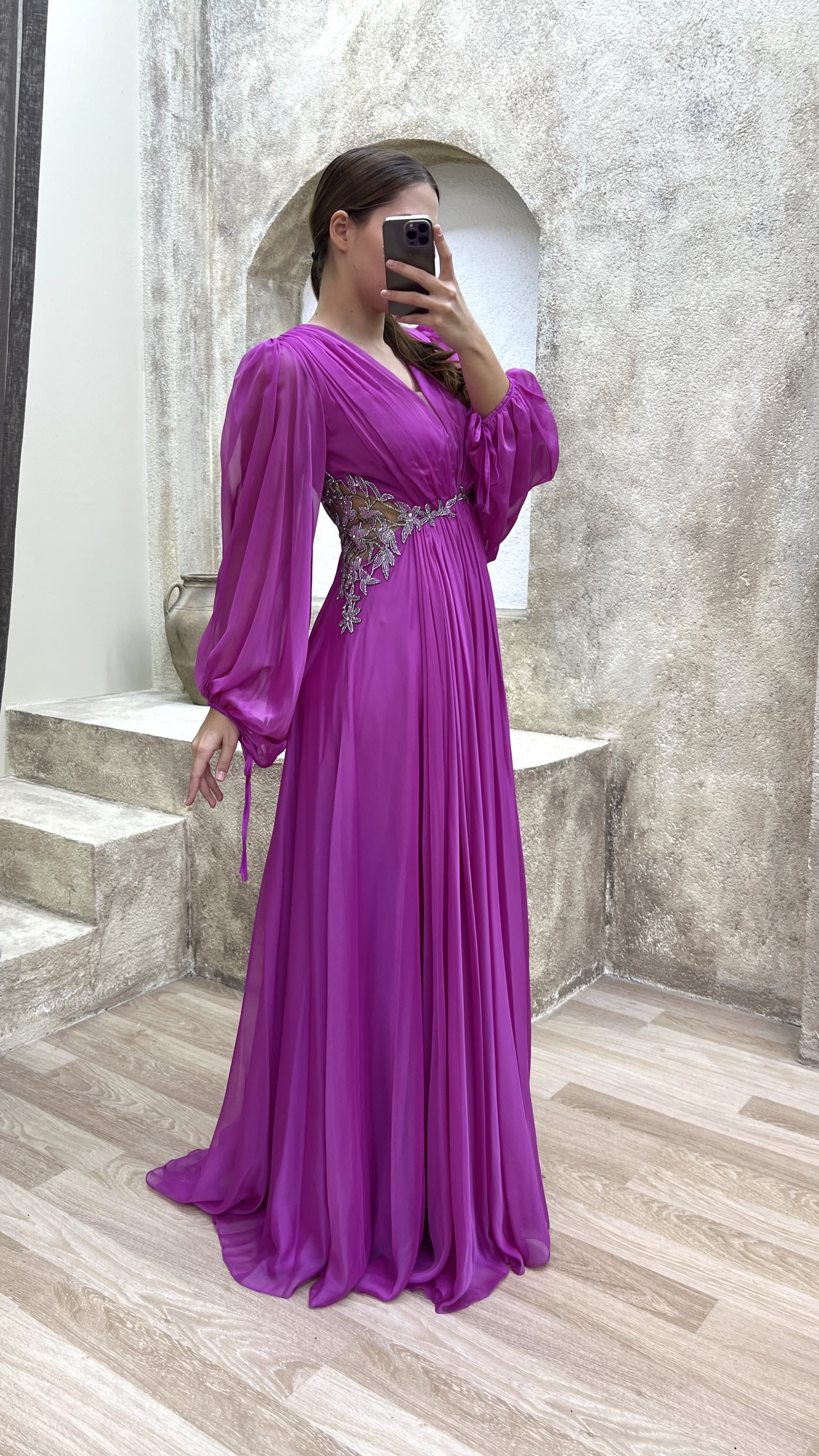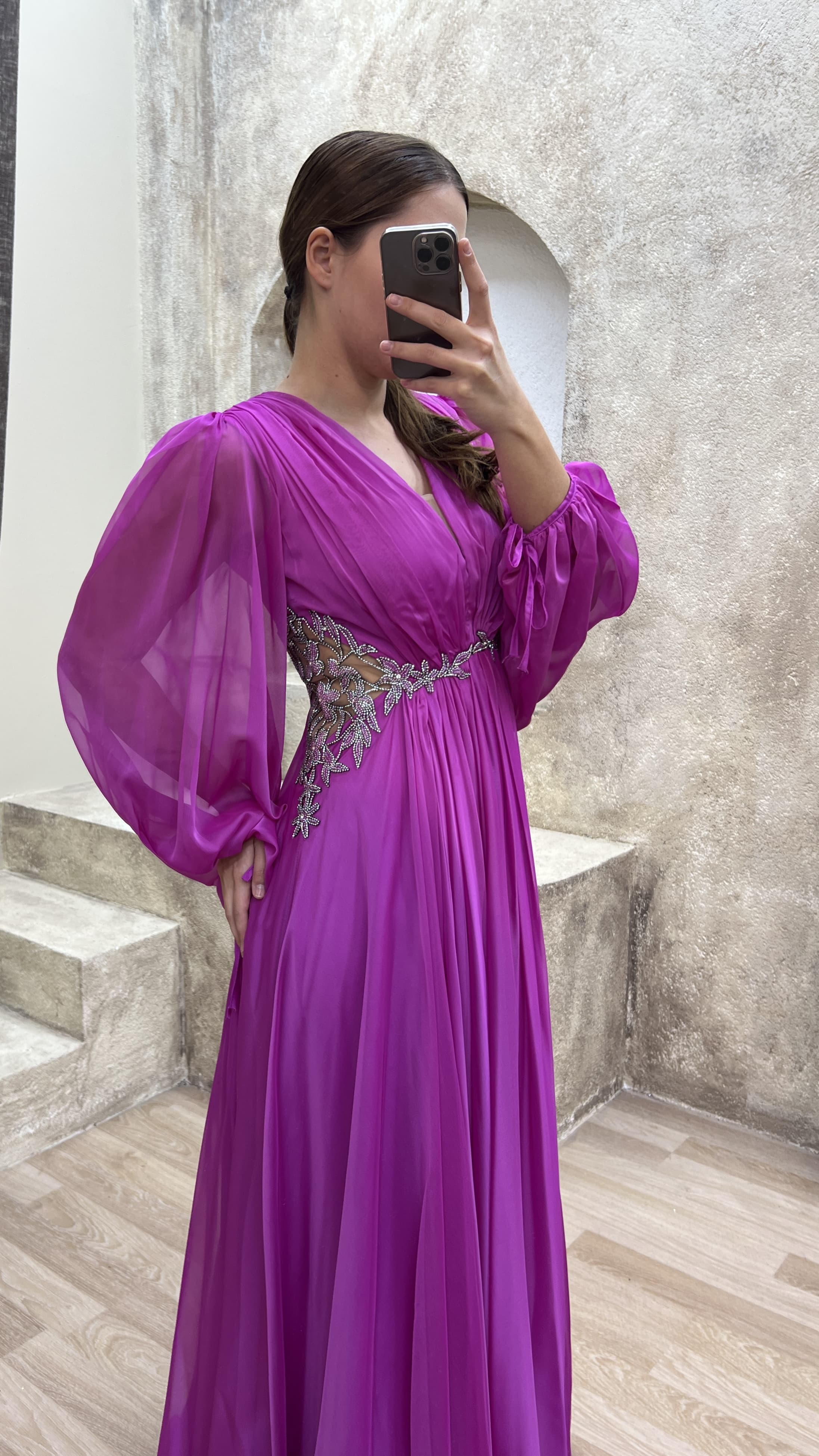 • Pembe Balon Kol Bel Detay İşlemeli Tasarım Şifon Büyük Beden Abiye Elbise