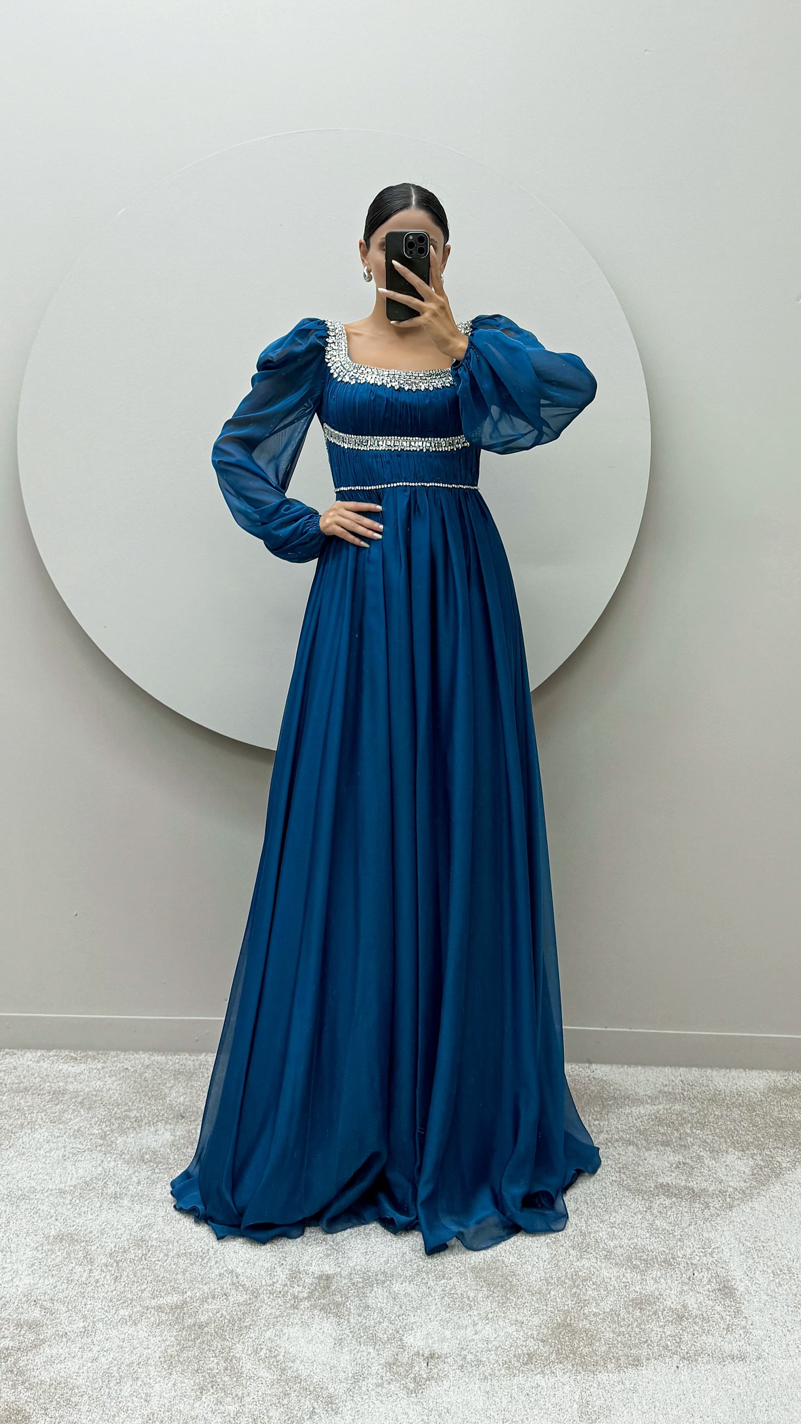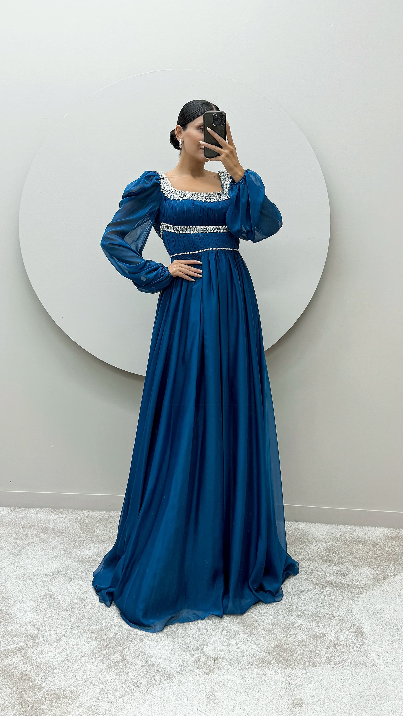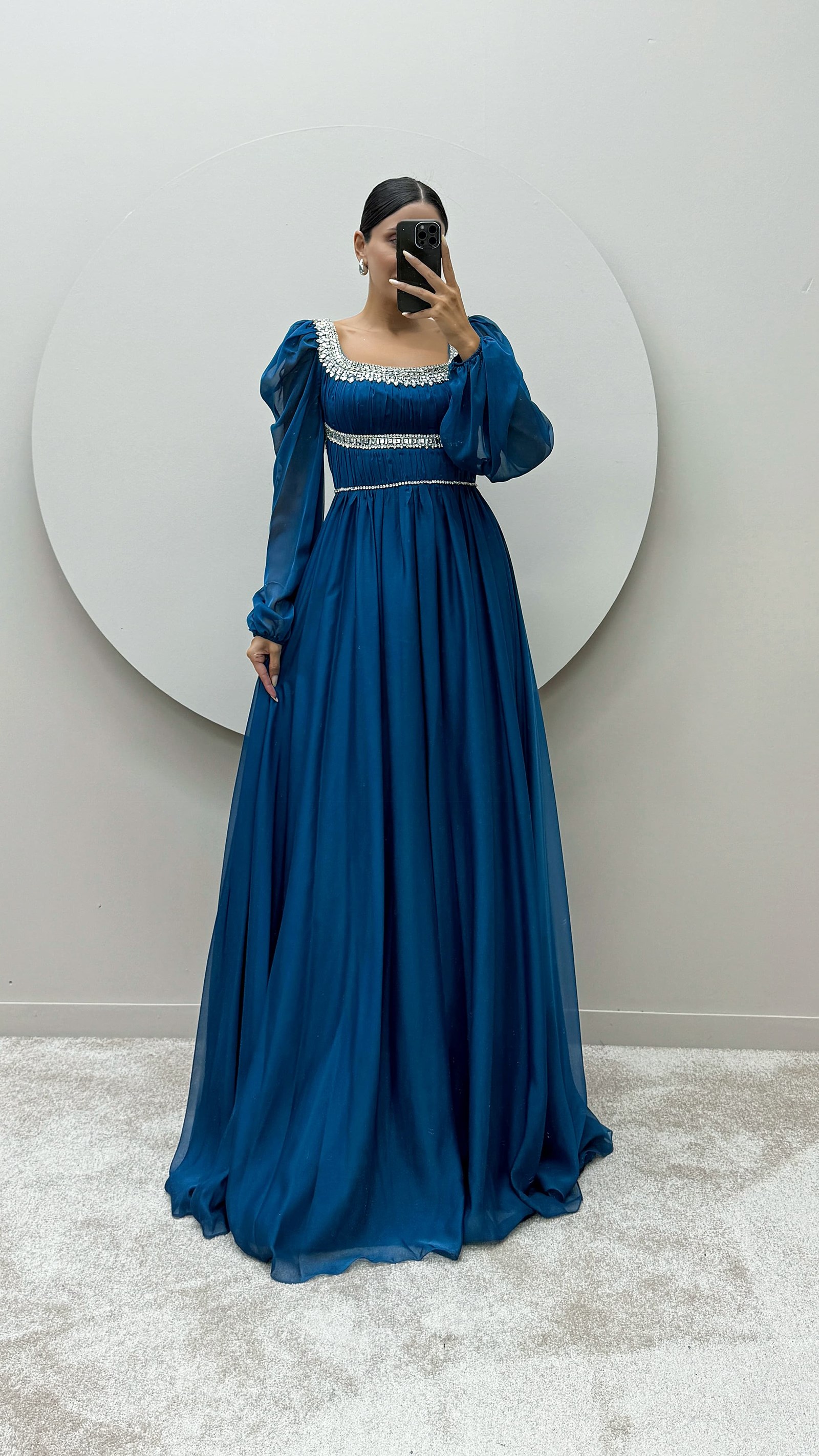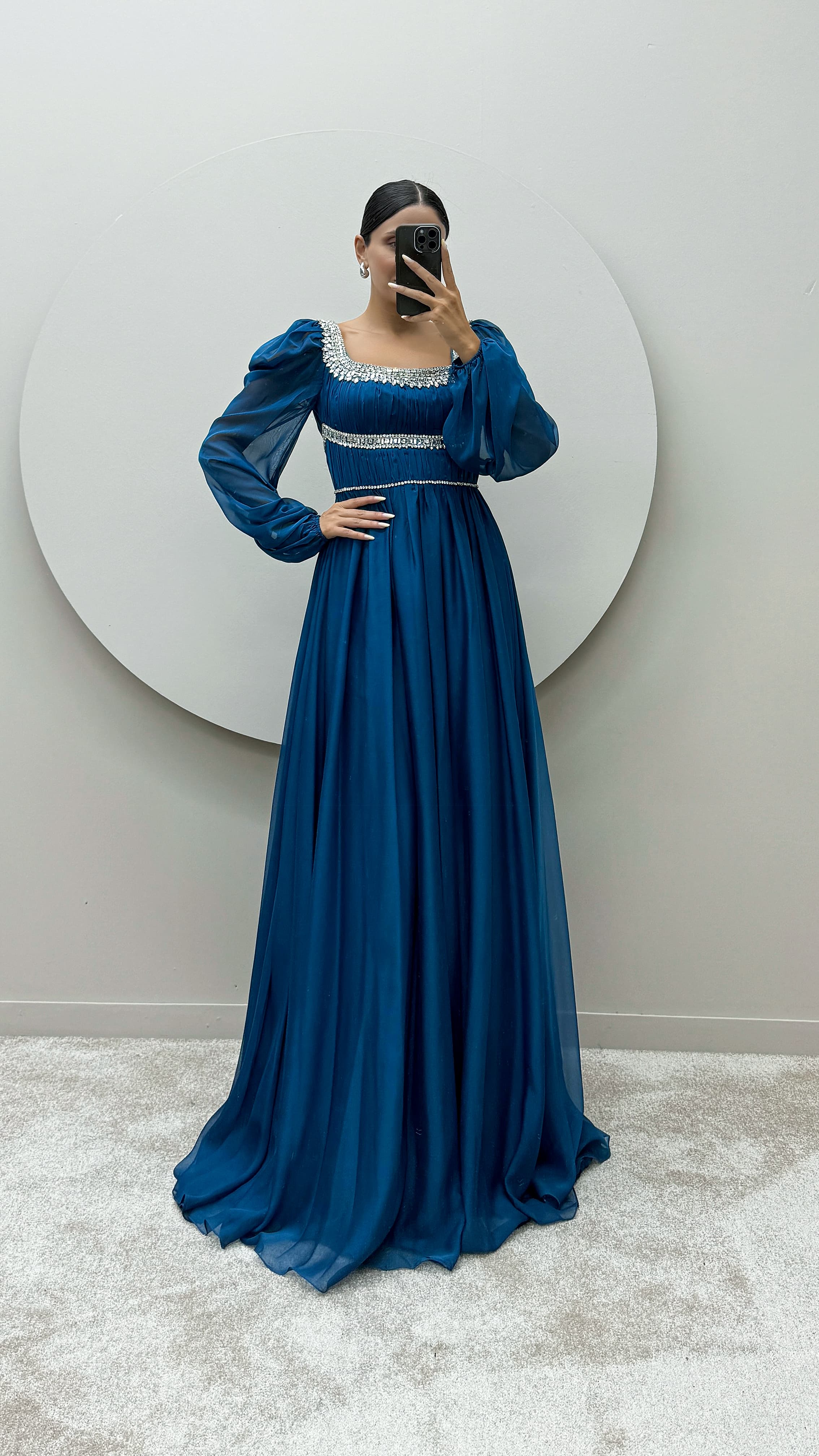 Petrol Göğsü Ve Beli Taş İşlemeli Balon Kol Tasarım Elbise