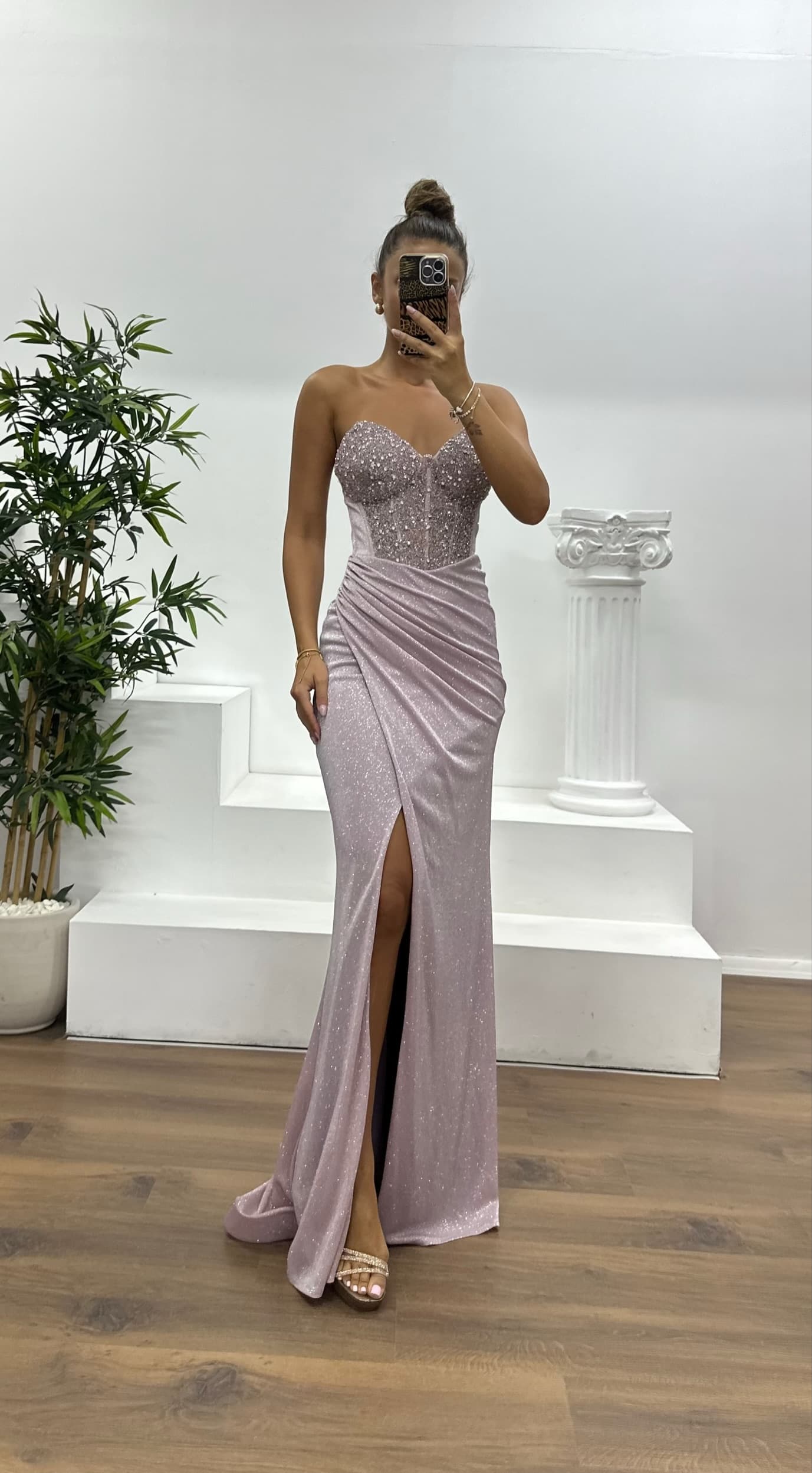 Embroidered Glitter Evening Dress The product fits sizes 36-42, with padded chest, lined, slit, cross-back strap, and zipper closure, designed as an embroidered evening dress. Product length: May vary between 170-175 cm. Fabric type: glittery