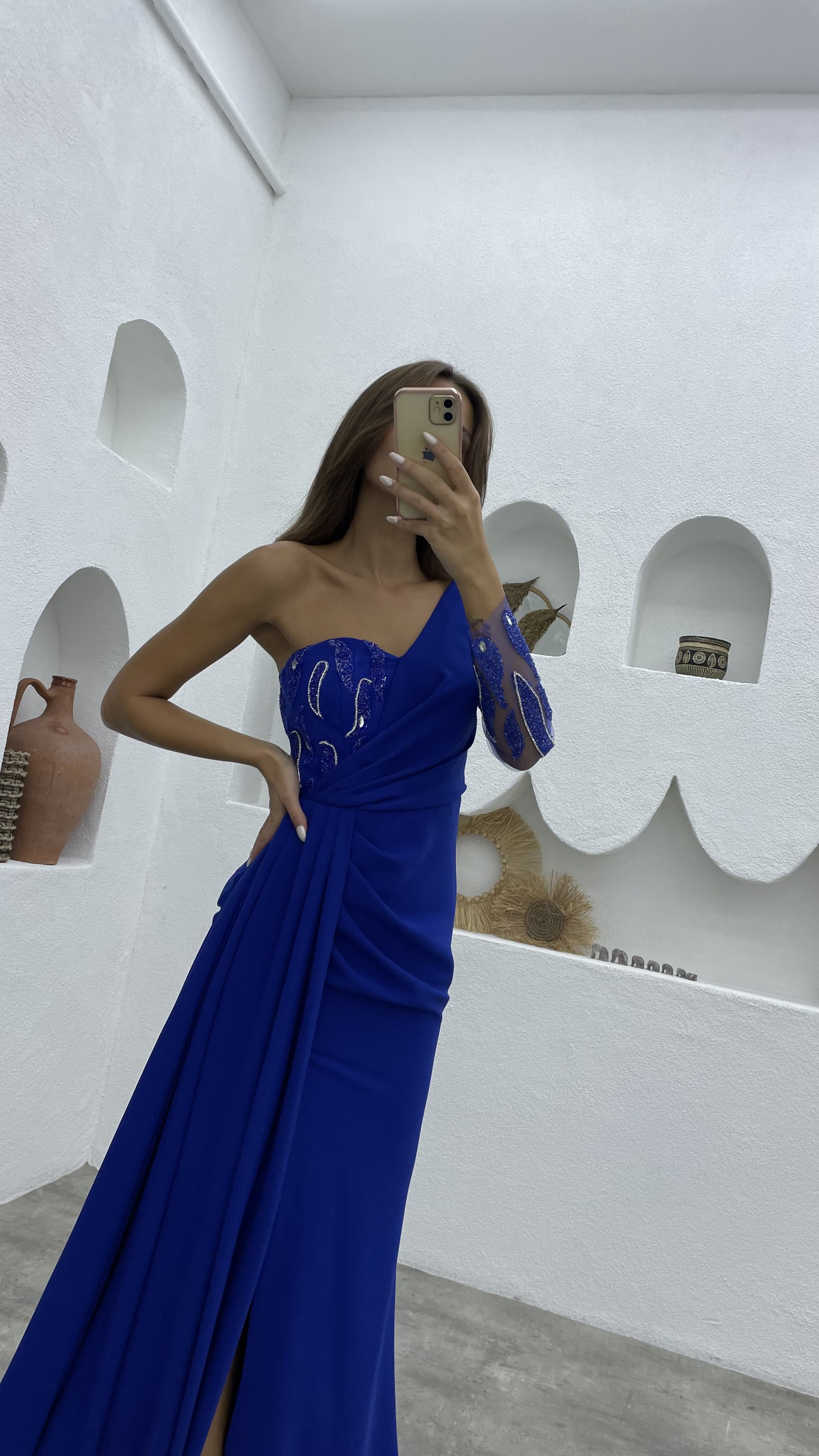• Saks Tek Kol İşlemeli Abiye Elbise