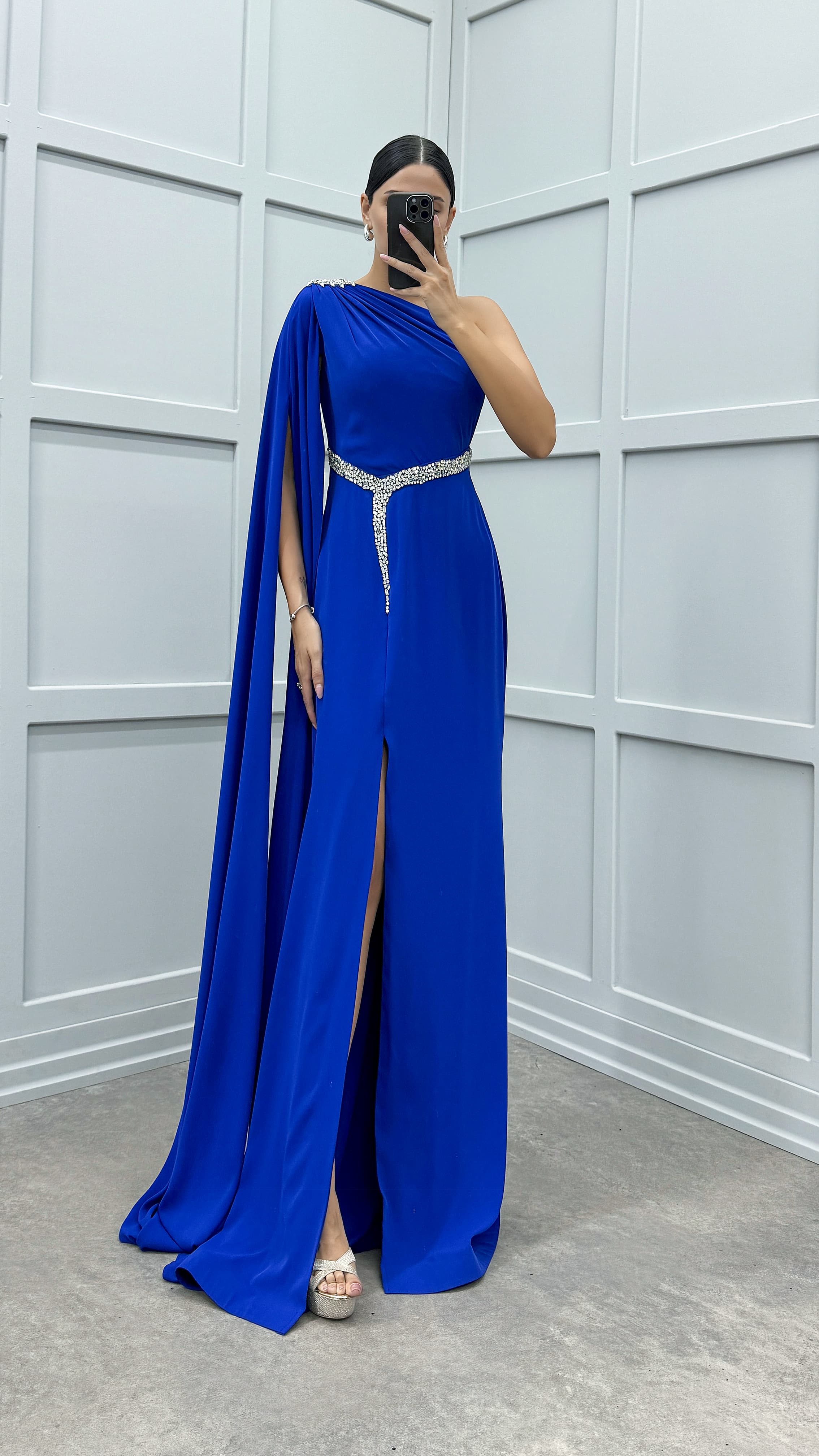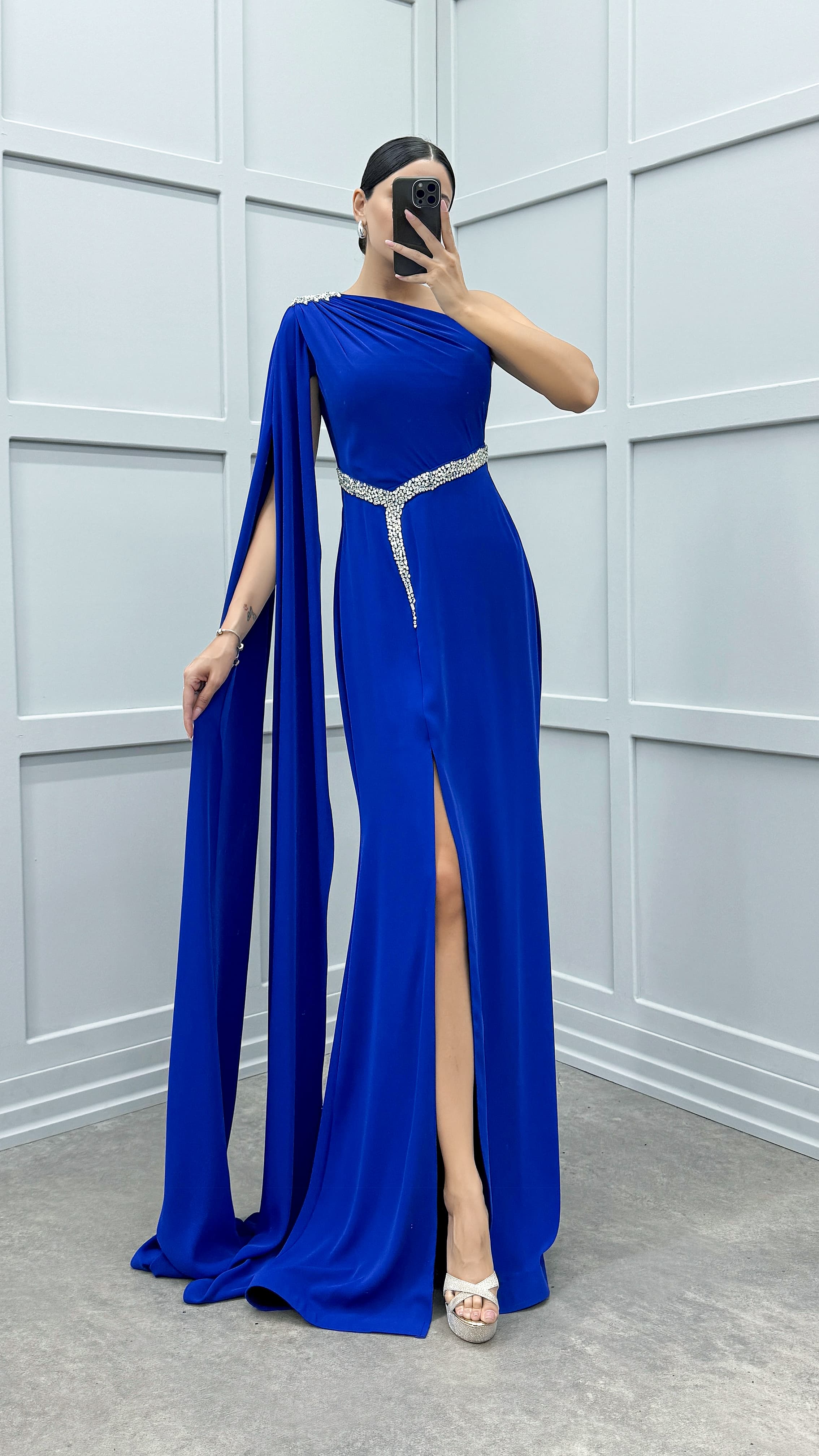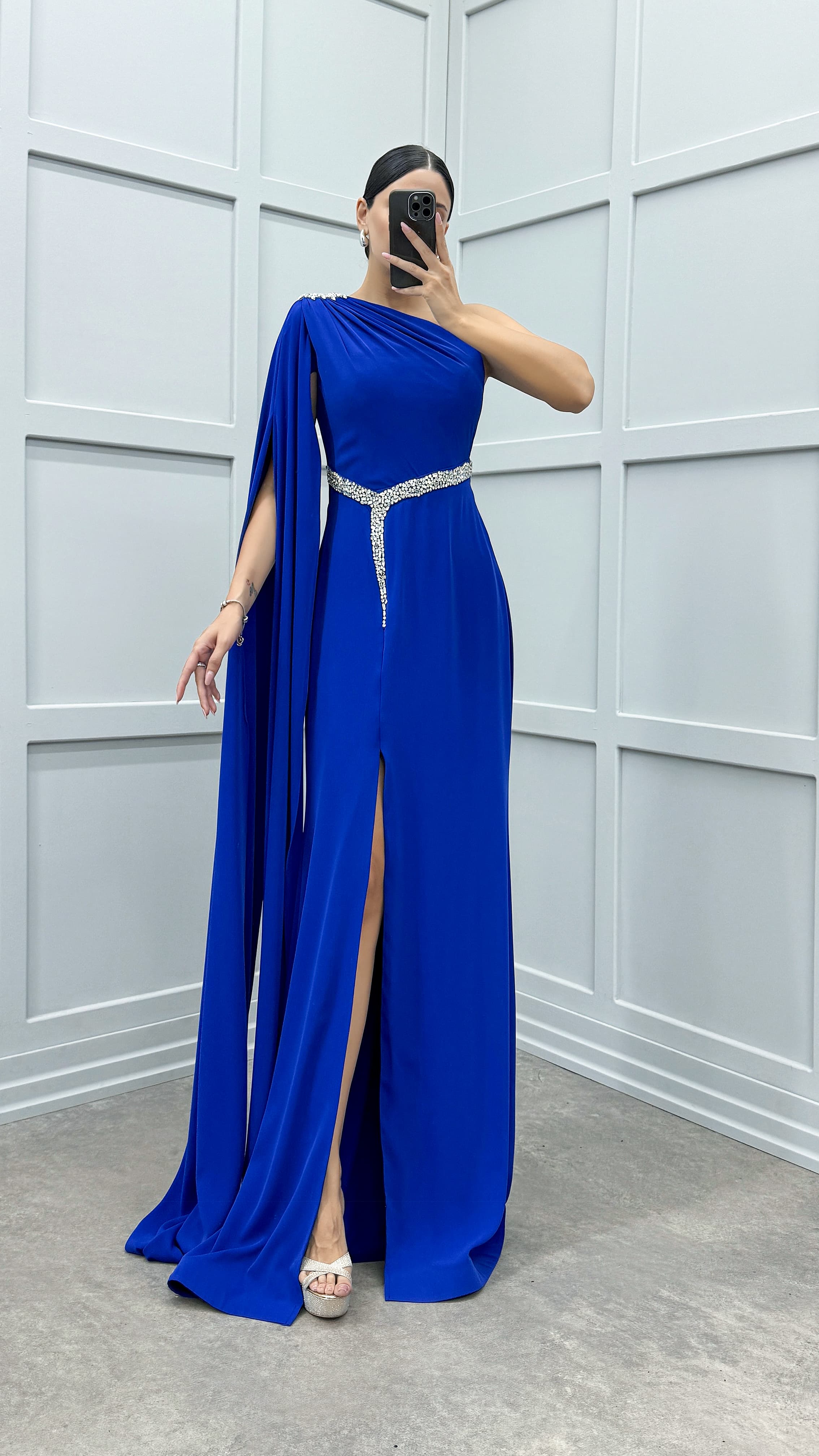 • Saks Tek Omuz Taş İşlemeli Abiye Elbise