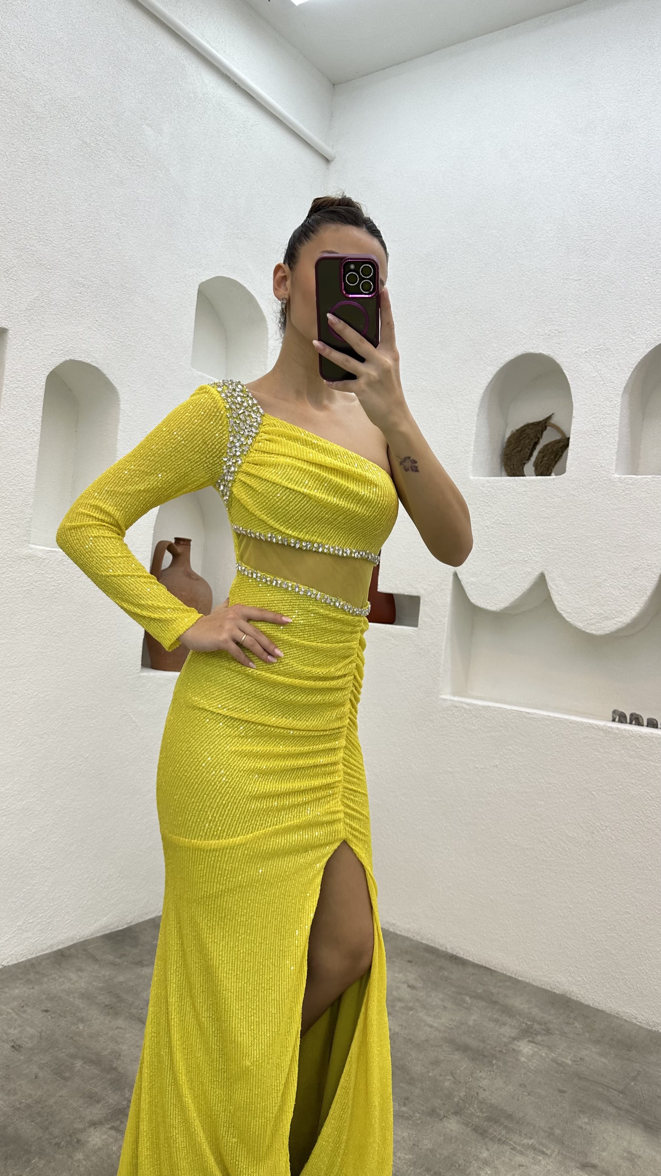 Yellow Embroidered Transparent Detail Sequined Evening Dress