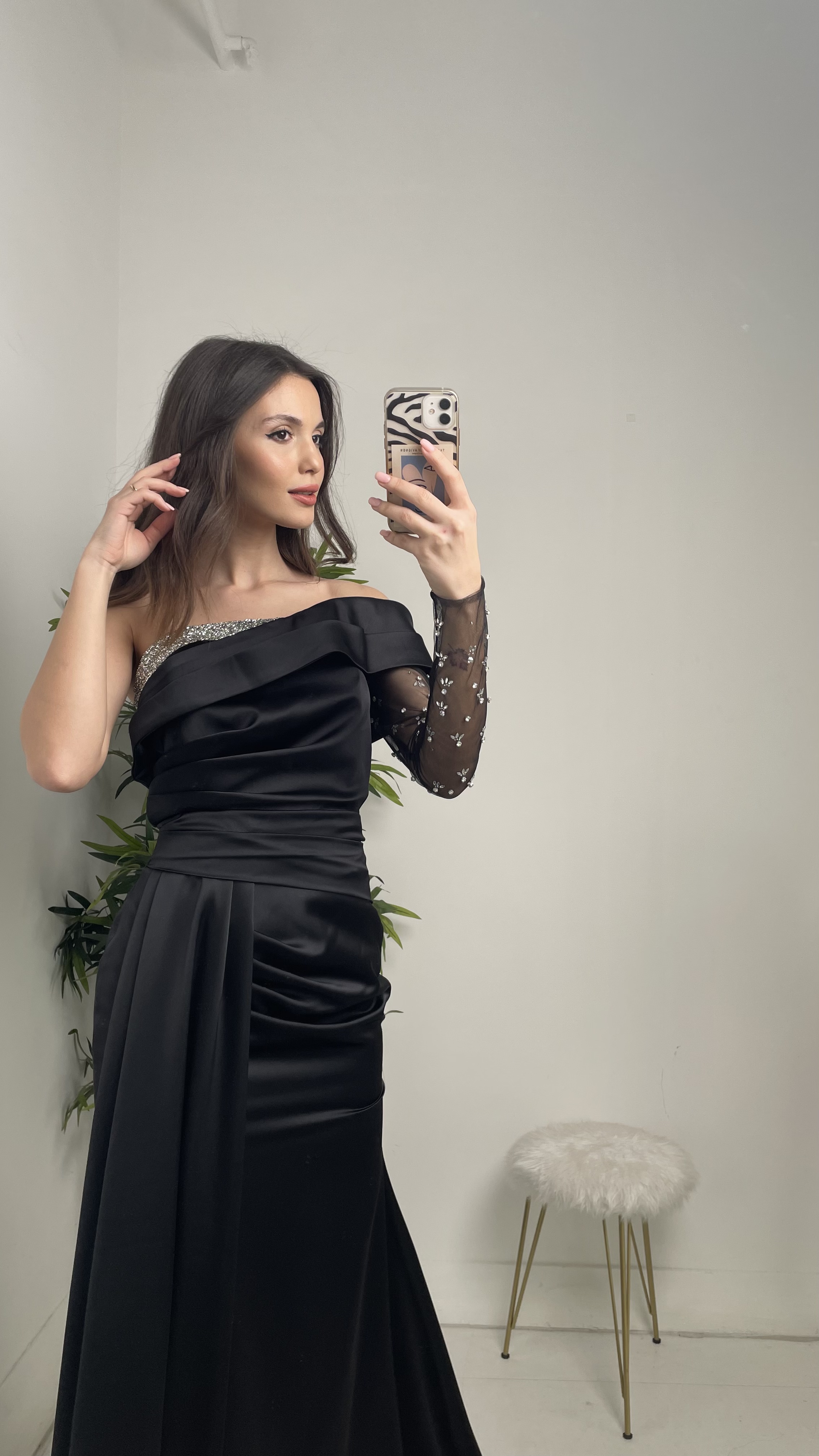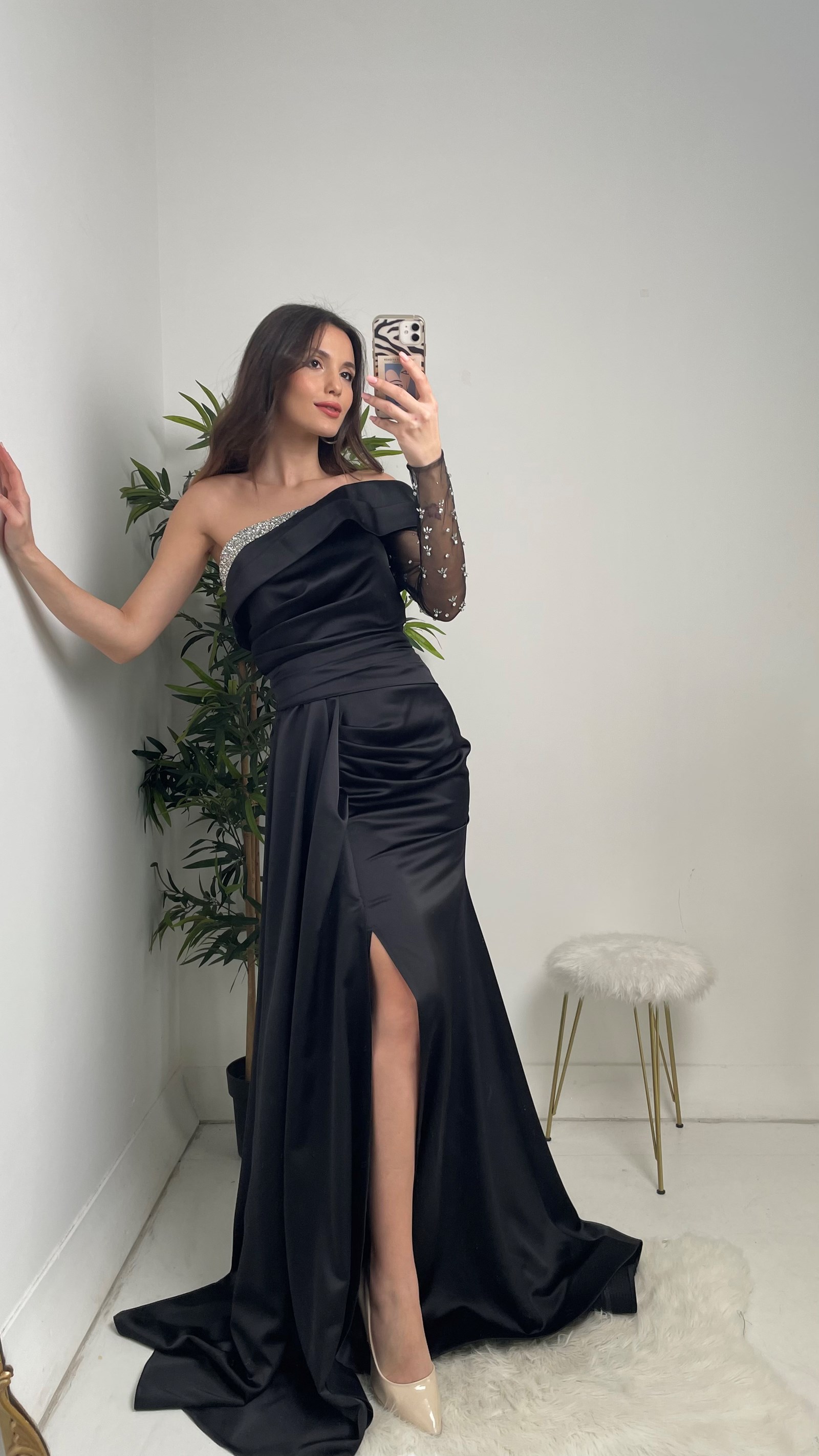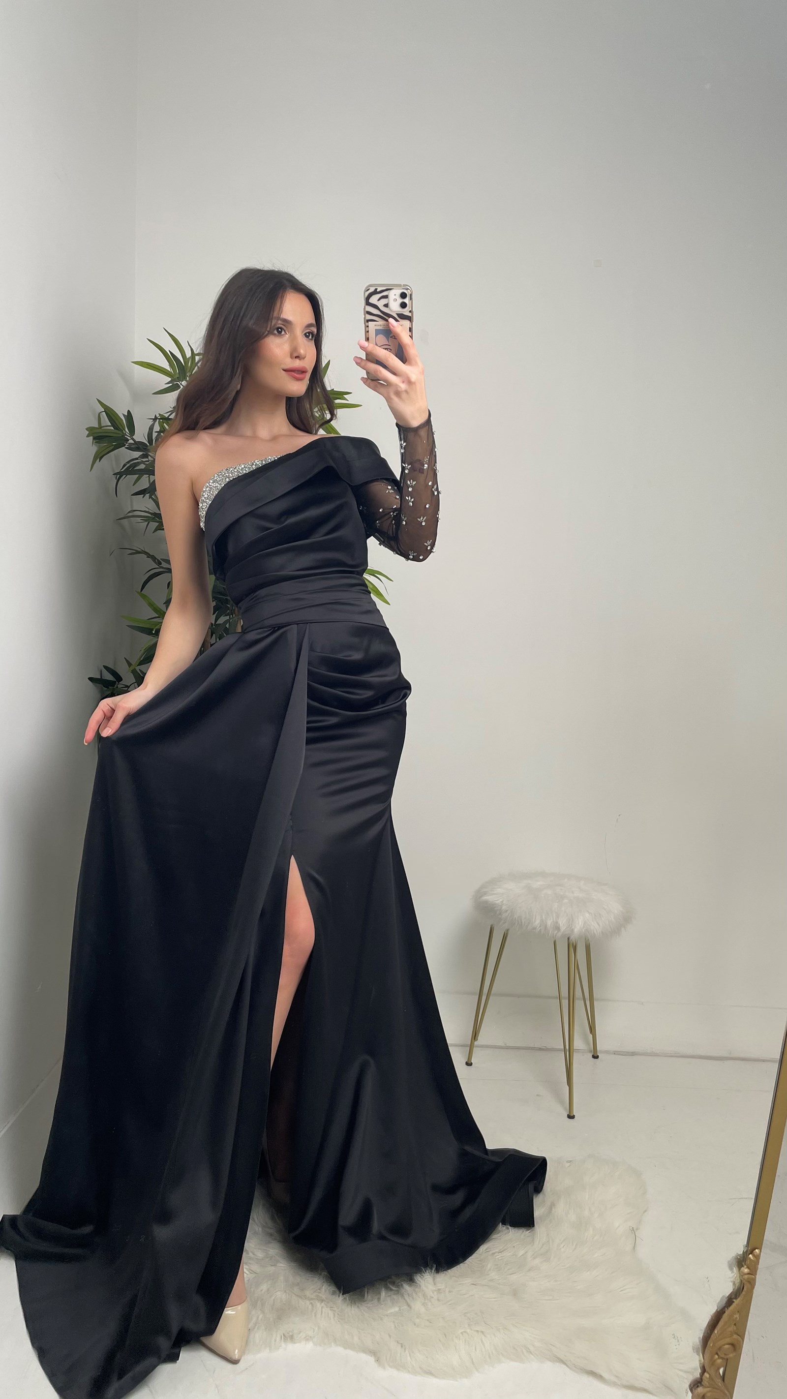 • Siyah Göğüsü Taşlı Tek Kol Saten Abiye Elbise