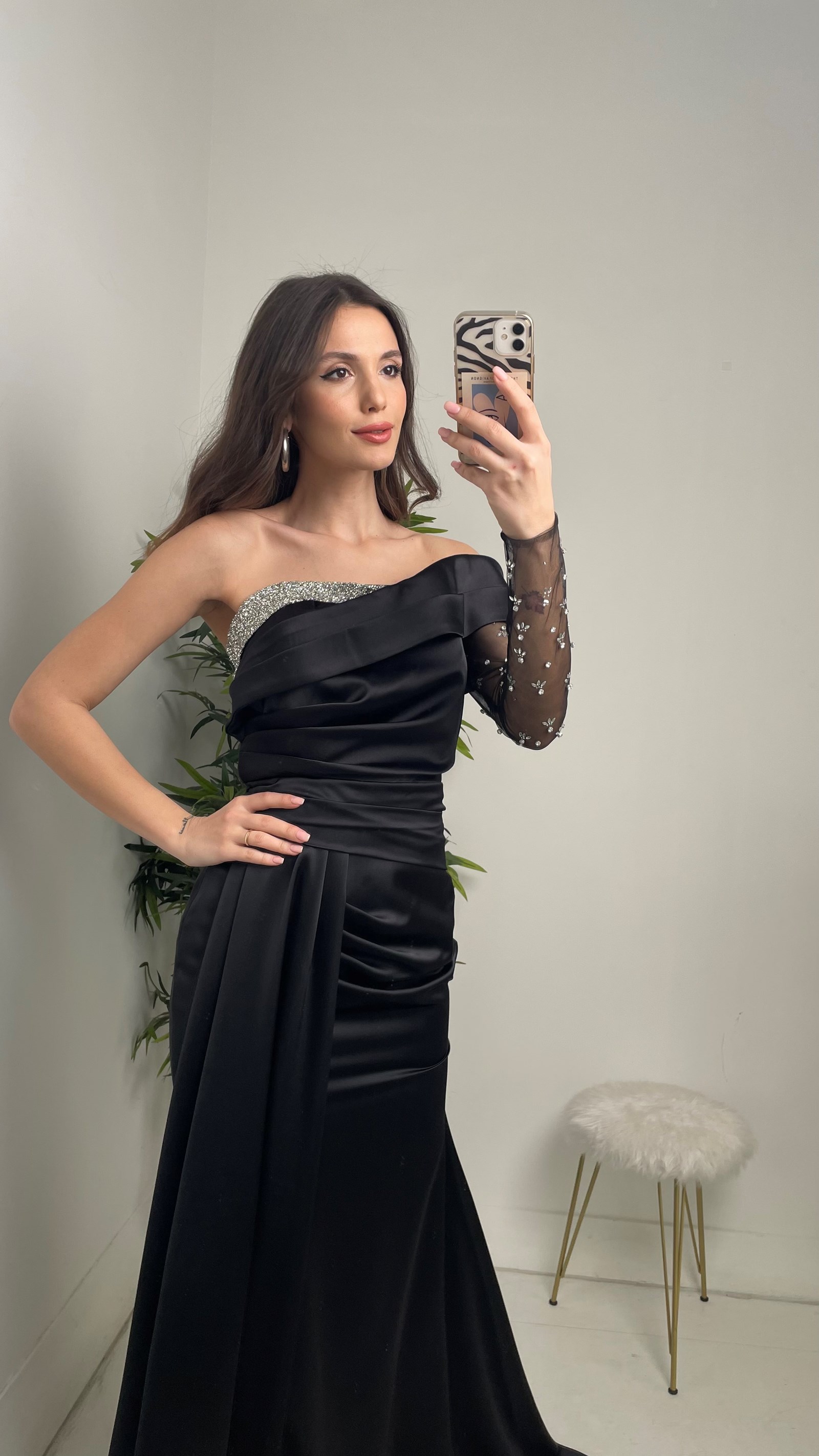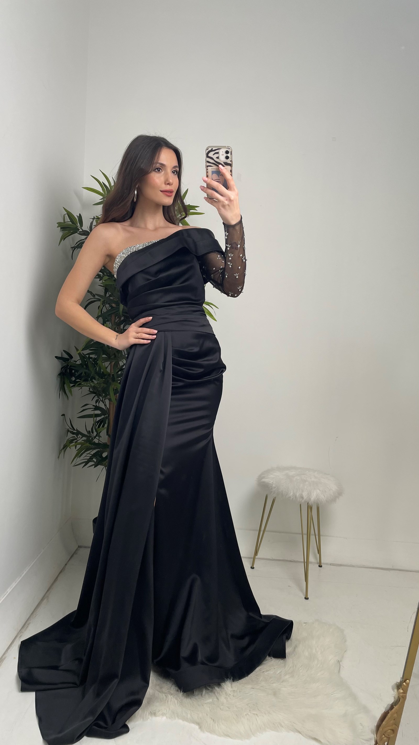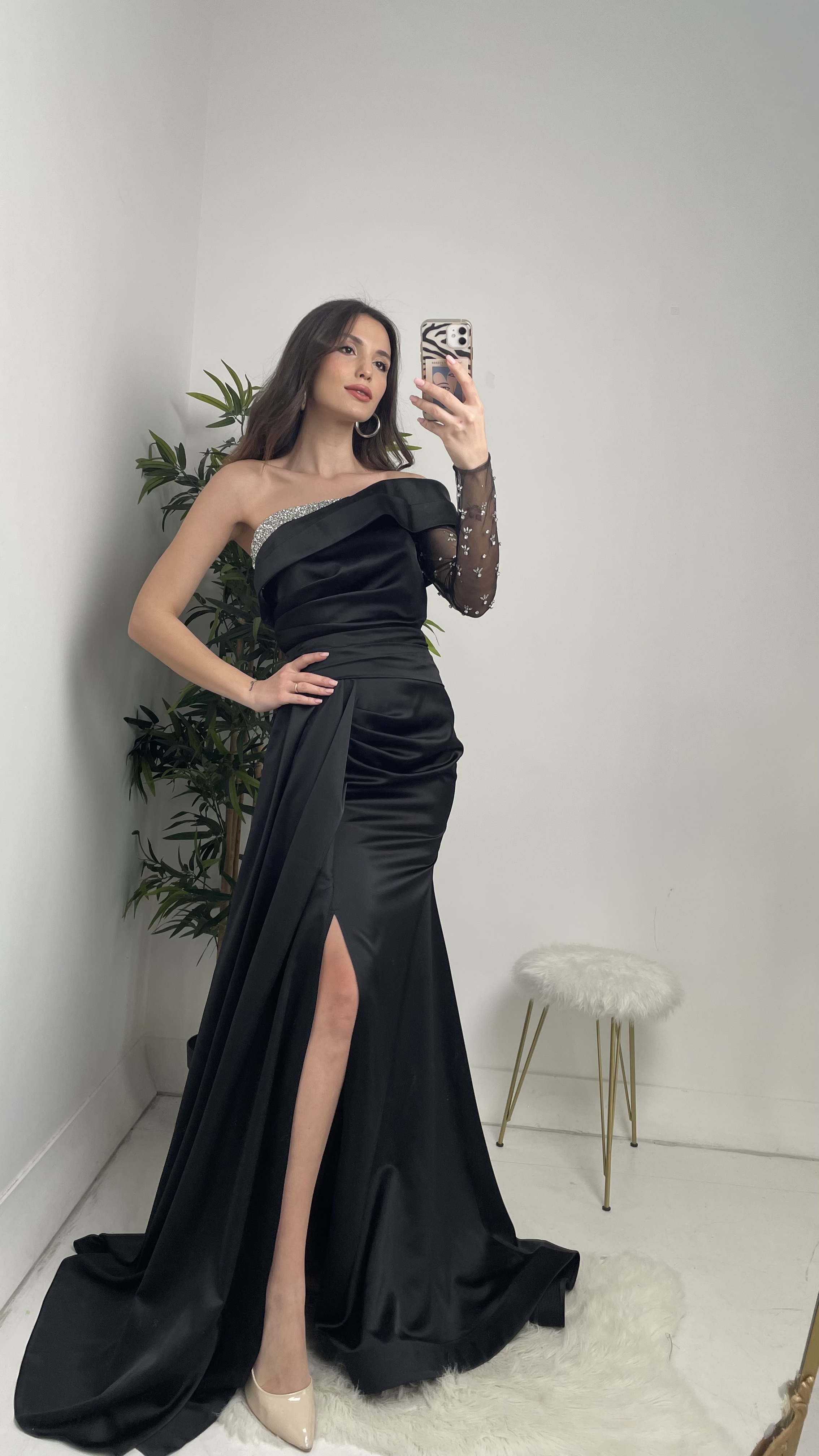5 RatingSiyah Göğüsü Taşlı Tek Kol Saten Abiye Elbise Ürün Yorumları
