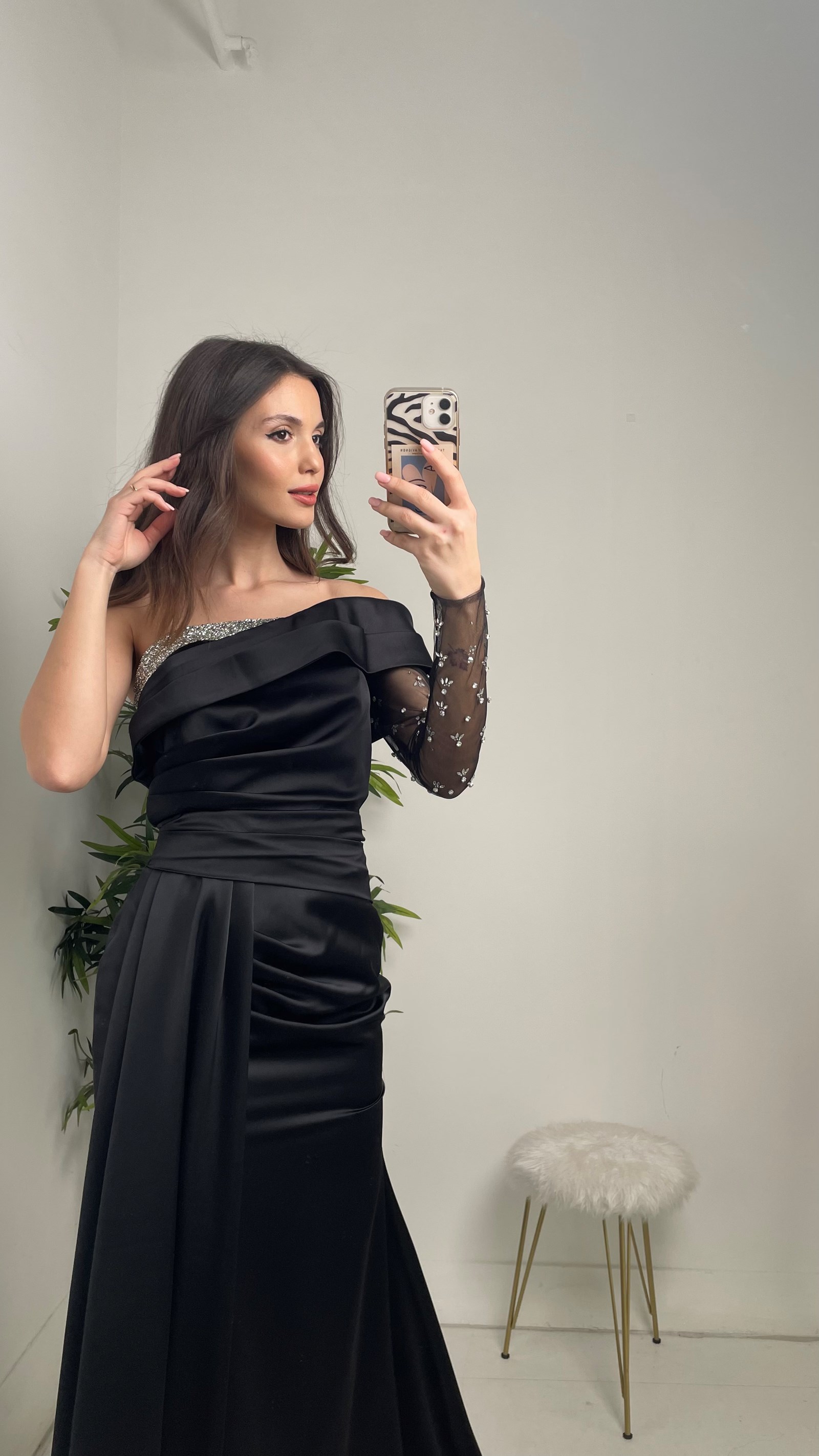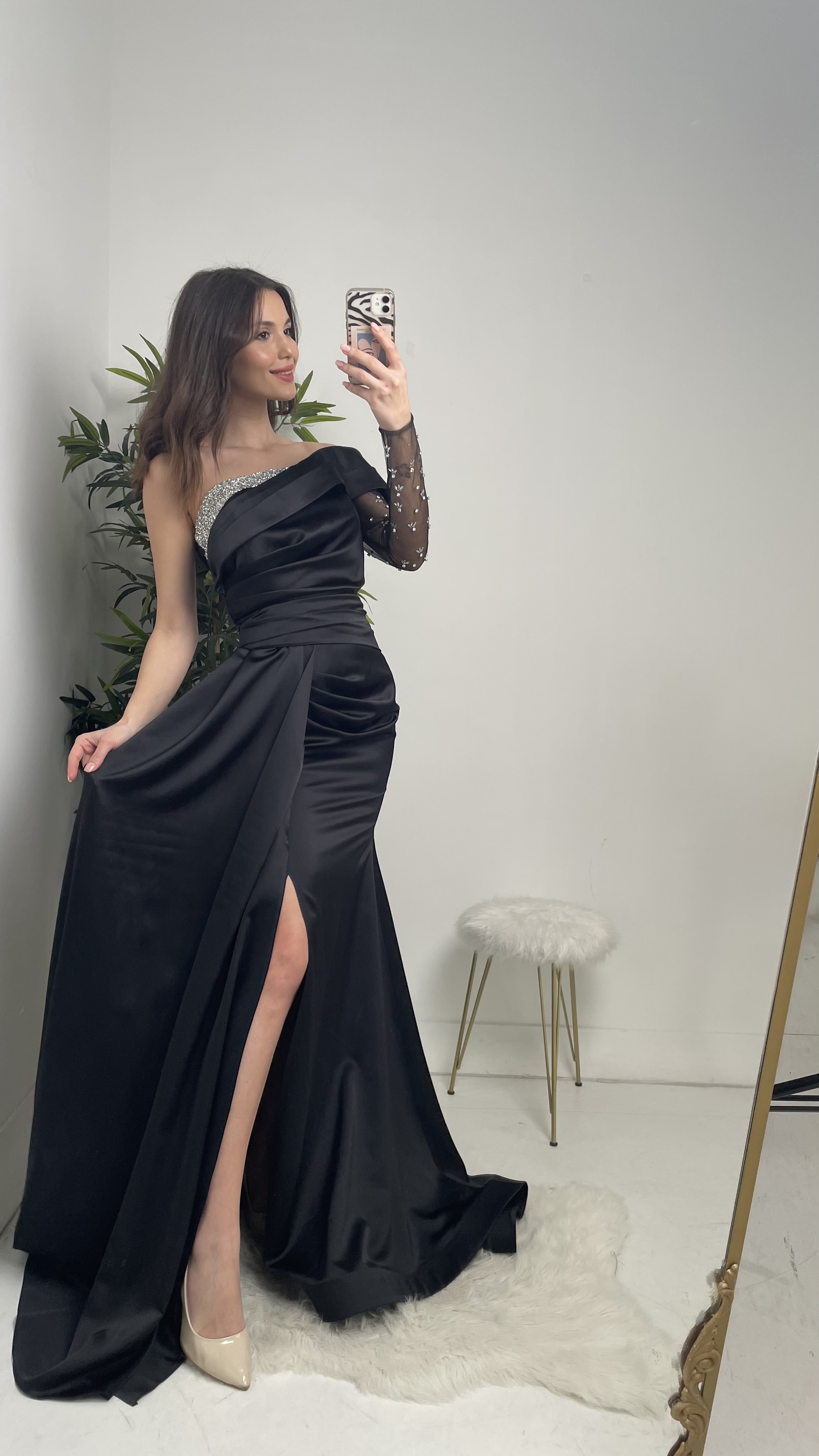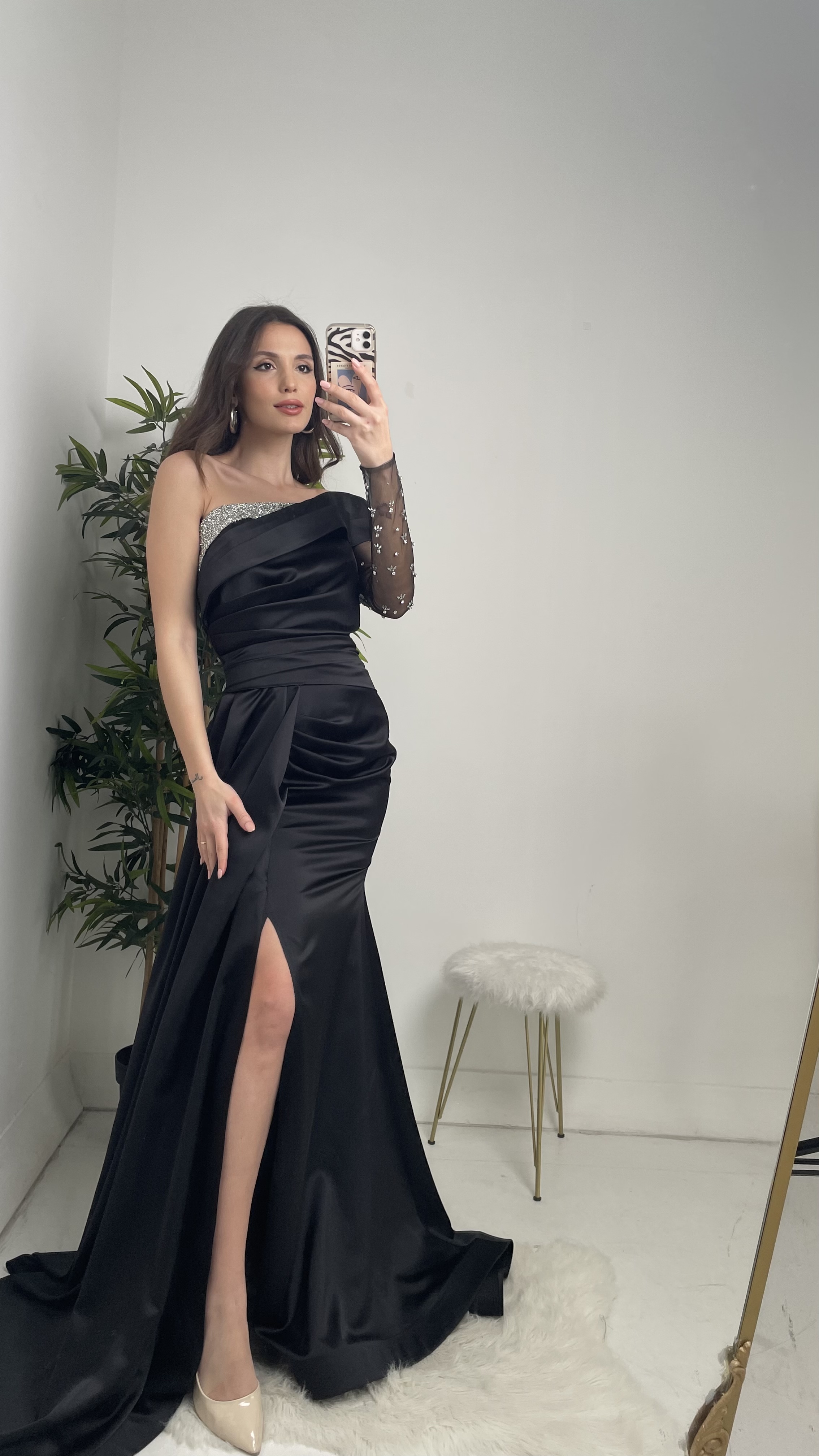 5 RatingSiyah Göğüsü Taşlı Tek Kol Saten Abiye Elbise Ürün Yorumları