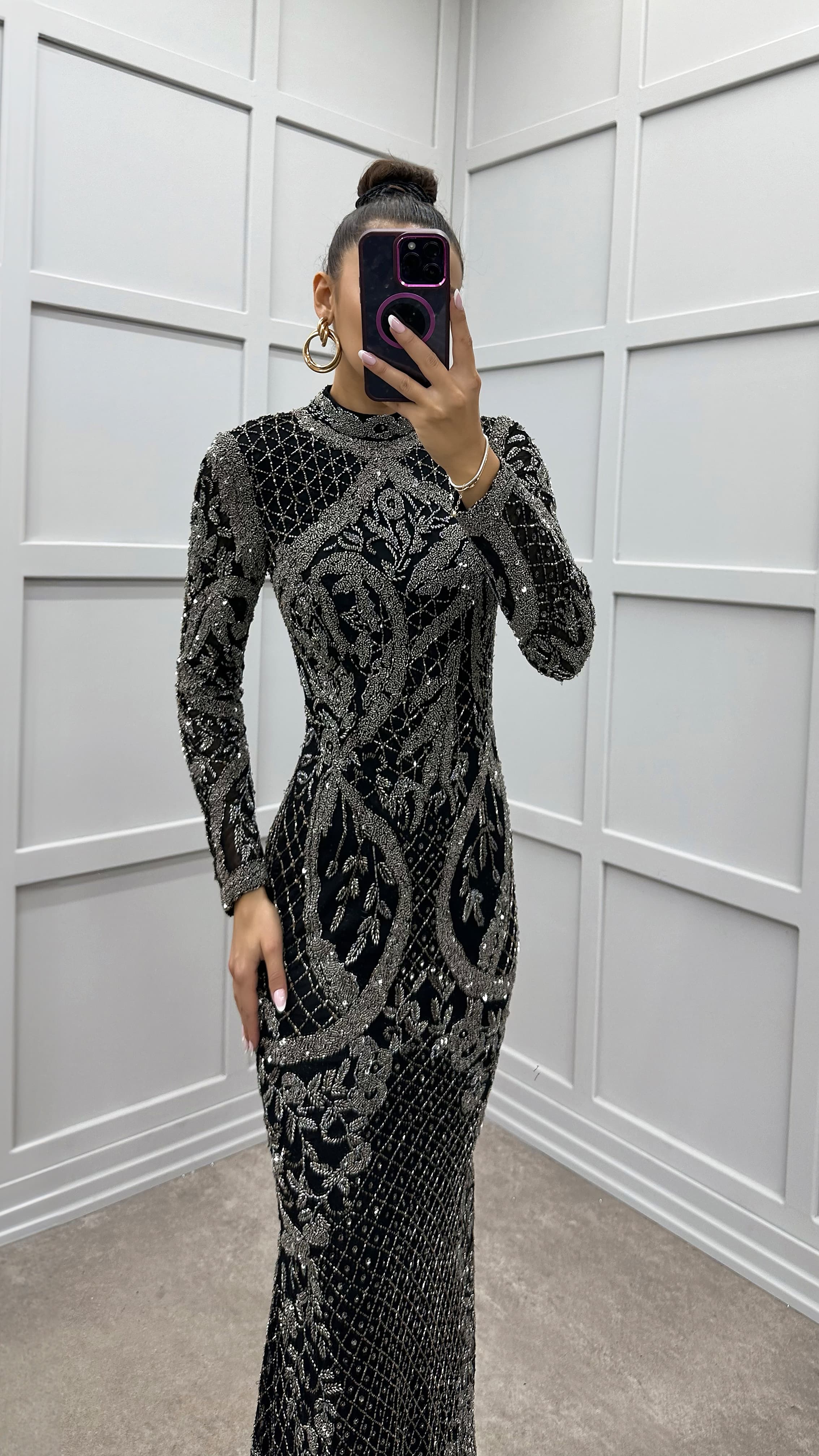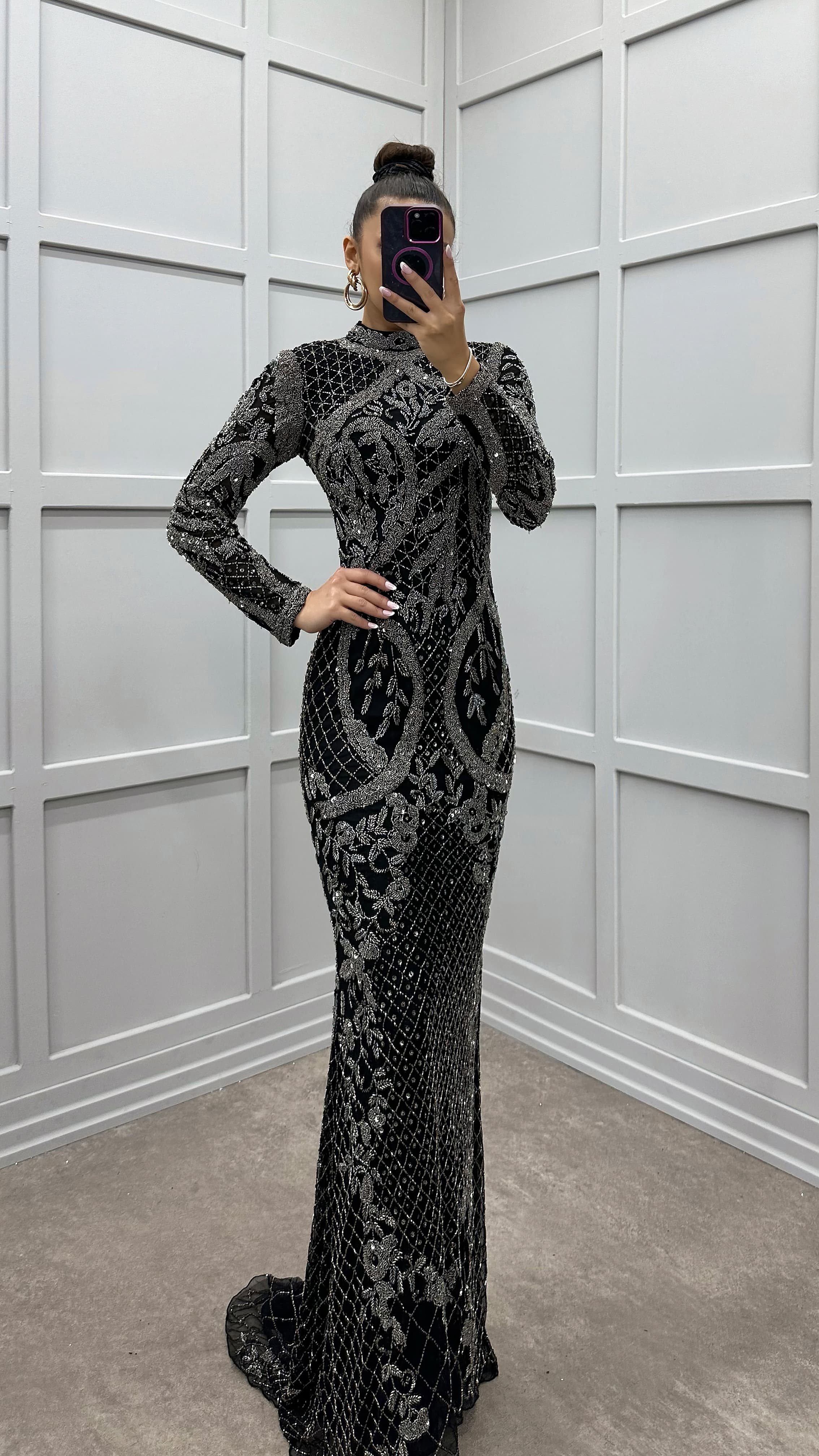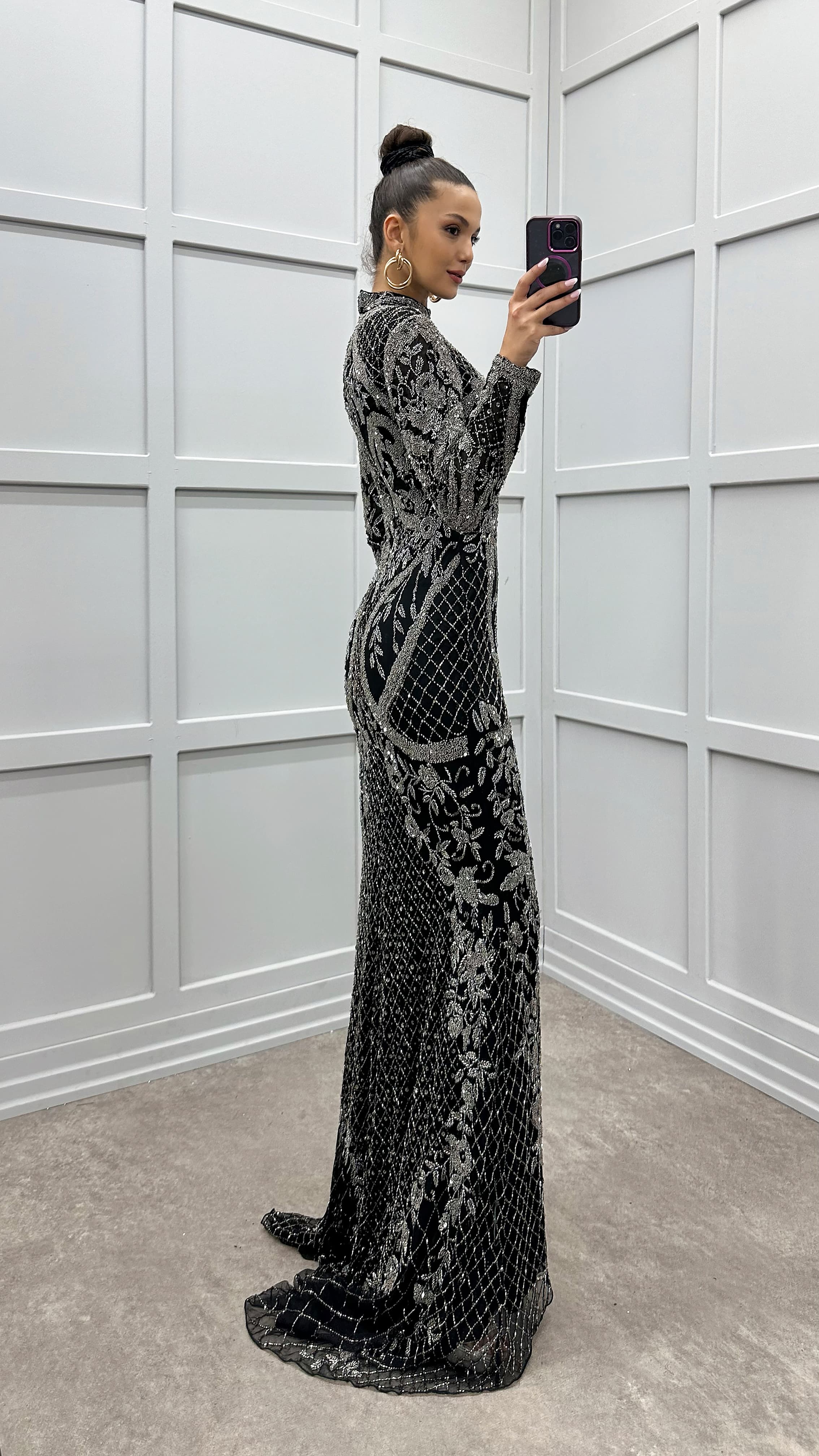 • Antrasit İşleme Detay Özel Tasarım Abiye Elbise