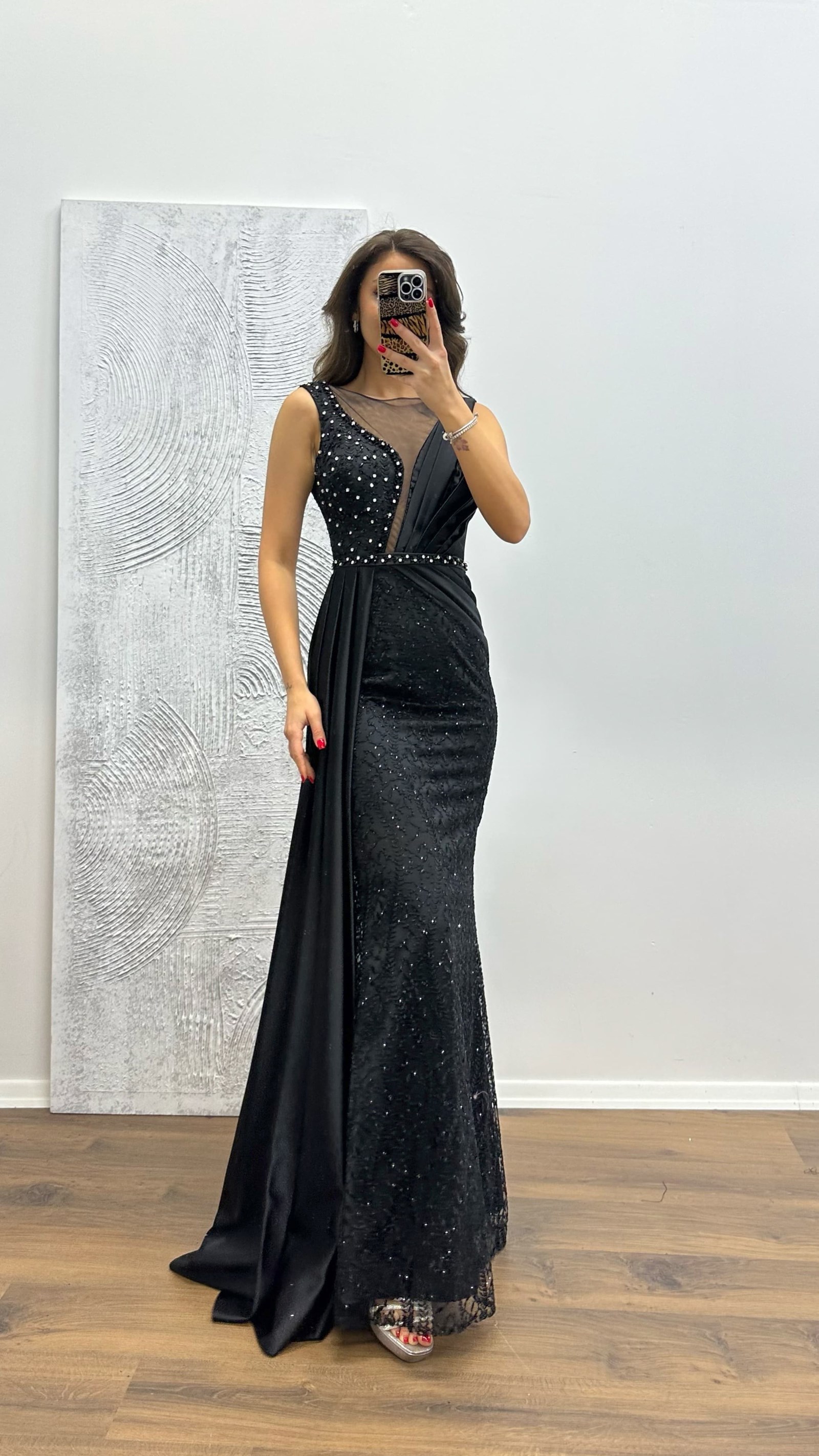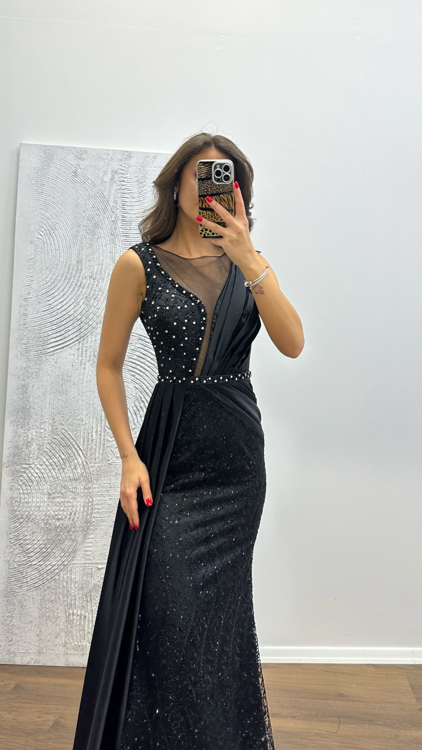 • Siyah İşlemeli Drapeli Saten Abiye Elbise