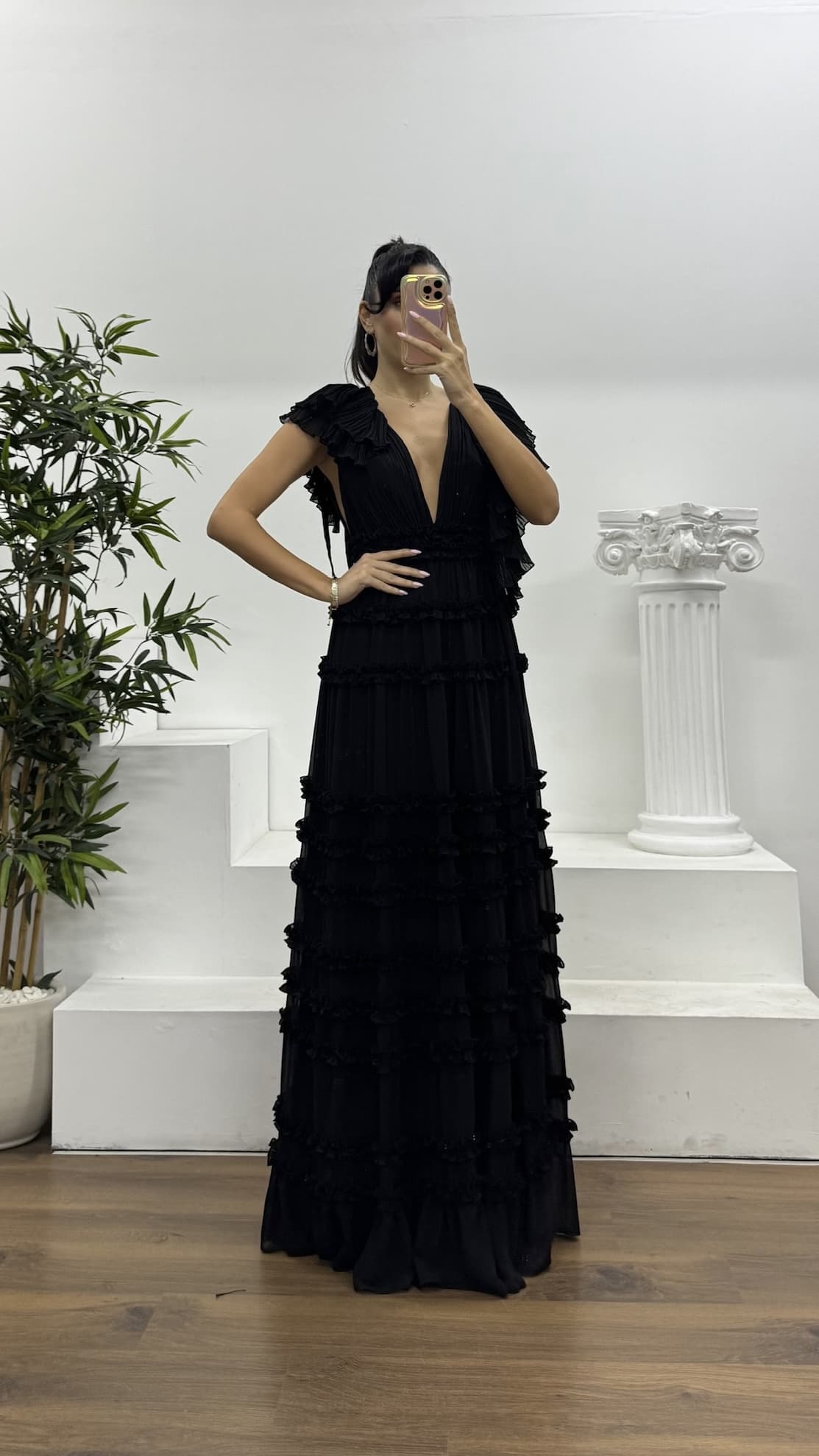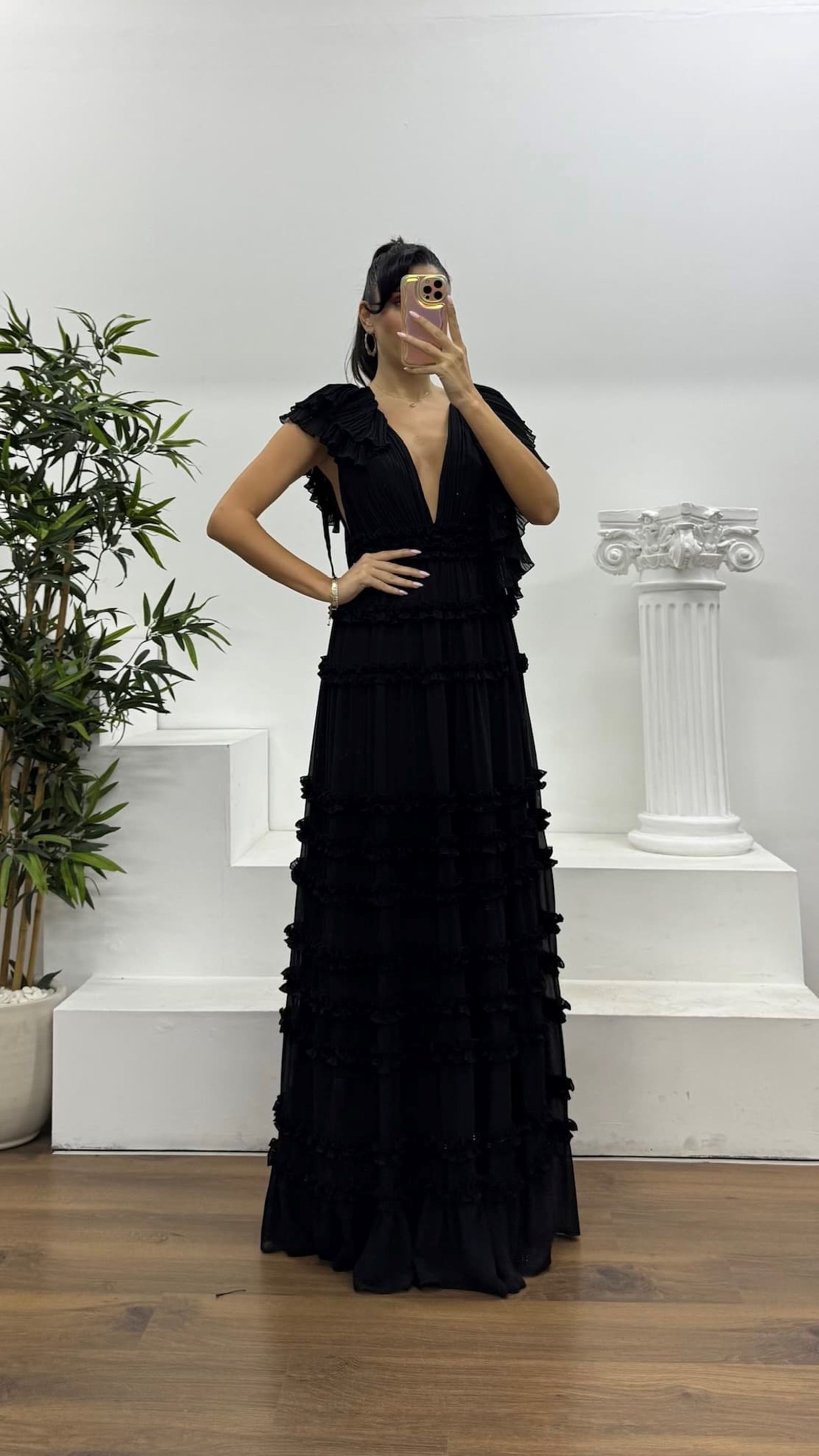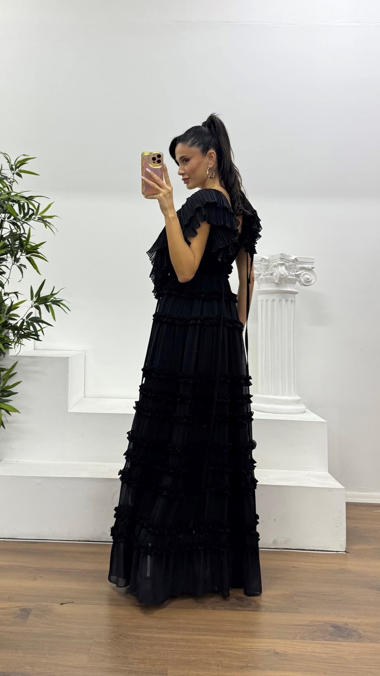 • Siyah Kat Kat Fırfırlı Özel Tasarım Şifon Abiye Elbise
