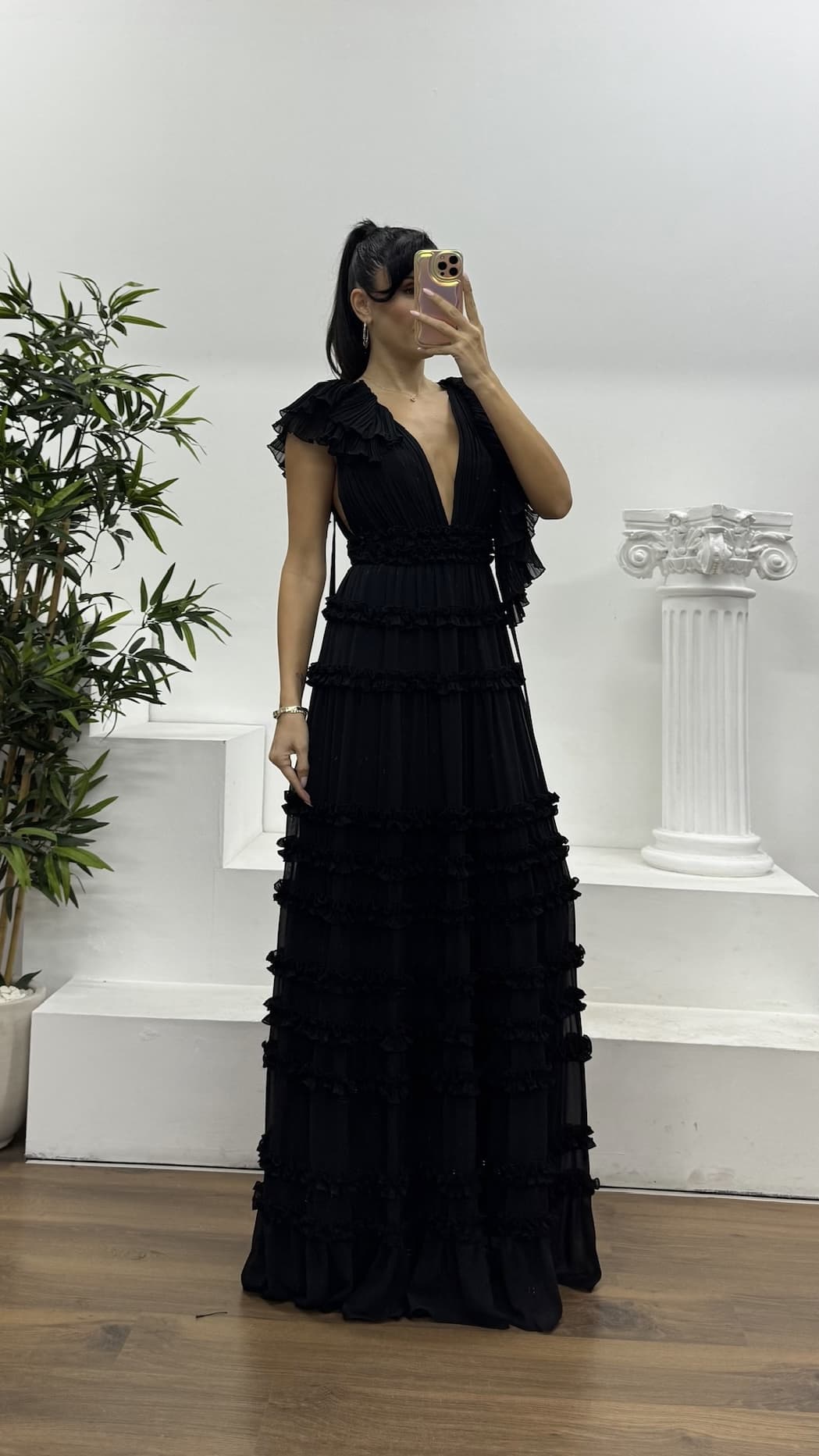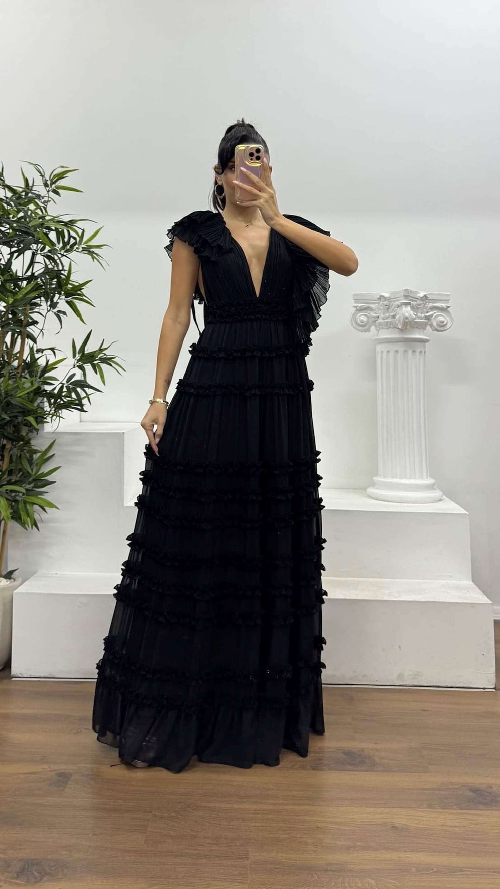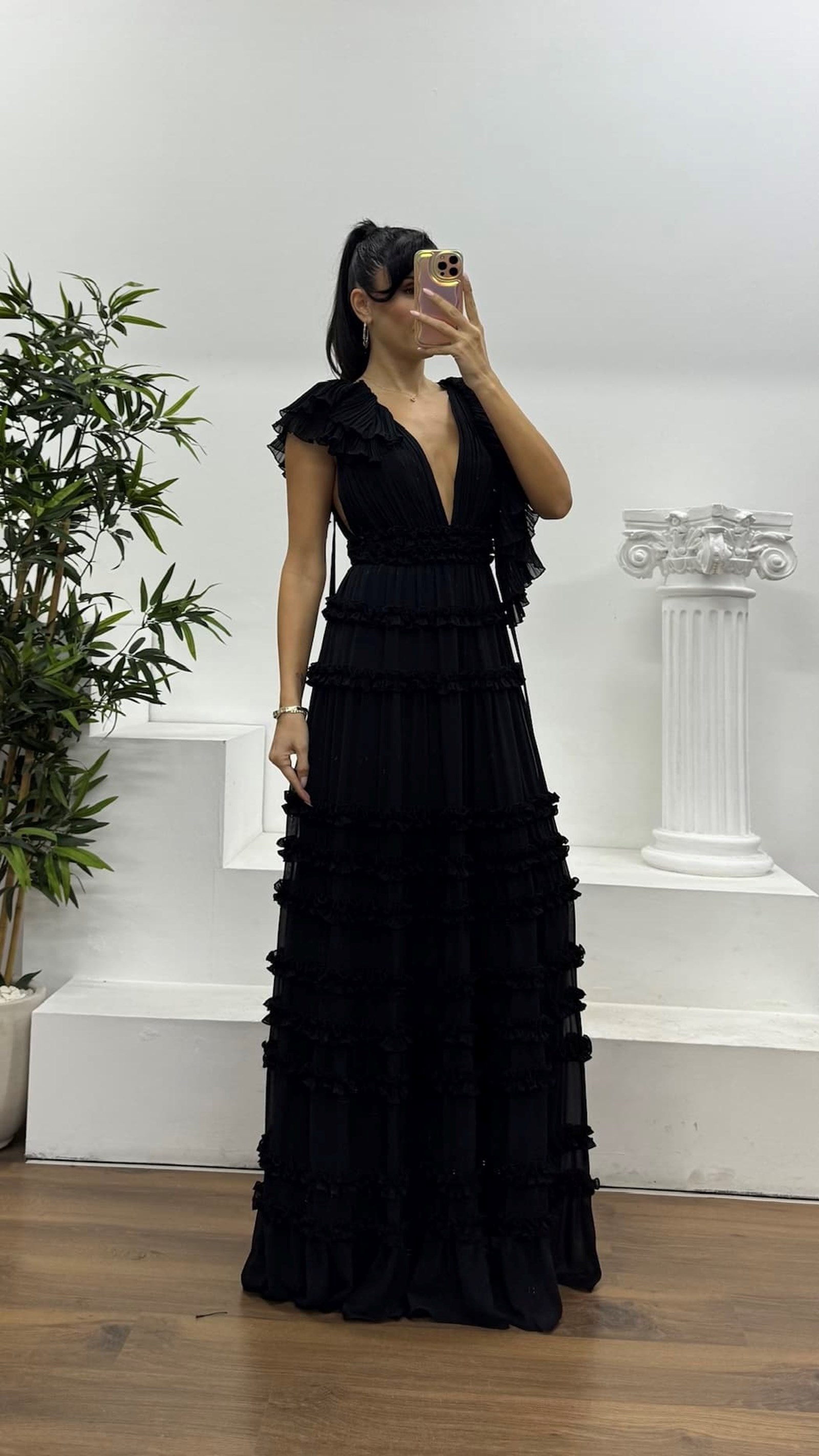 • Siyah Kat Kat Fırfırlı Özel Tasarım Şifon Abiye Elbise